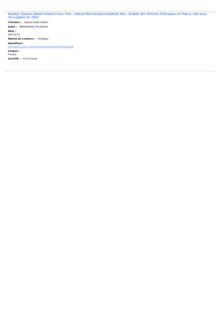BiuletynZwiazkuKobietPolskichSous-Titre:imieniaMariiKonopnickiejAutretitre:BulletindesFemmesPolonaisesenFrancecréesous l'occupationen1943 Créateur: ZwiazekKobietP olskich Sujet: IMMIGRATION_P OLONAISE Date: 1947-01-01 Natureducontenu: P ériodique Identifiant: http://argonnaute.u-paris10.fr/ark:/naan/a011403267922RbpgdI Langue: Français Localité: P aris(France)
