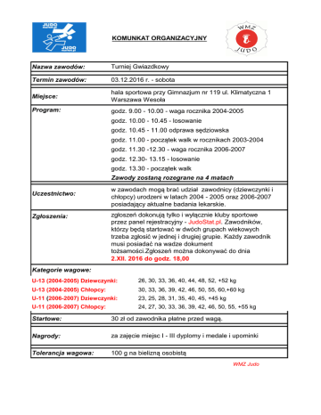 KOMUNKAT ORGANIZACYJNY Nazwa zawodów: Turniej Gwiazdkowy Termin zawodów: 03.12.2016 r. - sobota Miejsce: hala sportowa przy Gimnazjum nr 119 ul. Klimatyczna 1 Warszawa Wesoła Program: godz. 9.00 - 10.00 - waga rocznika 2004-2005 godz. 10.00 - 10.45 - losowanie godz. 10.45 - 11.00 odprawa sędziowska godz. 11.00 - początek walk w rocznikach 2003-2004 godz. 11.30 -12.30 - waga rocznika 2006-2007 godz. 12.30- 13.15 - losowanie godz. 13.30 - początek walk Zawody zostaną rozegrane na 4 matach Uczestnictwo: Zgłoszenia: w zawodach mogą brać udział zawodnicy (dziewczynki i chłopcy) urodzeni w latach 2004 - 2005 oraz 2006-2007 posiadający aktualne badania lekarskie. zgłoszeń dokonują tylko i wyłącznie kluby sportowe przez panel rejestracyjny - JudoStat.pl. Zawodników, którzy będą startować w dwóch grupach wiekowych trzeba zgłosić w jednej i drugiej grupie. Każdy zawodnik musi posiadać na wadze dokument tożsamości.Zgłoszeń można dokonywać do dnia 2.XII. 2016 do godz. 18,00 Kategorie wagowe: U-13 (2004-2005) Dziewczynki: 26, 30, 33, 36, 40, 44, 48, 52, +52 kg U-13 (2004-2005) Chłopcy: 30, 33, 36, 39, 42, 46, 50, 55, 60,+60 kg U-11 (2006-2007) Dziewczynki: 23, 25, 28, 31, 35, 40, 45, +45 kg U-11 (2006-2007) Chłopcy: 24, 27, 30, 33, 36, 39, 42, 46, 50, 55, +55 kg Startowe: 30 zł od zawodnika płatne przed wagą. Nagrody: za zajęcie miejsc I - III dyplomy i medale i upominki Tolerancja wagowa: 100 g na bielizną osobistą WMZ Judo