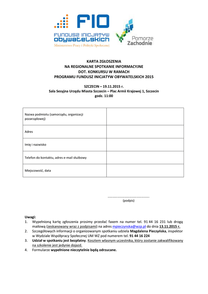 KARTA ZGŁOSZENIA NA REGIONALNE SPOTKANIE INFORMACYJNE DOT. KONKURSU W RAMACH PROGRAMU FUNDUSZ INICJATYW OBYWATELSKICH 2015 SZCZECIN – 19.11.2015 r. Sala Sesyjna Urzędu Miasta Szczecin – Plac Armii Krajowej 1, Szczecin godz. 11:00 Nazwa podmiotu (samorządu, organizacji pozarządowej) Adres Imię i nazwisko Telefon do kontaktu, adres e-mail służbowy Miejscowość, data ……………………………………………. (podpis) Uwagi: 1. Wypełnioną kartę zgłoszenia prosimy przesłać faxem na numer tel. 91 44 16 231 lub drogą mailową (zeskanowany wraz z podpisami) na adres [email protected] do dnia 13.11.2015 r. 2. Szczegółowych informacji o organizowanym spotkaniu udziela Magdalena Pieczyńska, inspektor w Wydziale Współpracy Społecznej UM WZ pod numerem tel. 91 44 16 224 3. Udział w spotkaniu jest bezpłatny. Kosztem własnym uczestnika, który zostanie zakwalifikowany na szkolenie jest jedynie dojazd. 4. Formularze wypełnione nieczytelnie będą odrzucane.