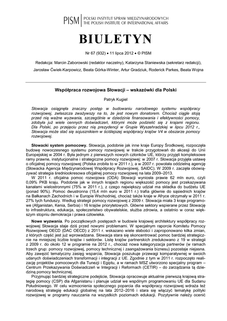 BIULETYN Nr 67 (932) 11 lipca 2012 © PISM Redakcja: Marcin Zaborowski (redaktor naczelny), Katarzyna Staniewska (sekretarz redakcji), Jarosław Ćwiek-Karpowicz, Beata Górka-Winter, Artur Gradziuk, Roderick Parkes, Beata Wojna Współpraca rozwojowa Słowacji – wskazówki dla Polski Patryk Kugiel Słowacja osiągnęła znaczny postęp w budowaniu narodowego systemu współpracy rozwojowej, zwłaszcza zważywszy na to, że jest nowym donatorem. Chociaż ciągle stoją przed nią ważne wyzwania, szczególnie w dziedzinie finansowania i efektywności pomocy, zdobyła już wiele cennych doświadczeń, którymi może podzielić się z krajami regionu. Dla Polski, po przejęciu przez nią prezydencji w Grupie Wyszehradzkiej w lipcu 2012 r., Słowacja może stać się sojusznikiem w ściślejszej współpracy krajów V4 w obszarze pomocy rozwojowej. Słowacki system pomocowy. Słowacja, podobnie jak inne kraje Europy Środkowej, rozpoczęła budowę nowoczesnego systemu pomocy rozwojowej w trakcie przygotowań do akcesji do Unii Europejskiej w 2004 r. Była jednym z pierwszych nowych członków UE, którzy przyjęli kompleksowe ramy prawne, instytucjonalne i strategiczne pomocy rozwojowej: w 2007 r. Słowacja przyjęła ustawę o oficjalnej pomocy rozwojowej (Polska zrobiła to w 2011 r.), a w 2007 r. powołała oddzielną agencję (Słowacka Agencja Międzynarodowej Współpracy Rozwojowej, SAIDC). W 2009 r. zaczęła obowiązywać strategia średniookresowa oficjalnej pomocy rozwojowej na lata 2009–2013. W 2011 r. oficjalna pomoc rozwojowa (ODA) Słowacji wyniosła prawie 62 mln euro, czyli 0,09% PKB kraju. Podobnie jak w innych krajach regionu większość pomocy jest przekazywana kanałami wielostronnymi (75% w 2011 r.), z czego największy udział ma składka do budżetu UE (ponad 90%). Pomoc dwustronna (15,4 mln euro w 2011 r.) trafia głównie do sąsiednich krajów na Bałkanach Zachodnich i w Europie Wschodniej, chociaż także kraje w Afryce otrzymały w 2011 r. 27% tych funduszy. Według strategii pomocy rozwojowej z 2009 r. Słowacja miała 3 kraje programowe (Afganistan, Kenia, Serbia) i 16 krajów priorytetowych. Główne sektory wspierane przez Słowację to infrastruktura, edukacja, społeczeństwo obywatelskie, służba zdrowia, a ostatnio w coraz większym stopniu demokracja i prawa człowieka. Nowe wyzwania. Po początkowych postępach w budowie krajowej architektury współpracy rozwojowej Słowacja staje dziś przed nowymi problemami. W specjalnym raporcie Komitetu Pomocy Rozwojowej OECD (DAC OECD) z 2011 r. wskazano wiele słabości i zaproponowano kilka zmian, z których część jest już wprowadzana. Słowacja stara się skoncentrować pomoc bardziej strategicznie na mniejszej liczbie krajów i sektorów. Listę krajów partnerskich zredukowano z 19 w strategii z 2009 r. do około 12 w programie na 2012 r., chociaż nowa kategoryzacja partnerów (w ramach trzech grup: pomocy rozwojowej, pomocy technicznej i zaangażowania biznesu) pozostaje niejasna. Aby zawęzić tematyczny zasięg wsparcia, Słowacja poszukuje przewagi komparatywnej w swoich udanych doświadczeniach transformacji i integracji z UE. Zgodnie z tym w 2011 r. rozpoczęto realizację projektów pomocowych dla Tunezji i Egiptu, a w ramach MSZ utworzono specjalny program – Centrum Przekazywania Doświadczeń w Integracji i Reformach (CETIR) – do zarządzania tą dziedziną pomocy technicznej. Przyjmując bardziej strategiczne podejście, Słowacja opracowuje aktualnie pierwszą krajową strategię pomocy (CSP) dla Afganistanu i planuje udział we wspólnym programowaniu UE dla Sudanu Południowego. W celu wzmocnienia społecznego poparcia dla współpracy rozwojowej wdraża też narodową strategię edukacji globalnej na lata 2012–2016 i stara się włączyć tematykę polityki rozwojowej w programy nauczania na wszystkich poziomach edukacji. Pozytywnie należy ocenić 2711 Polski Instytut Spraw Międzynarodowych także bliską współpracę administracji publicznej i organizacji pozarządowych. Od podpisania porozumienia w 2010 r. platforma słowackich organizacji pozarządowych uzyskała status oficjalnego partnera MSZ w przeglądzie i ocenie głównych dokumentów i strategii rozwojowych, a słowackie organizacje mogą korzystać ze specjalnej linii budżetowej na współfinansowanie projektów w ramach grantów UE. Niemniej fakt, że ponad połowa słowackiej dwustronnej pomocy rozwojowej jest realizowana przez organizacje pozarządowe, jest krytykowany przez OECD jako forma pomocy wiązanej i mało efektywny sposób udzielania wsparcia. Pomimo tych ulepszeń wciąż pozostaje wiele do poprawy, szczególnie w takich dziedzinach jak programowanie pomocy (np. przygotowanie krajowych strategii dla wszystkich krajów priorytetowych), systemy monitoringu i ewaluacji projektów, przejrzystość pomocy, mechanizm udzielania pomocy humanitarnej oraz spójność polityk na rzecz rozwoju. Ponadto DAC OECD zaleca lepszą koordynację wsparcia w ramach rządu, wprowadzenie zarządzania skoncentrowanego na rezultatach i poprawę widoczności działań pomocowych. Chociaż liczebność personelu zatrudnionego w obszarze współpracy rozwojowej wydaje się wystarczająca (ok. 20 osób w MSZ i SAIDC), duża rotacja pracowników i brak ścieżki rozwoju zawodowego w obszarze rozwojowym utrudniają profesjonalizację zarządzania tym specyficznym obszarem polityki zagranicznej. Co więcej, problemy strukturalne i osobowe w agencji rozwojowej sprawiają, że jej przydatność jest często kwestionowana, a przyszłość w obecnej formie – niepewna. Wnioski dla Polski. Doświadczenia Słowacji obrazują główne wyzwania w obszarze współpracy rozwojowej, charakterystyczne dla wielu nowych członków UE. Można zaliczyć tu problemy m.in. z zapewnieniem odpowiedniego finansowania pomocy, większym zintegrowaniem współpracy rozwojowej z polityką zagraniczną, koordynacją pomocy między różnymi podmiotami