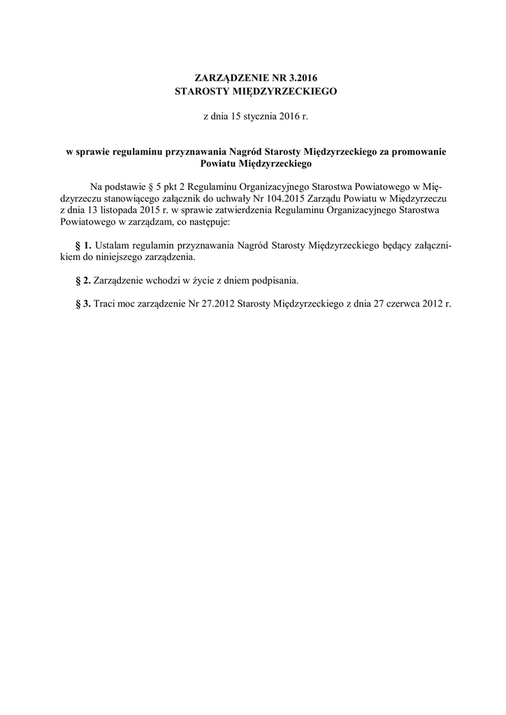 ZARZĄDZENIE NR 3.2016 STAROSTY MIĘDZYRZECKIEGO z dnia 15 stycznia 2016 r. w sprawie regulaminu przyznawania Nagród Starosty Międzyrzeckiego za promowanie Powiatu Międzyrzeckiego Na podstawie § 5 pkt 2 Regulaminu Organizacyjnego Starostwa Powiatowego w Międzyrzeczu stanowiącego załącznik do uchwały Nr 104.2015 Zarządu Powiatu w Międzyrzeczu z dnia 13 listopada 2015 r. w sprawie zatwierdzenia Regulaminu Organizacyjnego Starostwa Powiatowego w zarządzam, co następuje: § 1. Ustalam regulamin przyznawania Nagród Starosty Międzyrzeckiego będący załącznikiem do niniejszego zarządzenia. § 2. Zarządzenie wchodzi w życie z dniem podpisania. § 3. Traci moc zarządzenie Nr 27.2012 Starosty Międzyrzeckiego z dnia 27 czerwca 2012 r. Załącznik do zarządzenia Nr 1.2016 Starosty Międzyrzeckiego z dnia 15 stycznia 2016 r. Regulamin przyznawania Nagród Starosty Międzyrzeckiego za promowanie Powiatu Międzyrzeckiego. § 1. Niniejszy regulamin określa zasady, organizację i tryb pracy Komisji do spraw przyznawania Nagród Starosty Międzyrzeckiego, zwanych dalej „Nagrodą”. § 2. 1. Na wniosek Komisji Starosta Międzyrzecki przyznaje w ciągu roku budżetowego Nagrody za promowanie Powiatu Międzyrzeckiego. 2. Nagrodą, o której mowa w ust.1 jest okolicznościowa statuetka. 3. Nagroda ma charakter honorowy. 4. Nagroda przyznawana jest pełnoletnim mieszkańcom powiatu za działania popularyzujące Powiat Międzyrzecki w kraju lub za granicą poprzez: a) osiągniecia w regionalnych, ogólnopolskich lub międzynarodowych targach, wystawach i imprezach promujących Powiat Międzyrzecki; b) osiągnięcia w powiatowych, regionalnych i ogólnopolskich zawodach sportowych; c) sukcesy w organizacji kultury, upowszechnianiu jej wartości oraz edukacji kulturalnej; d) osiągnięcia w dziedzinie twórczości artystycznej oraz kultywowanie tradycji regionalnych; e) działalność dobroczynną lub charytatywną. 5. Laureatem Nagrody Starosty można zostać tylko jeden raz. § 3. Nagrody nie muszą być obligatoryjnie przyznane we wszystkich kategoriach w danym roku kalendarzowym. § 4. 1. Nagroda przyznawana jest na wniosek: a) Rady Powiatu Międzyrzeckiego, w imieniu której wniosek składa przewodniczący przy akceptacji większości radnych. b) jednostek samorządu terytorialnego z terenu Powiatu Międzyrzeckiego, c) związków, stowarzyszeń i fundacji. 2. Nagroda może być również przyznana na wniosek Starosty Międzyrzeckiego. 3. Wniosek o przyznanie Nagrody powinien zawierać: a) imię i nazwisko, adres oraz dane teleadresowe kandydata, b) opis dotychczasowej działalności oraz osiągnięć, za które ma być uhonorowany kandydat. 4. Wzór wniosku stanowi załącznik nr 1 do regulaminu. § 5. 1. Złożone wnioski rozpatruje Komisja powołana przez Starostę w skład, której wchodzi: a) członek Zarządu Powiatu, jako Przewodniczący Komisji, b) członek Komisji Edukacji, Kultury i Sportu, c) pracownik Wydziału Edukacji, Spraw Społecznych i Promocji. 2. Komisja zostaje powołana na dany rok kalendarzowy 3. Do zadań Komisji należy: a) zweryfikowanie wniosków pod względem formalnym, b) rozpatrzenie wniosków pod względem merytorycznym, c) przedstawienie Staroście Międzyrzeckiemu listy kandydatów do Nagrody. 4. Komisja rozpatruje złożone wnioski do 30 października każdego roku. 5. Siedzibą Komisji jest siedziba Starostwa Powiatowego w Międzyrzeczu. 6. Komisja zastrzega sobie wyłączne prawo do interpretacji regulaminu. § 6. Starosta Międzyrzecki, biorąc pod uwagę propozycje Komisji, zatwierdza ostatecznie laureatów Nagrody. § 7. Środki na Nagrody rezerwowane są corocznie w budżecie Powiatu Międzyrzeckiego. § 8.1. Nagroda jest wręczana przez Starostę Międzyrzeckiego lub w przypadku nieobecności starosty przez osobę przez niego upoważnioną, na sesji Rady Powiatu. 2. Informację o przyznaniu Nagrody podaje się do publicznej wiadomości w sposób zwyczajowo przyjęty. § 9. Wydział Edukacji, Spraw Społecznych i Promocji jest odpowiedzialny za: a) ewidencję złożonych wniosków, b) obsługę administracyjną Komisji, c) prowadzenie ewidencji kandydatów nominowanych oraz księgi laureatów. Załącznik nr 1 do regulaminu przyznawania Nagrody Starosty Międzyrzeckiego WNIOSEK o przyznanie Nagrody Starosty Międzyrzeckiego za promowanie Powiatu Międzyrzeckiego. 1. Imię i nazwisko zgłaszanego kandydata, adres, dane teleadresowe (telefon, e-mail): ....................................................................................................................................................... 2. Opis dotychczasowej działalności oraz osiągnięć, za które ma być uhonorowany kandydat: ....................................................................................................................................................... 3. Dane wnioskodawcy wraz z oświadczeniem uprawnionej osoby o prawdziwości podanych informacji i danych: (pełna nazwa i adres ) (podpis i pieczęć upoważnionej osoby) Międzyrzecz, dnia ………… 4. Pisemną zgodę kandydata na przetwarzanie danych osobowych, zgodnie z obowiązującymi przepisami: Międzyrzecz, dnia …………………… Ja, niżej podpisana /-y/ ur. ……..……w ………… wyrażam zgodę na przetwarzanie danych osobowych zawartych w niniejszym wniosku zgodnie z ustawą z dnia 29 sierpnia 1997 r. o ochronie danych osobowych (Dz. U. 2015. poz. 2135 z późn.zm.) ……………….. podpis kandydata