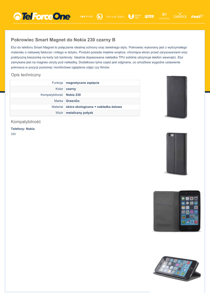Pokrowiec Smart Magnet do Nokia 230 czarny B Etui do telefonu Smart Magnet to połączenie idealnej ochrony oraz świetnego stylu. Pokrowiec wykonany jest z wytrzymałego materiału o ciekawej fakturze i miłego w dotyku. Produkt posiada miękkie wnętrze, chroniące ekran przed zarysowaniami oraz praktyczną kieszonkę na karty lub banknoty. Idealnie dopasowana nakładka TPU solidnie utrzymuje telefon wewnątrz. Etui zamykane jest na magnes ukryty pod nakładką. Dodatkowo tylna część jest odginana, co umożliwia wygodne ustawienie pokrowca w pozycji poziomej i komfortowe oglądanie zdjęć czy filmów. Opis techniczny Funkcje magnetyczne zapięcie Kolor czarny Kompatybilność Nokia 230 Marka GreenGo Materiał skóra ekologiczna + nakładka żelowa Wzór metaliczny połysk Kompatybilność Telefony: Nokia 230