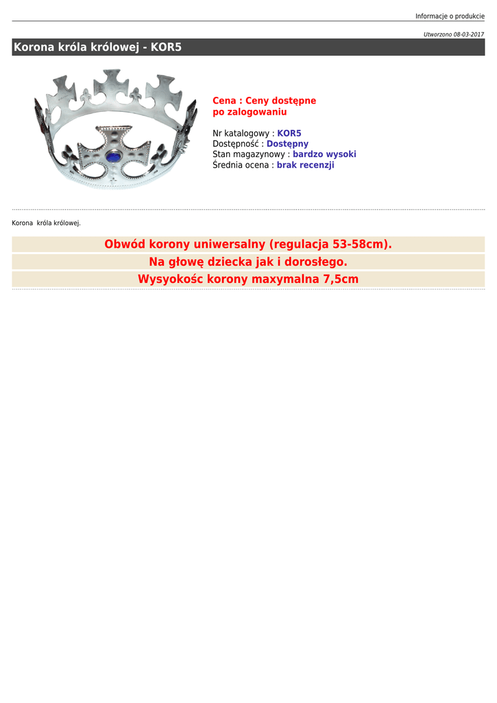 Informacje o produkcie Utworzono 08-03-2017 Korona króla królowej - KOR5 Cena : Ceny dostępne po zalogowaniu Nr katalogowy : KOR5 Dostępność : Dostępny Stan magazynowy : bardzo wysoki Średnia ocena : brak recenzji Korona króla królowej. Obwód korony uniwersalny (regulacja 53-58cm). Na głowę dziecka jak i dorosłego. Wysyokośc korony maxymalna 7,5cm