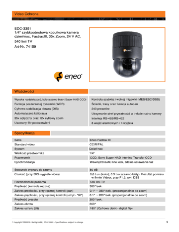 Video Ochrona EDC-3351 1/4" szybkoobrotowa kopu³kowa kamera dzieñ/noc, FastraxIII, 35x Zoom, 24 V AC, 540 linii TV Art-Nr. 74159 W³aœciwoœci Wysoka rozdzielczoœæ, kolor/czarno-bia³y (Super HAD CCD) Kontrola szybkiej i wolnej migawki (MES/ESC/DSS) Funkcja poszerzonej dynamiki (WDR) Œcie¿ki, trasy oraz funkcja autopan Cyfrowa stabilizacja obrazu (DIS) 240 presetów Automatyczna kalibracja Utrzymanie stref prywatnoœci w trakcie ruchu kamery 35x optyczny oraz 12x cyfrowy zoom Interfejs RS-485/RS-422 Usuwany filtr podczerwieni 8 wejœæ alarmowych / 4 wyjœcia Specyfikacja Seria Eneo Fastrax III Standard video CCIR/PAL System Dzieñ/noc Wielkoœæ przetwornika 1/4" Przetwornik CCD, Sony Super HAD Interline Transfer CCD Synchronizacja Wewnêtrzna/AC line lock, zdalne ustawianie faz Stosunek sygna³u do szumu 50 dB Czu³oœæ (przy 50% sygnale video) 0,6 Lux (kolor); 0.3 Lux (czarno-bia³y). Rezultat pomiaru w firmie Videor, przy F1.2, wy³. DSS Rozdzielczoœæ pozioma 540 linii TV Prêdkoœæ (kontrola rêczna) 380°/sek. Zakres prêdkoœci, przy rêcznej kontroli (pan) 0.1° ~ 380°/sek. (proporcjonalnie do zoom) Zakres prêdkoœci, przy rêcznej kontroli (uchy³ - "tilt") 0.1° ~ 200°/sek. (proporcjonalnie do zoom) Prêdkoœæ presetu 380°/sek. Zakres obrotu 360° Zakres uchy³u (tilt) 180° (Cyfrowy obrót - digital flip) © Copyright VIDEOR E. Hartig GmbH, 27.02.2009 - Specifications subject to change 1 EDC-3351 (Specyfikacja cd) Pozycjonowanie wg presetów 240 presetów ze statusem kamery (wyœwietlanie tytu³ów 12 znakowych) Luz 0.2° Œcie¿ki 8 œcie¿ek do 500 sek. Trasy Do 8 programowanych tras ochrony, sk³adaj¹cych siê z 42 presetów ka¿da i 12 znakowych tytu³ów Autoskan 16 programowanych automatycznych skanów z 13 wybieranymi prêdkoœciami i 12 znakowymi tytu³ami Proporcjonalny pan i tilt Postêpuj¹ce zmniejszanie prêdkoœci pan i tilt, proporcjonalnie do g³êbokoœci zoom Funkcja automatycznego obrotu (auto flip) Obrót obrazu o 180 stopni, przy przejœciu kamery przez punkt pionu (cyfrowy obrót) Programowana pozycja parkowania Jest Ukrywanie stref prywatnych 8 stref prywatnoœci (2 metody wyboru: blok / wy³¹czenie video) Cyfrowe przetwarzanie sygna³u (DSP) DSP-7 Automatyczna kontrola wzmocnienia (AGC) Automatyczna (w³./wy³. prze³¹czane) Tryby migawki Szybka oraz wolna migawka Prêdkoœæ migawki (AES/MES) Automatyczna/rêczna: 1/50 ~ 1/30,000 sek. Inteligentne wytwarzanie klatek Tak Wolna migawka (DSS) 2 ~ 32 fps. Cyfrowa redukcja szumów (DNR) Nie Balans bieli Tryby: Rêczny, Automatyczny, Wewn¹trz, Na zewn¹trz, ATW Uk³ad kompensacji t³a BLC, WDR Prze³¹czany filtr podczerwieni Tak Wyjœcia video (typy) CVBS, VBS Wyjœcia video 1Vp-p, (C)VBS, 75 ohmów, BNC Typ monta¿u obiektywu Obiektyw wbudowany Typ obiektywu Z zoomem Obiektyw F1.4 ~ F170/3.4 ~ 119 mm (35x optyczny zoom) Asferyczna technologia Tak Ogniskowa 3,4-119 mm Poziomy k¹t widzenia 55,8-1,7° Cyfrowy zoom 12x Kontrola ostroœci Automatyczna z mo¿liwoœci¹ rêcznej Kontrola przes³ony Automatyczna z mo¿liwoœci¹ rêcznej Minimalna odleg³oœæ od obiektu (MOD) 1,0 m Wejœcia alarmu 8, wybór pomiêdzy domyœlnie otwarty (NO) i domyœlnie zmkniêty (NC) Wyjœcia alarmu 4x wyjœcia przekaŸnikowe, programowane jako domyœlnie otwarte NO/domyœlnie zamkniête NC, 12VDC/1.0A obci¹¿enie Wyzwalanie alarmu Programowanie zdarzeñ z ustawianym poziomem priorytetu Funkcja detekcji ruchu Dostêpna Menu konfiguracyjne W³./wy³. prze³¹czane Jêzyki menu Angielski, Niemiecki, Francuski, Hiszpañski, Portugalski, W³oski, Polski © Copyright VIDEOR E. Hartig GmbH, 27.02.2009 - Specifications subject to change 2 EDC-3351 (Specyfikacja cd) Wyœwietlanie tekstu 12 znakowe etykiety Blokada dzia³ania Dostêpna Pamiêæ ustawieñ Pamiêæ nieulotna, przechowuj¹ca wszystkie ustawienia kamery Adresy Do 999 numerów ID (3999 poprzez ustawienia oprogramowania) Kontrola za pomoc¹ klawiatury Bezpoœredni tryb kontroli, przy u¿yciu klawiatr Eneo z serii EDC-KBD(M) lub w po³¹czeniu z cyfrowymi video rejestratorami Eneo serii DLR, DTR oraz DPR Zdalna kontrola Dokonywanie ustawieñ zdalnie przy pomocy klawiatury Szeregowe interfejsy RS-422, RS-485, 9600Baud, wybór 999 adresów ID kamery. Poza tym, kontrola z u¿yciem klawiatur Eneo serii EDC-KBD(M), kontrola poprzez krosownice oraz klawiatury Pelco (protoko³y D+P), Ernitec, Philips G3, Sensormatic RS-422, (kana³ zwrotny przez RS-422 jest nieaktywny), Vicon i Dynacolor s¹ dostêpne Zakres temperaturowy pracy 0 ~ +50°C Grza³ka Brak Klasa ochrony IP40 Napiêcie zasilaj¹ce 24 V AC, (18 ~ 30 V AC), 50/60 Hz Pobór mocy 20 wat Odpornoœæ na akty wandalizmu Nie Klosz 4.9" (125 mm), akrylowy plastik Kolor (klosz) Przezroczysty Monta¿ Powierzchniowy, obudowa w zestawie monta¿owym Obudowa Wewnêtrzna Materia³ obudowy Plastik Kolor obudowy Czarny Waga Oko³o 1.2 kg Wyposa¿enie Przezroczysty klosz Certyfikaty CE Cechy specjalne Automatyczna kalibracja Akcesoria 74130 / EDC-OPC-2/24V Obudowa kopu³kowa zewnêtrzna, monta¿ wisz¹cy. Os³ona przeciw s³oneczna, przezroczysty klosz 6.5", 24 V AC 74136 / EDC-OPS-2/24V Obudowa kopu³kowa zewnêtrzna, monta¿ wisz¹cy. Os³ona przeciw s³oneczna, Dymiony klosz 6.5", 24 V AC 74134 / EDC-IPS-2/24V Obudowa kopu³kowa wewnêtrzna, monta¿ wisz¹cy. Dymiony klosz 6.5", 24 V AC 74135 / EDC-IPC-2/24V Obudowa kopu³kowa wewnêtrzna, monta¿ wisz¹cy. Przezroczysty klosz 6.5", 24 V AC 74057 / EDC-IDF Obudowa do monta¿u w podwieszanym suficie. Klosz dymiony 4.9" 74139 / EDC-IDFHCB Obudowa do monta¿u w podwieszanym suficie, czarny pierœcieñ maskuj¹cy, przezroczysty klosz 6.8" 70527 / NE-132/AC24V Jednostka zasilaj¹ca 230 V AC/24 V AC (1.0 A) © Copyright VIDEOR E. Hartig GmbH, 27.02.2009 - Specifications subject to change 3 EDC-3351 (Akcesoria cd) 70449 / NE-128 Jednostka zasilaj¹ca 230 V/24 V AC-5 A, IP66 70457 / AK-3 Skrzynka po³¹czeniowa, 230 V AC Wejœcie 24 V AC-100 W, 12 V DC-1 A wyjœcie 74088 / E