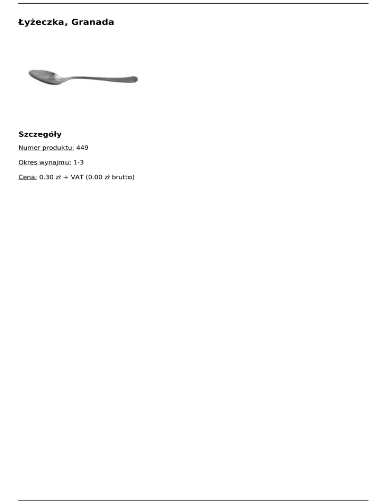 Łyżeczka, Granada Szczegóły Numer produktu: 449 Okres wynajmu: 1-3 Cena: 0.30 zł + VAT (0.00 zł brutto) Powered by TCPDF (www.tcpdf.org)