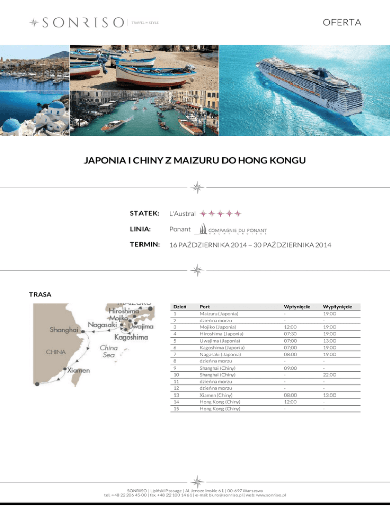 OFERTA JAPONIA I CHINY Z MAIZURU DO HONG KONGU STATEK: L'Austral LINIA: Ponant TERMIN: 16 PAŹDZIERNIKA 2014 – 30 PAŹDZIERNIKA 2014 TRASA Dzień 1 2 3 4 5 6 7 8 9 10 11 12 13 14 15 Port Maizuru (Japonia) dzień na morzu Mojiko (Japonia) Hiroshima (Japonia) Uwajima (Japonia) Kagoshima (Japonia) Nagasaki (Japonia) dzień na morzu Shanghai (Chiny) Shanghai (Chiny) dzień na morzu dzień na morzu Xiamen (Chiny) Hong Kong (Chiny) Hong Kong (Chiny) Wpłynięcie 12:00 07:30 07:00 07;00 08:00 09:00 08:00 12:00 - SONRISO | Lipiński Passage | Al. Jero zo limskie 61 | 00-697 Warszawa tel. +48 22 206 45 00 | fax. +48 22 100 14 61 | e-mail: biuro @so nriso .pl | web: www.so nriso .pl Wypłynięcie 19:00 19:00 19:00 13:00 19:00 19:00 22:00 13:00 - OFERTA CENA Typ kabiny Cena z osobę Kabina z oknem od 3 270 EUR Kabina z balkonem od 3 950 EUR Kabina z balkonem Prestige od 4 210 EUR Deluxe Suite od 5 290 EUR CENA ZAWIERA DOTATKOWE OPŁATY zakwaterowanie w 2 - os. kabinie wybranej kategorii pełne wyżywienie: 3 posiłki, przekąski między posiłakmi, bufet o północy napoje do posiłków: woda stołowa, kawa, herbata, wybrane wina oraz sok do śniadania serwis bagażowy podczas wejścia i zejścia ze statku 24 godzinny serwis kabinowy korzystanie z urządzeń sportowo - rekreacyjnych dostępnych na pokładzie (baseny, jacuzzi, boiska sportowe itp.) udział we wszystkich imprezach organizowanych na pokładzie (przedstawienia, pokazy, aukcje, animacje i inne) dojazd/przelot do portu rozpoczęcia i zakończenia rejsu transfery (lotnisko - port - lotnisko) ewentualne noclegi przed lub po rejsie wycieczki fakultatywne napoje: bezalkoholowe, alkoholowe, woda mineralna dostępne w restauracjach i barach (istnieje możliwość wykupienia pakietów napojów, o szczegóły zapytaj w biurze) korzystanie z mini baru w kabinie korzystanie z usług typu: SPA, salon piękności, pralnia itp. wydatki osobiste tj. zakupy w butikach, internet, kasyno itp. obowiązkowe opłaty portowe obowiązkowa opłata serwisowa obowiązkowe ubezpieczenie turystyczne koszt wymaganych wiz ewentualna opłata paliwowa (linia w momencie wzrotu cen ropy zastrzega sobie prawo do dodania oplaty paliwowej do każdej rezerwacji) Na życzenie świadczymy dodatkowo usługi: rezerwacje hotelowe na całym świecie rezerwacje biletów lotniczych, trasferów oraz parkingu w porcie rezerwacje wycieczek fakultatywnych i innych atrakcji SONRISO | Lipiński Passage | Al. Jero zo limskie 61 | 00-697 Warszawa tel. +48 22 206 45 00 | fax. +48 22 100 14 61 | e-mail: biuro @so nriso .pl | web: www.so nriso .pl