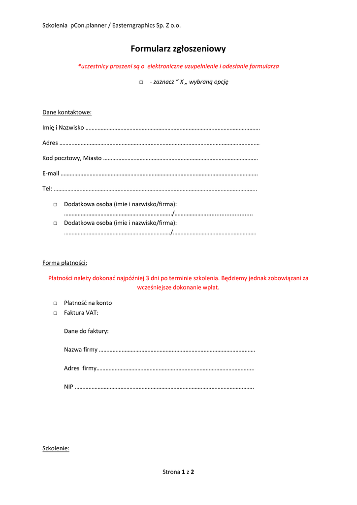 Szkolenia pCon.planner / Easterngraphics Sp. Z o.o. Formularz zgłoszeniowy *uczestnicy proszeni są o elektroniczne uzupełnienie i odesłanie formularza □ - zaznacz ” X „ wybraną opcję Dane kontaktowe: Imię i Nazwisko ……………………………………………………………………………………………………. Adres …………………………………………………………………………………………………………………… Kod pocztowy, Miasto ………………………………………………………………………………………… E-mail …………………………………………………………………………………………………………………. Tel: …………………………………………………………………………………………………………………….. □ □ Dodatkowa osoba (imie i nazwisko/firma): ……………………………………………………………../…………………............................ Dodatkowa osoba (imie i nazwisko/firma): ……………………………………………………………./………………………………………………. Forma płatności: Płatności należy dokonać najpóźniej 3 dni po terminie szkolenia. Będziemy jednak zobowiązani za wcześniejsze dokonanie wpłat. □ □ Płatność na konto Faktura VAT: Dane do faktury: Nazwa firmy …………………………………………………………………………………………. Adres firmy………………………………………………………………………………………….. NIP ………………………………………………………………………………………………………. Szkolenie: Strona 1 z 2 Szkolenia pCon.planner / Easterngraphics Sp. Z o.o. Termin (data)……………………………………………………………………………………………………… Miasto ……………………………………………………………………………………………………………….. □ □ Poziom podstawowy – 349 zł netto Poziom zaawansowany – 399 zł netto Sprzęt: □ □ Posiadam własny komputer Proszę o wypożyczenie laptopa (opcja dodatkowo płatna 50 zł netto) Zgody: Zgoda na przetwarzanie danych osobowych (pole obowiązkowe) □ Wyrażam zgodę na przetwarzanie moich danych osobowych przez EasternGraphics sp. z o.o. w celach marketingowych i promocyjnych związanych z jego działalnością, zgodnie z ustawą z dnia 29 sierpnia 1997 roku o ochronie danych osobowych (Dz. U. z 2002r, Nr 101, poz. 926 z późn. zm.), w dowolnym czasie, w tym również w przyszłości. Każda osoba ma prawo dostępu do treści swoich danych oraz możliwościach ich poprawiania w każdym czasie. Zgoda na wysyłanie informacji handlowej * (Newslettera) □ * Wyrażam zgodę na otrzymywanie od EasternGraphics Sp. z o.o. z siedzibą w Krakowie informacji handlowej i materiałów promocyjnych drogą elektroniczną w rozumieniu ustawy z dnia 18 lipca 2002r. o świadczeniu usług drogą elektroniczną (Dz. U. Nr 144, poz. 1204 z późn. zm.) na podany w zgłoszeniu adres e-mail. Skąd dowiedziałeś się o szkoleniu? □ □ □ □ □ □ Newsletter Facebook- pCon.planner strefa dobrego designu Mailing bezpośredni/ kontakt osobisty Reklama Blog Inne …………………………………………………………………………………………. Strona 2 z 2