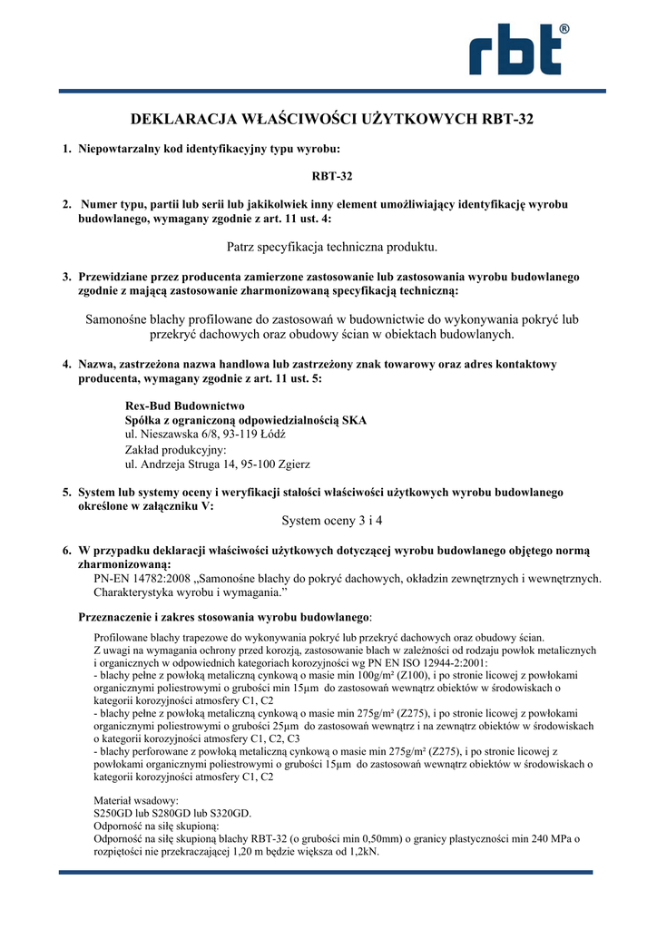 DEKLARACJA WŁAŚCIWOŚCI UŻYTKOWYCH RBT-32 1. Niepowtarzalny kod identyfikacyjny typu wyrobu: RBT-32 2. Numer typu, partii lub serii lub jakikolwiek inny element umożliwiający identyfikację wyrobu budowlanego, wymagany zgodnie z art. 11 ust. 4: Patrz specyfikacja techniczna produktu. 3. Przewidziane przez producenta zamierzone zastosowanie lub zastosowania wyrobu budowlanego zgodnie z mającą zastosowanie zharmonizowaną specyfikacją techniczną: Samonośne blachy profilowane do zastosowań w budownictwie do wykonywania pokryć lub przekryć dachowych oraz obudowy ścian w obiektach budowlanych. 4. Nazwa, zastrzeżona nazwa handlowa lub zastrzeżony znak towarowy oraz adres kontaktowy producenta, wymagany zgodnie z art. 11 ust. 5: Rex-Bud Budownictwo Spółka z ograniczoną odpowiedzialnością SKA ul. Nieszawska 6/8, 93-119 Łódź Zakład produkcyjny: ul. Andrzeja Struga 14, 95-100 Zgierz 5. System lub systemy oceny i weryfikacji stałości właściwości użytkowych wyrobu budowlanego określone w załączniku V: System oceny 3 i 4 6. W przypadku deklaracji właściwości użytkowych dotyczącej wyrobu budowlanego objętego normą zharmonizowaną: PN-EN 14782:2008 „Samonośne blachy do pokryć dachowych, okładzin zewnętrznych i wewnętrznych. Charakterystyka wyrobu i wymagania.” Przeznaczenie i zakres stosowania wyrobu budowlanego: Profilowane blachy trapezowe do wykonywania pokryć lub przekryć dachowych oraz obudowy ścian. Z uwagi na wymagania ochrony przed korozją, zastosowanie blach w zależności od rodzaju powłok metalicznych i organicznych w odpowiednich kategoriach korozyjności wg PN EN ISO 12944-2:2001: - blachy pełne z powłoką metaliczną cynkową o masie min 100g/m² (Z100), i po stronie licowej z powłokami organicznymi poliestrowymi o grubości min 15µm do zastosowań wewnątrz obiektów w środowiskach o kategorii korozyjności atmosfery C1, C2 - blachy pełne z powłoką metaliczną cynkową o masie min 275g/m² (Z275), i po stronie licowej z powłokami organicznymi poliestrowymi o grubości 25µm do zastosowań wewnątrz i na zewnątrz obiektów w środowiskach o kategorii korozyjności atmosfery C1, C2, C3 - blachy perforowane z powłoką metaliczną cynkową o masie min 275g/m² (Z275), i po stronie licowej z powłokami organicznymi poliestrowymi o grubości 15µm do zastosowań wewnątrz obiektów w środowiskach o kategorii korozyjności atmosfery C1, C2 Materiał wsadowy: S250GD lub S280GD lub S320GD. Odporność na siłę skupioną: Odporność na siłę skupioną blachy RBT-32 (o grubości min 0,50mm) o granicy plastyczności min 240 MPa o rozpiętości nie przekraczającej 1,20 m będzie większa od 1,2kN. Palność: Powłoka poliestrowa ≤ 25µm spełnia wymogi klasy A1. Odporność na oddziaływanie ognia zewnętrznego: klasa B ROOF (t1), klasa B ROOF(t2), klasa B ROOF (t3) Instytut Techniki Budowlanej Zakład Konstrukcji I Elementów Budowlanych – 1797/10/Z00NK Wodoszczelność, przepuszczalność wody, powietrza i oparów – Wyroby nie mające perforacji (jako uszkodzeń) są wodoszczelne i nieprzepuszczalne dla pary i powietrza. Zmiana wymiarów – rozszerzalność cieplna powinna być brana pod uwagę tam, gdzie taka zmiana może mieć wpływ na eksploatację produktu, należy brać pod uwagę odpowiedni współczynnik rozszerzalności cieplnej -stal: 12 x 10-6 K-1. 7. Właściwości użytkowe wyrobu określone w punkcie 3 są zgodne z właściwościami deklarowanymi w punkcie 6. Niniejsza deklaracja właściwości użytkowych wydana została na wyłączną odpowiedzialność producenta. W imieniu producenta podpisał: Grabowski Michał Dyrektor Zakładu Zgierz, 01.07.2013 (miejsce i data wystawienia)