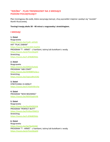 "RZEŹBA" - PLAN TRENINGOWY NA 3 MIESIĄCE POZIOM POCZĄTKUJĄCY Plan treningowy dla osób, które zaczynają ćwiczyć, chcą wyrzeźbić mięśnie i pozbyć się "resztek" tkanki tłuszczowej. Treningi trwają około 30 - 40 minut z rozgrzewką i stretchingiem. I MIESIĄC 1. Dzień Rozgrzewka https://youtu.be/mxKr-ub5ijQ HIIT "PLAC ZABAW" https://youtu.be/24UWO-0oZSQ PROGRAM "T - ARMS" - z hantlami, taśmą lub butelkami z wodą https://youtu.be/p7ImcQCgJt4 Stretching https://youtu.be/t-jENbBZMds 2. Dzień Rozgrzewka https://youtu.be/jSXQ1OuIIaQ PROGRAM "ABS START" https://youtu.be/OHMBFhcSq-s Stretching https://youtu.be/UgoLe8tUC0Q 3. Dzień STRETCHING 15 MINUT https://youtu.be/CTOxHrWrxYw 4. Dzień PROGRAM "NEW BEGINING" https://youtu.be/K6lVGxphrHk 5. Dzień Rozgrzewka https://youtu.be/XuA5kZKS2Jk PROGRAM "PERFECT BUTT" https://youtu.be/Pvf4zxY9WCU Stretching https://youtu.be/t-jENbBZMds 6. Dzień Rozgrzewka https://youtu.be/jtg76pWijG8 PROGRAM "T - ARMS" - z hantlami, taśmą lub butelkami z wodą https://youtu.be/p7ImcQCgJt4 Stretching https://youtu.be/e9XyB6sgLKU 7. Dzień WOLNE II MIESIĄC 1. Dzień PROGRAM "NEW YOU" https://youtu.be/srO8uun-LKE 2. Dzień Rozgrzewka https://youtu.be/jSXQ1OuIIaQ FIT FAST - ABS & WAIST https://youtu.be/fRTOy1_IO5o Stretching https://youtu.be/UgoLe8tUC0Q 3. Dzień PROGRAM "STRETCHING 15 MINUT" https://youtu.be/CTOxHrWrxYw 4. Dzień Rozgrzewka https://youtu.be/XuA5kZKS2Jk FIT FAST - UPPER BODY https://youtu.be/rPtX6CRAJ2o Stretching https://youtu.be/t-jENbBZMds 5. Dzień Rozgrzewka https://youtu.be/mxKr-ub5ijQ HIIT "MALTA" https://youtu.be/eb5jWkTN750 Stretching https://youtu.be/e9XyB6sgLKU 6. Dzień Rozgrzewka https://youtu.be/szMH-uD2-aQ FIT FAST - LOWER BODY https://youtu.be/rDAsHgBvKoM Stretching https://youtu.be/t-jENbBZMds 7. Dzień WOLNE III MIESIĄC 1. Dzień Rozgrzewka https://youtu.be/jSXQ1OuIIaQ HIIT "ABS STYLE" https://youtu.be/zTb6H9zIpIU Stretching https://youtu.be/UgoLe8tUC0Q 2. Dzień Rozgrzewka https://youtu.be/mxKr-ub5ijQ HIIT "DASZ RADĘ" https://youtu.be/LyKF5Ls0-nE PROGRAM "T - ARMS" - z hantlami, taśmą lub butelkami z wodą https://youtu.be/p7ImcQCgJt4 Stretching https://youtu.be/t-jENbBZMds 3. Dzień Rozgrzewka https://youtu.be/XuA5kZKS2Jk PROGRAM "PERFECT BUTT" - z obciążeniem https://youtu.be/Pvf4zxY9WCU Stretching https://youtu.be/UgoLe8tUC0Q 4. Dzień Rozgrzewka https://youtu.be/mxKr-ub5ijQ CROSSFIT "WOD 9" https://youtu.be/F5HhihNEYtY PROGRAM "T - ARMS" - z hantlami, taśmą lub butelkami z wodą https://youtu.be/p7ImcQCgJt4 Stretching https://youtu.be/t-jENbBZMds 5. Dzień Rozgrzewka https://youtu.be/yBUWPAvsFx0 FIT FAST - ABS & WAIST https://youtu.be/fRTOy1_IO5o Stretching https://youtu.be/UgoLe8tUC0Q 6. Dzień Rozgrzewka https://youtu.be/szMH-uD2-aQ HIIT "BUTT PUSH -UP" https://youtu.be/JvcgnOnupa4 Stretching https://youtu.be/e9XyB6sgLKU 7. Dzień WOLNE Przeczytaj koniecznie: 10 TRENINGOWYCH ZASAD DLA DOBREGO SAMOPOCZUCIA: - Trenuj w butach sportowych - Nie dokładaj nic do planu, jest on kompletny - Zawsze ćwicz swoim tempem, nie moim - Najważniejsza podczas treningu jest technika, to dzięki niej nie ulegniesz kontuzji i osiągniesz upragniony efekt - Programy nie są łatwe i takie mają być. To trudne zestawy dla osób początkujących. NIE MUSISZ ich zrobić w 100%, ale masz dać z siebie 100%. Wykonanie połowy treningu to już duży sukces - Dieta stanowi 70% sukcesu - Do treningu przystąp po konsultacji z Twoim lekarzem - Jeśli źle się czujesz przerwij trening - Nie narażaj się na maksymalne zmęczenie, odpoczynek też jest elementem treningu - Dla kobiet: w trakcie cyklu menstruacyjnego wysiłek nie jest wskazany, unikaj też ćwiczeń na mięśnie brzucha i okolicę miednicy MIŁEGO TRENINGU!