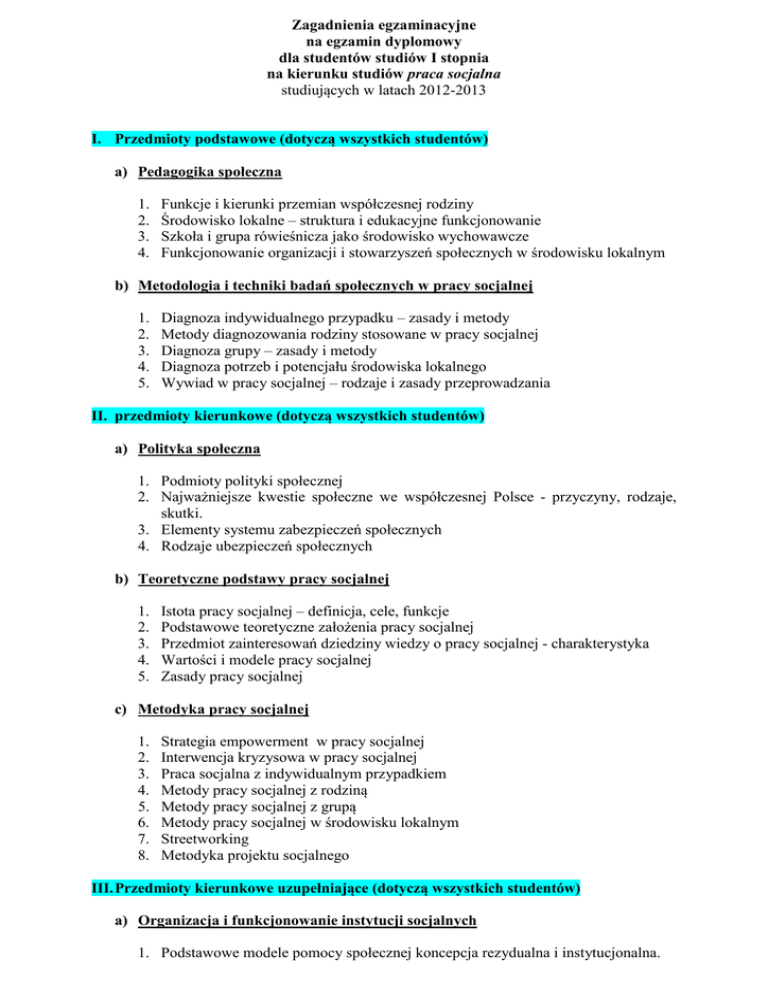 Zagadnienia egzaminacyjne na egzamin dyplomowy dla studentów studiów I stopnia na kierunku studiów praca socjalna studiujących w latach 2012-2013 I. Przedmioty podstawowe (dotyczą wszystkich studentów) a) Pedagogika społeczna 1. 2. 3. 4. Funkcje i kierunki przemian współczesnej rodziny Środowisko lokalne – struktura i edukacyjne funkcjonowanie Szkoła i grupa rówieśnicza jako środowisko wychowawcze Funkcjonowanie organizacji i stowarzyszeń społecznych w środowisku lokalnym b) Metodologia i techniki badań społecznych w pracy socjalnej 1. 2. 3. 4. 5. Diagnoza indywidualnego przypadku – zasady i metody Metody diagnozowania rodziny stosowane w pracy socjalnej Diagnoza grupy – zasady i metody Diagnoza potrzeb i potencjału środowiska lokalnego Wywiad w pracy socjalnej – rodzaje i zasady przeprowadzania II. przedmioty kierunkowe (dotyczą wszystkich studentów) a) Polityka społeczna 1. Podmioty polityki społecznej 2. Najważniejsze kwestie społeczne we współczesnej Polsce - przyczyny, rodzaje, skutki. 3. Elementy systemu zabezpieczeń społecznych 4. Rodzaje ubezpieczeń społecznych b) Teoretyczne podstawy pracy socjalnej 1. 2. 3. 4. 5. Istota pracy socjalnej – definicja, cele, funkcje Podstawowe teoretyczne założenia pracy socjalnej Przedmiot zainteresowań dziedziny wiedzy o pracy socjalnej - charakterystyka Wartości i modele pracy socjalnej Zasady pracy socjalnej c) Metodyka pracy socjalnej 1. 2. 3. 4. 5. 6. 7. 8. Strategia empowerment w pracy socjalnej Interwencja kryzysowa w pracy socjalnej Praca socjalna z indywidualnym przypadkiem Metody pracy socjalnej z rodziną Metody pracy socjalnej z grupą Metody pracy socjalnej w środowisku lokalnym Streetworking Metodyka projektu socjalnego III. Przedmioty kierunkowe uzupełniające (dotyczą wszystkich studentów) a) Organizacja i funkcjonowanie instytucji socjalnych 1. Podstawowe modele pomocy społecznej koncepcja rezydualna i instytucjonalna. 2. 3. 4. 5. Cele, zadania, funkcje instytucji pomocy społecznej. Kadra instytucji pomocy społecznej – role zawodowe pracowników socjalnych. Zasoby instytucji socjalnych. Struktura organizacyjna pomocy społecznej – instytucje socjalne realizujące zdania pomocy społecznej. 6. Organizacja i funkcjonowanie wybranych instytucji socjalnych - procedury. b) Dziedziny pracy socjalnej 1. Praca socjalna z rodziną problemową. 2. Przemoc w rodzinie (praca socjalna z ofiarą przemocy i ze sprawcą przemocy, rola i zadania pracownika socjalnego w zespole interdyscyplinarnym). 3. Praca socjalna z dzieckiem w domu (dziecko zaniedbane, dziecko krzywdzone i dziecko wykorzystywane seksualnie) 4. Praca socjalna z dzieckiem w środowisku lokalnym ( świetlice środowiskowe, role i zadania kuratora nieletnich, wybrane programy profilaktyczne). 5. Praca socjalna z dzieckiem w szkole (dziecko z niepowodzeniami szkolnymi, rola i zadania pedagoga szkolnego, wybrane programy profilaktyczne). 6. Praca socjalna w służbie zdrowia. IV. Przedmioty związane ze specjalnością • dla specjalności – Organizacja i zarządzanie w pracy socjalnej a) Aktywizowanie społeczności lokalnych dla zadań pracy socjalnej 1. Rozwiązywanie problemów społecznych na poziomie lokalnym w świetle zasady pomocniczości 2. Charakterystyka współczesnych społeczności lokalnych 3. Bierność społeczna i jej przyczyny 4. Czynniki sprzyjające aktywności oddolnej w społecznościach lokalnych 5. Metody aktywizacji społeczności lokalnych 6. Cechy i funkcje liderów lokalnych b) Organizacja i zarządzanie w systemie wsparcia społecznego 1. Scharakteryzować jednostki organizacyjne pomocy społecznej; 2. Praca socjalna jako forma wsparcia społecznego; 3. Interwencja kryzysowa jako forma wsparcia społecznego dla ofiar przemocy w rodzinie; 4. Pomoc społeczna jako instrument polityki społecznej państwa. 5. Wsparcie społeczne dla poszczególnych grup: dzieci, niepełnosprawnych, osób i rodzin dysfunkcyjnych, bezdomnych. 6. Pomoc instytucjonalna. Domy pomocy społecznej i ich rodzaje jako formy wsparcia całodobowego. • dla specjalności – Psychopedagogiczne problemy w pracy socjalnej a) Podstawy interwencji psychologicznej 1. 2. 3. 4. 5. 6. Proszę podać i omówić obszary kryzysów. Proszę podać i omówić modele interwencji kryzysowej Proszę podać i omówić -Interwencja w pomocy społecznej i jej kryteria. Proszę omówić interwencję w sytuacji przemocy domowej. Proszę przedstawić postępowanie w kryzysie zagrożenia życia. Proszę przedstawić postępowanie w kryzysie przeciwdziałania wystąpieniu PTSD (Zespołu Stresu Pourazowego). b) Poradnictwo psychopedagogiczne dla seniorów i ich rodzin 1. 2. 3. 4. 5. 6. Satysfakcja z życia seniorów i jej komponenty Specyfika przemian w biegu życia Aktywność osób starszych i pro aktywne zachowania adaptacyjne Starość śmierć i żałoba Miejsce człowieka starego w społeczeństwie – relacje społeczne i styl życia Teorie starzenia się i przystosowania do starości