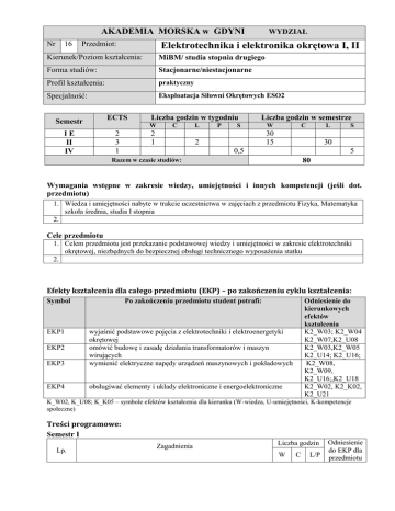 WYDZIAŁ AKADEMIA MORSKA w GDYNI Nr 16 Elektrotechnika i elektronika okrętowa I, II Przedmiot: Kierunek/Poziom kształcenia: MiBM/ studia stopnia drugiego Forma studiów: Stacjonarne/niestacjonarne Profil kształcenia: praktyczny Specjalność: Eksploatacja Siłowni Okrętowych ESO2 Semestr ECTS IE II IV 2 3 1 Liczba godzin w tygodniu W C 2 1 L P Liczba godzin w semestrze S W C L 30 15 2 S 30 0,5 5 Razem w czasie studiów: 80 Wymagania wstępne w zakresie wiedzy, umiejętności i innych kompetencji (jeśli dot. przedmiotu) 1. Wiedza i umiejętności nabyte w trakcie uczestnictwa w zajęciach z przedmiotu Fizyka, Matematyka szkoła średnia, studia I stopnia 2. Cele przedmiotu 1. Celem przedmiotu jest przekazanie podstawowej wiedzy i umiejętności w zakresie elektrotechniki okrętowej, niezbędnych do bezpiecznej obsługi technicznego wyposażenia statku 2. Efekty kształcenia dla całego przedmiotu (EKP) – po zakończeniu cyklu kształcenia: Po zakończeniu przedmiotu student potrafi: Symbol EKP3 wyjaśnić podstawowe pojęcia z elektrotechniki i elektroenergetyki okrętowej omówić budowę i zasadę działania transformatorów i maszyn wirujących wymienić elektryczne napędy urządzeń maszynowych i pokładowych EKP4 obsługiwać elementy i układy elektroniczne i energoelektroniczne EKP1 EKP2 Odniesienie do kierunkowych efektów kształcenia K2_W03; K2_W04 K2_W07,K2_U08 K2_W03,K2_W05 K2_U14; K2_U16; K2_W08, K2_W09, K2_U16;,K2_U18 K2_W02, K2_K02, K2_U21 K_W02, K_U08; K_K05 – symbole efektów kształcenia dla kierunku (W-wiedza, U-umiejętności, K-kompetencje społeczne) Treści programowe: Semestr I Lp. Zagadnienia Liczba godzin W C L/P Odniesienie do EKP dla przedmiotu 1. Pojęcia podstawowe, podział obwodów a) prąd stały, b) przemienny, Elementy obwodu elektrycznego: źródła i odbiorniki prądu, rodzaje strzałkowania, mierniki. 2 EKP2 2. Obwody liniowe prądu elektrycznego: a) definicja prądu elektrycznego, rodzaje przewodzenia prądu, podział materiałów ze względu na przewodzenie prądu, przewodzenie w półprzewodnikach, d) pole elektryczne, natężenie pola elektrycznego, prąd przesunięcia, potencjał elektryczny, pojemność elektryczna, jednostka pojemności, kondensatory, obwód z kondensatorem i rezystancją, stała czasu obwodu z pojemnością, energia naładowanego kondensatora. b) prawo Ohma, wyjaśnienie pojęć: natężenie prądu, napięcie, siła elektromotoryczna, rezystancja, jednostki podstawowe, rezystancja przewodu, rezystywność, przewodność właściwa materiałów, cieplne działanie prądu, moc prądu elektrycznego, c) prawa Kirchhoffa, równania obwodów złożonych prądu stałego, reguły zapisywania równań, opis metod obliczania obwodów złożonych-zasada superpozycji, twierdzenie Thevenina. 6 EKP1 3. Elektromagnetyzm: 4 a) pole magnetyczne, obraz pola, pole prądu elektrycznego, prawo Biota i Savarta, prawo Ampere’a, natężenie pola magnetycznego, pole cewki i przewodu, reguła korkociągu prawoskrętnego, mechaniczne oddziaływanie pola magnetycznego na prąd, prosty model silnika elektrycznego, reguła lewej ręki, indukcja magnetyczna, jednostka indukcji magnetycznej, inne modele siłowego działania pola, reguły kierunkowe działania prądu w polu magnetycznym, b) indukcja elektromagnetyczna, SEM indukcji, strumień magnetyczny, indukcyjność obwodu elektrycznego, jednostka strumienia magnetycznego i indukcyjności, reguły kierunkowe SEM indukcji, obwód z indukcyjnością, stała czasu obwodu z indukcyjnością, energia pola uzwojenia, zasada działania prądnicy elektrycznej, SEM przewodu w polu magnetycznym, c) magnesowanie ciał, przenikalność magnetyczna, rodzaje materiałów magnetycznych, ferromagnetyzm, charakterystyka magnesowania ferromagnetyku, miękkie i twarde materiały magnetyczne, obwód magnetyczny, prawo Ohma dla obwodu magnetycznego, reluktancja, siły magnetyczne w obwodach. Prąd zmienny, sinusoidalny: 10 a) prąd przemienny sinusoidalny jednofazowy, parametry prądu sinusoidalnego (wartość średnia, skuteczna, maksymalna), analityczne, graficzne i symboliczne reprezentacje prądu sinusoidalnego, przesunięcie fazowe prądu i napięcia sinusoidalnego, moc chwilowa, moc średnia. b) proste obwody prądu sinusoidalnego (RL, RC, RLC), reaktancje, impedancja, admitancja, przesunięcie fazowe, prawo Ohma dla obwodów prostych, rezonans szeregowy i równoległy, EKP1 4. EKP2 5. 6. 7. 8. 9. c) równania obwodów prądu sinusoidalnego w przedstawieniu wektorowym (wskazowym)-metoda symboliczna, obwody złożone prądu sinusoidalnego, moc czynna, bierna, pozorna, interpretacje mocy, d) Obwody trójfazowe: wektorowe przedstawienie prądów i napięć 3-fazowych, relacje ilościowe w układzie 3-fazowym, kojarzenie źródeł i odbiorników w układy /Y, symetria lub niesymetria układów 3- fazowych, moce w układach 3-fazowych, moc w układzie 3- i 4 - przewodowym, Wskaźnik kolejności faz. Układy cewek sprzężonych: a) zaciski jednoimienne, schematy zastępcze, współczynnik sprzężenia. b) Przykład zastosowania sprzężenia magnetycznegotransformator Obwody nieliniowe: Metoda analizy obwodów z elementami nieliniowymi Przebiegi odkształcone Szereg Fouriera, analiza harmoniczna, THD Stany przejściowe w obwodach elektrycznych: Obwody liniowe I i II rzędu, składowa przejściowa i ustalona, przepięcia, przetężenia. 3 EKP1 2 EKP1 1 EKP1 1 EKP1 1 EKP2 Semestr II Lp. Zagadnienia 10 Prąd sinusoidalny jedno- i trójfazowy: b) proste obwody prądu sinusoidalnego (RL, RC, RLC) w przedstawieniu czasowym, reaktancje, impedancja, przesunięcie fazowe, prawo Ohma dla obwodów prostych, rezonans szeregowy i równoległy, c) równania obwodów prądu sinusoidalnego w przedstawieniu wektorowym, obwody złożone prądu sinusoidalnego, moce prądu sinusoidalnego w ujęciu wektorowym, moc czynna, bierna, pozorna, interpretacje mocy, d) prądy sinusoidalne trójfazowe, wektorowe przedstawienie prądów i napię