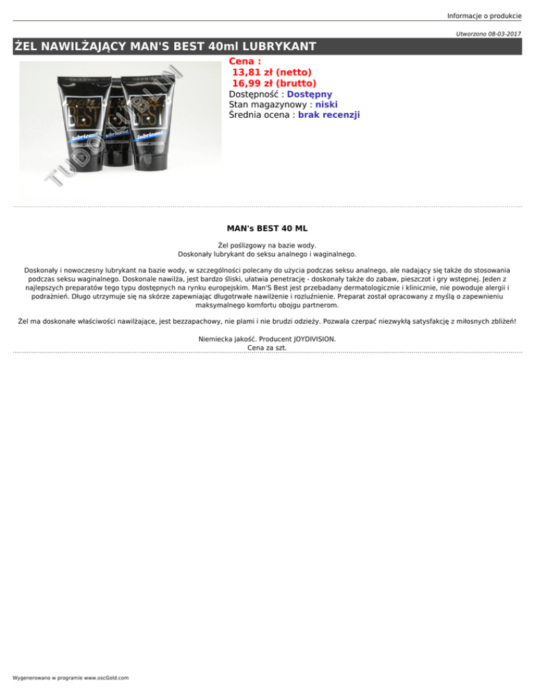 Informacje o produkcie Utworzono 08-03-2017 ŻEL NAWILŻAJĄCY MAN'S BEST 40ml LUBRYKANT Cena : 13,81 zł (netto) 16,99 zł (brutto) Dostępność : Dostępny Stan magazynowy : niski Średnia ocena : brak recenzji MAN's BEST 40 ML Żel poślizgowy na bazie wody. Doskonały lubrykant do seksu analnego i waginalnego. Doskonały i nowoczesny lubrykant na bazie wody, w szczególności polecany do użycia podczas seksu analnego, ale nadający się także do stosowania podczas seksu waginalnego. Doskonale nawilża, jest bardzo śliski, ułatwia penetrację - doskonały także do zabaw, pieszczot i gry wstępnej. Jeden z najlepszych preparatów tego typu dostępnych na rynku europejskim. Man'S Best jest przebadany dermatologicznie i klinicznie, nie powoduje alergii i podrażnień. Długo utrzymuje się na skórze zapewniając długotrwałe nawilżenie i rozluźnienie. Preparat został opracowany z myślą o zapewnieniu maksymalnego komfortu obojgu partnerom. Żel ma doskonałe właściwości nawilżające, jest bezzapachowy, nie plami i nie brudzi odzieży. Pozwala czerpać niezwykłą satysfakcję z miłosnych zbliżeń! Niemiecka jakość. Producent JOYDIVISION. Cena za szt. Wygenerowano w programie www.oscGold.com