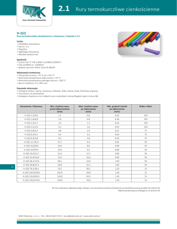 2.1 Rury termokurczliwe cienkościenne H-2(Z) Rury termokurczliwe cienkościenne / elastyczne / niepalne / 2:1 Cechy: • Poliolefina sieciowana • Skurcz: 2:1 • Niepalna • Ogólnego stosowania • Wysoka elastyczność Zgodność: • UL224 125 °C VW-1 600 V certifikat E204071 • CSA certifikat nr.: 1934614 • Spełnia warunki: RoHS, Sony-SS-00259 Właściwości techniczne: • Temperatura pracy: -55 °C do +125 °C • Minimalna temperatura obkurczania: +70 °C • Minimalna temperatura pełnego skurczu: +100 °C • Skurcz wzdłużny: 0 ± 10% max. Pozostałe informacje: • Dostępne kolory: czarny, czerwony, niebieski, żółty, zielony, biały, fioletowy, brązowy • Inne kolory na zamówienie • Dostępne również w mini rolkach oraz w odcinkach różnej długości (patrz strona 36) 24 Oznaczenie / Wymiary Min. średnica wew. przed obkurczeniem (mm) Max. średnica wew. po obkurczeniu (mm) Min. grubość ścianki po obkurczeniu (mm) Rolka / Metr H-2(Z) 1,2/0,6 1,2 0,6 0,33 150 H-2(Z) 1,6/0,8 1,6 0,8 0,36 150 H-2(Z) 2,4/1,2 2,4 1,2 0,44 150 H-2(Z) 3,2/1,6 3,2 1,6 0,44 150 H-2(Z) 4,8/2,4 4,8 2,4 0,51 75 H-2(Z) 6,4/3,2 6,4 3,2 0,56 75 H-2(Z) 9,5/4,8 9,5 4,8 0,56 75 H-2(Z) 12,7/6,4 12,7 6,4 0,65 50 H-2(Z) 16,0/8,0 16,0 8,0 0,69 50 H-2(Z) 19,0/9,5 19,0 9,5 0,80 30 H-2(Z) 25,4/12,7 25,4 12,7 0,90 30 H-2(Z) 32,0/16,0 32,0 16,0 0,90 30 H-2(Z) 38,1/19,0 38,1 19,0 1,00 30 H-2(Z) 50,8/25,4 50,8 25,4 1,00 30 H-2(Z) 76,2/38,1 76,2 38,1 1,20 15 H-2(Z) 102,0/50,8 102,0 50,8 1,30 15 H-2(Z) 126,0/63,5 126,0 63,5 1,30 15 H-2(Z) 150,0/76,0 150,0 76,0 1,30 15 W celu wybrania odpowieniego rodzaju rury termokurczliwej (zestawienie produktów) proszę przejść do strony 62 Tabela porównawcza dostępna na stronie 64 WKK Polska Sp. z o. o. | Tel. +48 42 640 74 91 | [email protected] | www.wkk.com.pl