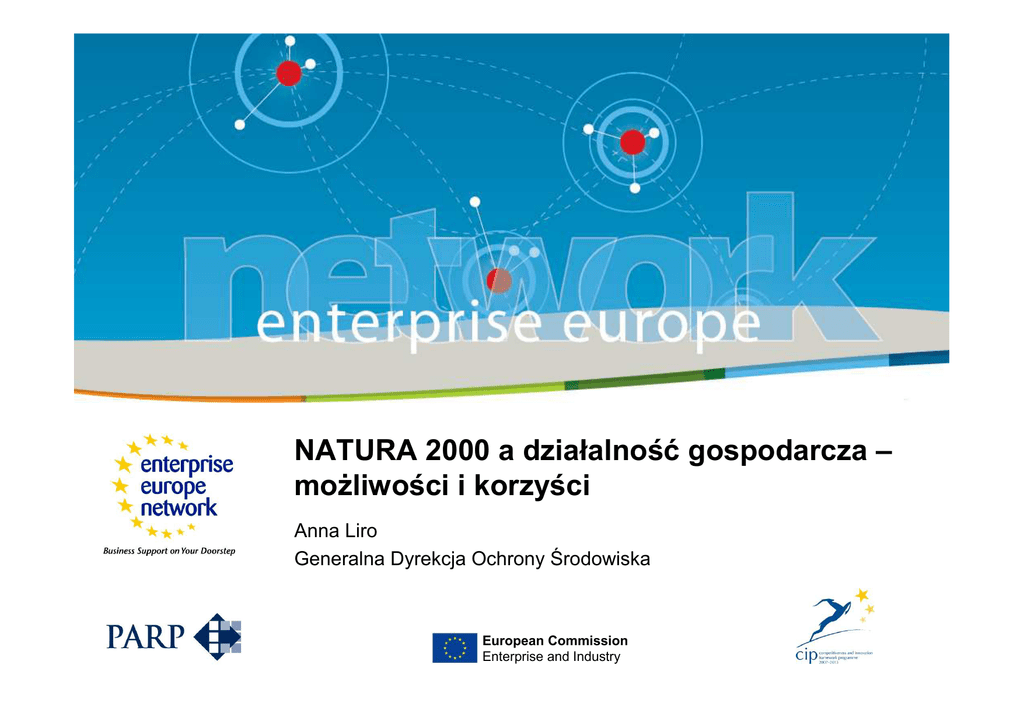 NATURA 2000 a działalność gospodarcza – możliwości i korzyści Anna Liro Generalna Dyrekcja Ochrony Środowiska European Commission Enterprise and Industry Title of the presentation | Date |2 Możliwości • Sieć Natura 2000 - Nowa strategia i plan działań na 2014-2020 • Zbudowanie marki sieci Natura 2000 • Określenie potrzeb i kosztów realizacji sieci Natura 2000 • Innowacyjność • Finansowanie – zwiększenie budżetu i poszukiwanie nowych możliwości wsparcia finansowego np. partnerstwo publiczno-prywatne Title of the presentation | Date |3 Sieć Natura 2000 w Polsce • 958 obszarów Natura 2000 – wymaga nieznacznych uzupełnień • 20% powierzchni kraju w sieci Natura 2000 • 1634 gmin naturowych (>5 ha), w tym 40 gmin położonych jest w całości w obszarach Natura 2000 (2,4% wszystkich gmin) Title of the presentation | Date |4 Nowa Unijna strategia ochrony różnorodności biologicznej i plan działań do 2020 r. (KOM(2011) 244) • Nowe ambitne cele powstrzymania utraty różnorodności biologicznej do 2020 r. – obejmuje: 6 celów: • • • • • • dokończenie tworzenia i wdrożenie sieci Natura 2000 utworzenie zielonej infrastruktury zwiększenie integracja z rolnictwem i leśnictwem zapewnienie zrównoważonego wykorzystania zasobów ryb zwalczanie z obcymi gatunkami inwazyjnymi pomoc na rzecz światowej różnorodności biologicznej 20 działań Title of the presentation | Date |5 Potrzeba zbudowania marki sieci Natura 2000 • Niska świadomość sieci Natura 2000 i traktowanie jako ograniczenie rozwoju gminy czy regionu • Opracowanie Krajowej strategii komunikacji na obszarach Natura 2000 (POIŚ.05.04.00-00-187/09 Sieć Natura 2000 – drogą do rozwoju) • Działania promocyjne – zbudowanie pozytywnego wizerunki marki: na poziomie UE i kraju, na poziomie lokalnym: • komunikacja administracji ze społeczeństwem • zaangażowanie ludzi do działań na rzecz różnorodności biologicznej; • współpraca z głównymi interesariuszami • Zmiana filozofii – łączenie ochrony różnorodności biologicznej z usługami (funkcjami) ekosystemów Title of the presentation | Date |6 Koszty sieci Natura 2000 Koszty wdrażania sieci dla EU 27= 5,7 miliardów € /na rok Problemy PCz w określeniu kosztów i potrzeb dla Natura 2000 Brak planów ochrony dla obszarów Natura 2000 Za finansowanie sieci Natura 2000 odpowiadają Państwa Członkowskie i UE Finansowanie zintegrowane z różnymi funduszami Wykorzystanie środków poniżej oczekiwań Oceniono, że tylko 20% potrzeb finansowych zostało zapewnionych w obecnej perspektywie finansowej Title of the presentation | Date |7 Określenie potrzeb działań • Plany Zadań Ochronnych W latach 2011 - 2014 mają być opracowane 486 PZO i PO. Projekt POIS.05.03.00-00-186/09 "Opracowanie planów zadań ochronnych dla obszarów Natura 2000 na obszarze Polski". • Priorytetowy Plan Działań (PAF) jako podstawa planowania strategicznego dla Natura 2000 w ramach Wieloletnich Ram Finansowych 2014-2020 Title of the presentation | Date |8 Działania ochronne PZO Działania ochronne w PZO powinny realizować konkretne cele ochrony ustalone dla danego obszaru Natura 2000 i prowadzić do: • utrzymania lub przywrócenia właściwego stanu ochrony siedlisk i gatunków • likwidacji lub ograniczenia istniejących i potencjalnych zagrożeń • doskonalenia działań ochronnych Title of the presentation | Date |9 Działania ochronne PZO Działania ochronne powinny ustalać: • rodzaj działań ochronnych • zakresu prac rzeczowych • teren lub miejsce realizacji • termin oraz częstotliwości ich realizacji; • podmiot odpowiedzialny za ich wykonanie i monitorowanie • koszt realizacji Powinny być formułowane według schematu: Co – Ile – Gdzie – Kiedy – Kto - Jaki koszt? Title of the presentation | Date |10 Priorytetowy Plan Działań (PAF) • PAF jest to narzędzie zapewnienia odpowiedniego finansowania sieci Natura 2000 w kolejnej perspektywie finansowej • Ma na celu określenie potrzeb finansowych dla Natura 2000 ze wskazanie odpowiednich funduszy (spójności, strukturalne, rolnicze, LIFE+) i programów operacyjnych, jednakże nie zapewniono formalnego związku PAF z WRF • PAF ma być narzędziem promocji projektów zintegrowanych w ramach LIFE+ • W celu maksymalizacja wpływu PAF - powinien powstać do 2012 r. Title of the presentation | Date |11 Działania związane z zarządzaniem obszarami Natura 2000 • Wyznaczanie obszarów Natura 2000: w tym badania naukowe, projekty pilotażowe, materiały informacyjne • Planowanie zarządzania: przygotowanie PZO/PO • Odtwarzanie siedlisk i gatunków: tworzenie korytarzy ekologicznych, wdrażanie programów zarządzania (program rolnośrodowiskowy, leśnośrodowiskowy, wodnośrodowiskowe, likwidacja gatunków inwazyjnych, odszkodowania za odebrane prawa i stratę przychodów), szkolenia i kształcenie • Monitoring siedlisk i gatunków: prowadzenie ekspertyz,edukacja, szkolenia • Zarządzanie ryzykiem: przygotowanie planów nadzoru i przeciwpożarowych, szkolenia Title of the presentation | Date |12 Działania związane z zarządzaniem obszarami Natura 2000 Koszty inwestycji: •zakup ziemi, odszkodowania za prawa developerskie •Infrastruktura wymagana do odnowy siedlisk i gatunków •Infrastruktura użytku publicznego: oznakowanie, szlaki, punkty widokowe, centra dla gości, kiosków Title of the presentation | Date |13 Możliwości rozwoju przedsiębiorczości w gminie • rozwój rolnictwa ekologicznego, rolnictwo przyjazne dla środowiska i różnorodności biologicznej: ekologiczne, integrowane i obsługa tej produkcji w specjalistyczne środki produkcji, maszyny, usługi • prowadzenie upraw i hodowli ras i odmian rodzimych • przetwórstwo i produkcja wyrobów certyfikowanych i budowanie rynku dla tych wyrobów; • produkcja i przetwarzanie biomasy jako „zielone” źródła energii • pszczelarstwo i inne n