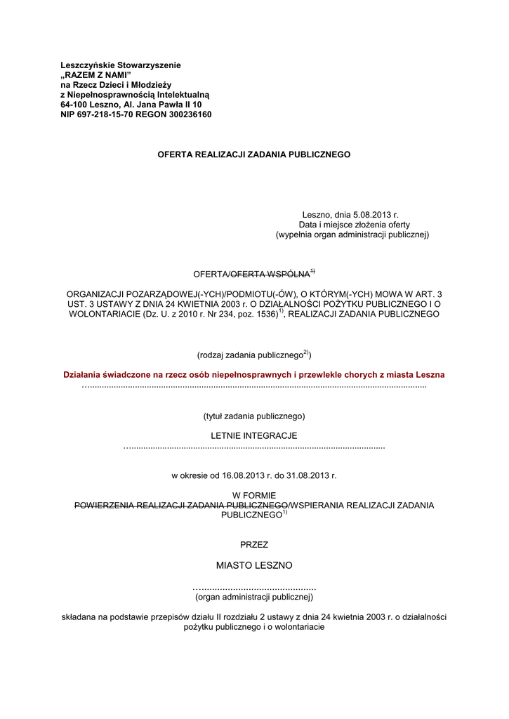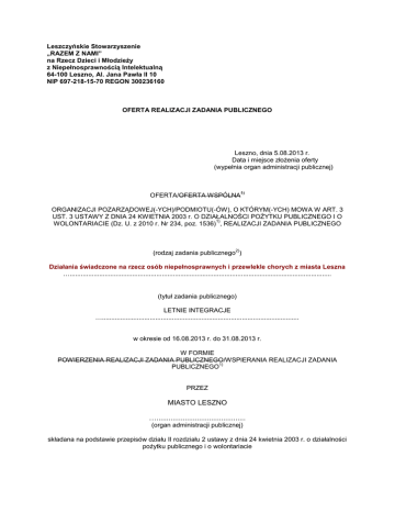 Leszczyńskie Stowarzyszenie „RAZEM Z NAMI” na Rzecz Dzieci i Młodzieży z Niepełnosprawnością Intelektualną 64-100 Leszno, Al. Jana Pawła II 10 NIP 697-218-15-70 REGON 300236160 OFERTA REALIZACJI ZADANIA PUBLICZNEGO Leszno, dnia 5.08.2013 r. Data i miejsce złożenia oferty (wypełnia organ administracji publicznej) OFERTA/OFERTA WSPÓLNA 1) ORGANIZACJI POZARZĄDOWEJ(-YCH)/PODMIOTU(-ÓW), O KTÓRYM(-YCH) MOWA W ART. 3 UST. 3 USTAWY Z DNIA 24 KWIETNIA 2003 r. O DZIAŁALNOŚCI POŻYTKU PUBLICZNEGO I O 1) WOLONTARIACIE (Dz. U. z 2010 r. Nr 234, poz. 1536) , REALIZACJI ZADANIA PUBLICZNEGO 2) (rodzaj zadania publicznego ) Działania świadczone na rzecz osób niepełnosprawnych i przewlekle chorych z miasta Leszna ….............................................................................................................................................. (tytuł zadania publicznego) LETNIE INTEGRACJE …........................................................................................................... w okresie od 16.08.2013 r. do 31.08.2013 r. W FORMIE POWIERZENIA REALIZACJI ZADANIA PUBLICZNEGO/WSPIERANIA REALIZACJI ZADANIA 1) PUBLICZNEGO PRZEZ MIASTO LESZNO …............................................ (organ administracji publicznej) składana na podstawie przepisów działu II rozdziału 2 ustawy z dnia 24 kwietnia 2003 r. o działalności pożytku publicznego i o wolontariacie I. Dane oferenta/oferentów 1), 3) 1) nazwa: Leszczyńskie Stowarzyszenie „RAZEM Z NAMI” na Rzecz Dzieci i Młodzieży z Niepełnosprawnością Intelektualną. 4) 2) forma prawna: (X) stowarzyszenie () fundacja ( ) kościelna osoba prawna () kościelna jednostka organizacyjna ( ) spółdzielnia socjalna () inna............................................. 5) 3) numer w Krajowym Rejestrze Sądowym, w innym rejestrze lub ewidencji: KRS 0000248353 z dn. 11.01.2006r. 6) 4) data wpisu, rejestracji lub utworzenia: 11.11.2005r. 5) nr NIP: 697 218 1570 nr REGON: 300236160 6) adres: Miejscowość: Leszno, Aleje Jana Pawła II 10 gmina: Leszno powiat: 8) leszczyński województwo: wielkopolskie kod pocztowy: 64-100 7) tel.: 65 520 40 04 poczta: Leszno faks: 65 520 40 04 e-mail: [email protected] http:// ...... 8) numer rachunku bankowego: 43 1240 1499 1111 0010 0961 7590 nazwa banku: PKO S.A 1) 9) nazwiska i imiona osób upoważnionych do reprezentowania oferenta/oferentów : a) Urszula Osiejewska – prezes Stowarzyszenia b) Wioletta Lewandowska – wiceprezes Stowarzyszenia c) Ewa Nowak – skarbnik Stowarzyszenia 10) nazwa, adres i telefon kontaktowy jednostki organizacyjnej bezpośrednio wykonującej zadanie, o którym mowa w ofercie: 9) Leszczyńskie Stowarzyszenie „RAZEM Z NAMI” na Rzecz Dzieci i Młodzieży z Niepełnosprawnością Intelektualną. 64-100 Leszno, Aleje Jana Pawła II 10, tel.: 65 520 40 04 11) osoba upoważniona do składania wyjaśnień dotyczących oferty (imię i nazwisko oraz nr telefonu kontaktowego) Izabela Otto: 609750109 12) przedmiot działalności pożytku publicznego: a) działalność nieodpłatna pożytku publicznego a) działalność nieodpłatna pożytku publicznego - rozwijanie wszechstronnej pomocy dzieciom i młodzieży z niepełnosprawnością intelektualną w ich rozwoju, samorealizacji i adaptacji życiowej; - pomoc dzieciom i młodzieży z niepełnosprawnością intelektualną w przystosowaniu do życia społecznego, - popularyzowanie i stosowanie/realizowanie różnorodnych form rehabilitacji i rewalidacji dzieci i młodzieży z niepełnosprawnością intelektualną; - wspieranie inicjatyw zmierzających do integracji społecznej. b) działalność odpłatna pożytku publicznego 1) 1) 13) jeżeli oferent/oferenci prowadzi/prowadzą działalność gospodarczą: a) numer wpisu do rejestru przedsiębiorców b) przedmiot działalności gospodarczej Nie dotyczy. II. Informacja o sposobie reprezentacji oferentów wobec organu administracji publicznej 10) wraz z przytoczeniem podstawy prawnej Nie dotyczy. III. Szczegółowy zakres rzeczowy zadania publicznego proponowanego do realizacji 1. Krótka charakterystyka zadania publicznego Zadanie publiczne dotyczy organizacji zajęć edukacyjno-rekreacyjnych w czasie wakacji letnich dla młodzieży z niepełnosprawnością intelektualną z miasta Leszna we współpracy z wolontariuszami PCK. 2. Opis potrzeb wskazujących na konieczność wykonania zadania publicznego, opis ich przyczyn oraz skutków Organizacja tego typu zajęć jest niezwykle ważna i konieczna z punktu widzenia zapotrzebowania społecznego. Po zakończeniu roku szkolnego młodzież z niepełnosprawnością intelektualną zostaje praktycznie pozbawiona możliwości udziału w życiu kulturalnym, wielkim ograniczeniem jest ponadto utrudniony kontakt z rówieśnikami oraz korzystanie z atrakcyjnych form spędzania czasu wolnego. Oferta wakacyjnych zajęć edukacyjno-rekreacyjnych jest bardzo wąska, zwłaszcza dla osób z niepełnosprawnością intelektualną. Niewielki procent tego środowiska wyjeżdża także na zorganizowane formy wypoczynku. Taki stan rzeczy prowadzi do marginalizacji społecznej oraz powszechnej frustracji i apatii niepełnosprawnej młodzieży. Chcąc zatem wyjść naprzeciw owemu zapotrzebowaniu i zniwelować negatywne skutki tego rodzaju ograniczeń, proponujemy atrakcyjne zajęcia wykorzystujące miejscową bazę kulturalną, sportową i rekreacyjną oraz doświadczenie i zapał terapeutów i młodych wolontariuszy Polskiego Czerwonego Krzyża. Dodatkową wartością płynącą z projektu jest propagowanie wśród zdrowej młodzieży (PCK) postaw prointegracyjnych. 3. Opis grup adresatów zadania publicznego Adresatem zadania publicznego jest młodzież z niepełnosprawnością intelektualną z miasta Leszna. Zadaniem zostanie objętych 15 osób z niepełnosprawnością intelektualną oraz 4 wolontariuszy Polskiego Czerwonego Krzyża w Lesznie. 4. Uzasadnienie potrzeby dofinansowania z dotacji inwestycji związanych z 