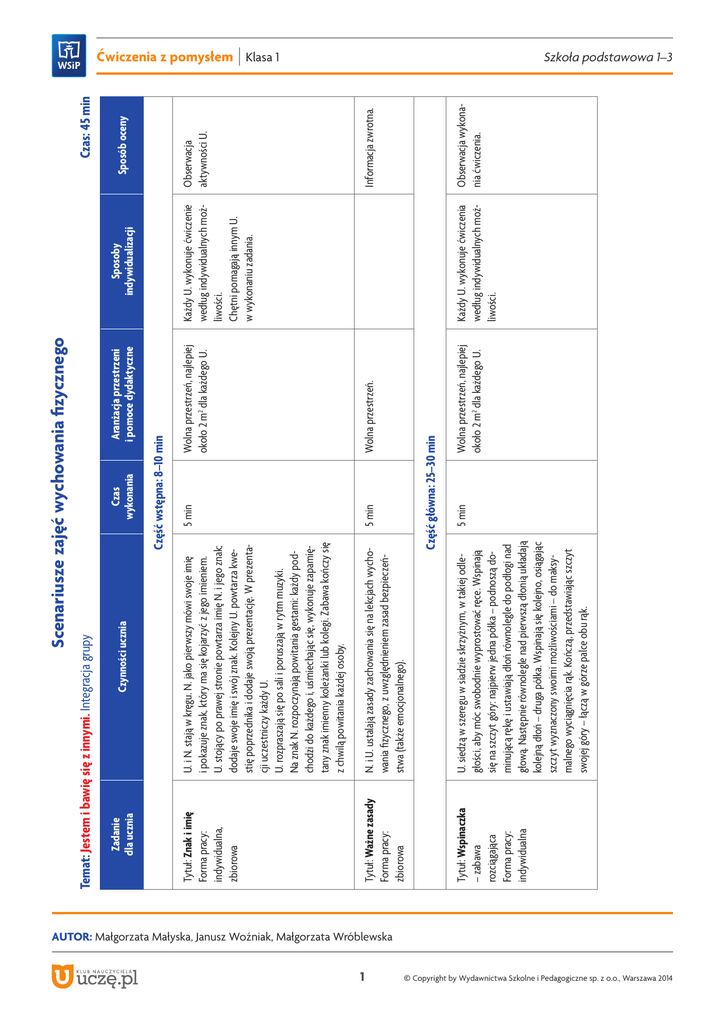 1 Tytuł: Wspinaczka – zabawa rozciągająca Forma pracy: indywidualna Tytuł: Ważne zasady Forma pracy: zbiorowa Tytuł: Znak i imię Forma pracy: indywidualna, zbiorowa Zadanie dla ucznia Czas wykonania Aranżacja przestrzeni i pomoce dydaktyczne 5 min Wolna przestrzeń. Wolna przestrzeń, najlepiej około 2 m2 dla każdego U. U. siedzą w szeregu w siadzie skrzyżnym, w takiej odległości, aby móc swobodnie wyprostować ręce. Wspinają się na szczyt góry: najpierw jedna półka – podnoszą dominującą rękę i ustawiają dłoń równolegle do podłogi nad głową. Następnie równolegle nad pierwszą dłonią układają kolejną dłoń – druga półka. Wspinają się kolejno, osiągając szczyt wyznaczony swoimi możliwościami – do maksymalnego wyciągnięcia rąk. Kończą, przedstawiając szczyt swojej góry – łączą w górze palce obu rąk. 5 min Wolna przestrzeń, najlepiej około 2 m2 dla każdego U. Część główna: 25–30 min N. i U. ustalają zasady zachowania się na lekcjach wychowania fizycznego, z uwzględnieniem zasad bezpieczeństwa (także emocjonalnego). 5 min Część wstępna: 8–10 min U. i N. stają w kręgu. N. jako pierwszy mówi swoje imię i pokazuje znak, który ma się kojarzyć z jego imieniem. U. stojący po prawej stronie powtarza imię N. i jego znak; dodaje swoje imię i swój znak. Kolejny U. powtarza kwestię poprzednika i dodaje swoją prezentację. W prezentacji uczestniczy każdy U. U. rozpraszają się po sali i poruszają w rytm muzyki. Na znak N. rozpoczynają powitania gestami: każdy podchodzi do każdego i, uśmiechając się, wykonuje zapamiętany znak imienny koleżanki lub kolegi. Zabawa kończy się z chwilą powitania każdej osoby. Czynności ucznia Temat: Jestem i bawię się z innymi. Integracja grupy Scenariusze zajęć wychowania fizycznego Każdy U. wykonuje ćwiczenia według indywidualnych możliwości. Każdy U. wykonuje ćwiczenie według indywidualnych możliwości. Chętni pomagają innym U. w wykonaniu zadania. Sposoby indywidualizacji Obserwacja wykonania ćwiczenia. Informacja zwrotna. Obserwacja aktywności U. Sposób oceny Czas: 45 min Ćwiczenia z pomysłem | Klasa 1 Szkoła podstawowa 1–3 Autor: Małgorzata Małyska, Janusz Woźniak, Małgorzata Wróblewska © Copyright by Wydawnictwa Szkolne i Pedagogiczne sp. z o.o., Warszawa 2014 2 U. z dwóch rzędów tworzą dwa kręgi – wewnętrzny i zewnętrzny. Trzymając się za ręce, naśladują bieg koni – cwałują w rytm muzyki (8 kroków w prawo i 8 kroków w lewo). Następnie koła cwałują w przeciwnych kierunkach. N. mówi, że cwał to najszybszy typ chodu końskiego. Rozmowa: co można zobaczyć, cwałując; jakie obrazy U. zapamiętali z chwili poruszania się cwałem. U. stają ponownie parami i chwytają się jak przy zabawie „Siała baba mak”. Poruszają się w rytm deklamowanego przez N. tekstu: Krakowianka jedna miała chłopca z drewna, a buciki z wosku, wszystko po krakowsku. Tytuł: Chwyt w tańcu – zabawa muzyczno-ruchowa. Nauka kroku tańca Forma pracy: grupowa U. w rytm muzyki rozpraszają się po sali. Na sygnał N. zatrzymują się i w zależności od liczby dźwięków (lub wskazania na kostce) biegają: – dwójkami; – trójkami; – czwórkami; – ustawiają się dwójkami w rzędach. Tytuł: Berek grupujący Forma pracy: indywidualna Tytuł: Cwał – zabawa muzyczno-ruchowa. Nauka kroku tańca Forma pracy: grupowa U. stoją w kręgu. Po usłyszeniu muzyki maszerują rytmicznie po kole w prawą stronę. Na znak N. zaczynają cwałować w tę samą stronę. Następnie maszerują po kole w przeciwną stronę, na znak N. rozpoczynają cwał. Wyciszenie muzyki. U. dobierają się parami (np. chwytają za rękę osobę z prawej strony). W parach stają naprzeciwko siebie (tworząc dwa koła). Poruszają się w prawą stronę, wyklaskują rytm, po 8 krokach zmieniają kierunek, po następnych 8 krokach zewnętrzne koło maszeruje w tym samym kierunku, wewnętrzne w przeciwnym. Czynności ucznia Tytuł: Zatrzymany taniec – zabawa organizująca grupę. Wstęp do nauki tańca Forma pracy: indywidualna Zadanie dla ucznia 2 min 3 min 5 min 5 min Czas wykonania Wolna przestrzeń. U. stoją w kręgu. Tamburyn. Wolna przestrzeń. U. stoją w kręgu. Tamburyn. Wolna przestrzeń. U. stoją w kręgu. Tamburyn. Wolna przestrzeń. U. stoją w kręgu. Tamburyn. Aranżacja przestrzeni i pomoce dydaktyczne Każdy U. wykonuje ćwiczenie według indywidualnych możliwości. Chętni pomagają innym, inicjując wskazane przez N. zmiany w ruchu. Każdy U. wykonuje ćwiczenie według indywidualnych możliwości. Chętni pomagają innym, inicjując wskazane przez N. zmiany w ruchu. Każdy U. wykonuje ćwiczenie według indywidualnych możliwości. Każdy U. wykonuje ćwiczenie według indywidualnych możliwości. Sposoby indywidualizacji Obserwacja wykonania ćwiczenia. Informacja zwrotna U. Obserwacja wykonania ćwiczenia. Informacja zwrotna U. Obserwacja wykonania ćwiczenia. Obserwacja wykonania ćwiczenia. Sposób oceny Ćwiczenia z pomysłem | Klasa 1 Szkoła podstawowa 1–3 Autor: Małgorzata Małyska, Janusz Woźniak, Małgorzata Wróblewska © Copyright by Wydawnictwa Szkolne i Pedagogiczne sp. z o.o., Warszawa 2014 Tytuł: Krakowiak – taniec integracyjny Forma pracy: zbiorowa Zadanie dla ucznia U. dowiadują się, że poznawali kolejne układy choreograficzne (fragmenty) krakowiaka. Przystępują do nauki całego układu. U. stoją parami, tworząc koło. 1. Krakowiaczek jeden miał koników siedem, pojechał na wojnę, został mu się jeden. Trzymając się za ręce, U. maszerują rytmicznie w prawo. 2.Siedem lat wojował, szabli nie wyjmował, U. ustawieni twarzami do siebie, z uniesionymi do góry prawymi rękami, cwałują w przeciwnych kierunkach (każdy za swoją prawą ręką). Szabla zardzewiała, wojny nie widziała. Zmiana kierunków tańca, cwał z podniesioną lewą ręką. Na koniec zeskok, zatrzymanie się i z