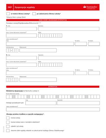 DEP Dyspozycja wypłaty w trakcie Okresu Lokaty* po zakończeniu Okresu Lokaty* Dotyczy lokat z grupy Direct DANE OSOBY SKŁADAJĄCEJ DYSPOZYCJĘ Posiadacz Lokaty/Współposiadacz/Pełnomocnik¹ ** 1. Imię Nazwisko Seria i numer dokumentu tożsamości2 PESEL Adres zameldowania3 Ulica Kod pocztowy Nr domu Nr lokalu Nr domu Nr lokalu Miejscowość 2. Imię Nazwisko Seria i numer dokumentu tożsamości2 PESEL Adres zameldowania3 Ulica Kod pocztowy Miejscowość DYSPOZYCJA Składam/y dyspozycję do Rachunku Lokaty nr Numer Rachunku Lokaty Imię Nazwisko którego posiadaczem jest Adres zameldowania3 Zlecając przelew środków w sposób następujący*: kwota Lokaty [D_ZL_w.5.0] kwota Lokaty wraz z narosłymi odsetkami4 odsetki4 od Lokaty zlecenie stałe wypłaty odsetek na zakończenie każdego Okresu Odsetkowego5 na Rachunek Rozliczeniowy nr Numer Rachunku Rozliczeniowego Prowadzony w6 Imię Nazwisko którego posiadaczem jest7 Adres zameldowania3,8 kwota4 PLN na Rachunek Rozliczeniowy nr: Numer Rachunku Rozliczeniowego Prowadzony w6 Imię którego posiadaczem Nazwisko jest7 Adres zameldowania3,8 kwota4 PLN na Rachunek Lokaty nr: Numer Rachunku Lokaty prowadzonej w Santander Consumer Bank S.A. Złożona dyspozycja jest wiążąca dla Banku pod warunkiem jej potwierdzenia zgodnie z postanowieniami Regulaminu dotyczącymi formy i trybu składania dyspozycji, obowiązującego do lokaty, do której składana jest dyspozycja. * wstawić X przy wybranej opcji z uwzględnieniem postanowień Umowy; ** niepotrzebne skreślić 1 dyspozycje składane przez pełnomocników mogą być złożone i potwierdzone wyłącznie w Oddziale Banku zajmującym się obsługą lokat z grupy Direct; 2 dla obywateli polskich obowiązującym dokumentem tożsamości jest dowód osobisty; 3 ulica, numer domu, numer lokalu, kod pocztowy, miasto; 4 kwota odsetek jest naliczona przez Bank według stanu prawnego obowiązującego w dniu składania dyspozycji i może ulec zmianie w przypadku zmiany przepisów prawa obowiązujących w dniu poboru podatku; 5 opcja dotyczy wyłącznie Lokaty Direct Premium, zaznaczenie tej opcji dla lokaty innej niż Direct Premium nie jest skuteczne; 6 nazwa banku; 7 imię i nazwisko posiadacza rachunku; 8 dotyczy wyłącznie przypadków, kiedy posiadaczem rachunku jest osoba inna niż Posiadacz Lokaty; 1. Podpis osoby składającej dyspozycję 2. Podpis osoby składającej dyspozycję ADNOTACJE ODDZIAŁU BANKU Dyspozycja potwiedzona w Oddziale Data potwierdzenia Pieczęć i podpis pracownika [D_ZL_w.5.0] Adnotacje Banku Dyspozycja przekazana do potwierdzenia telefonicznego Data wpływu dyspozycji do Oddziału Pieczęć i podpis pracownika