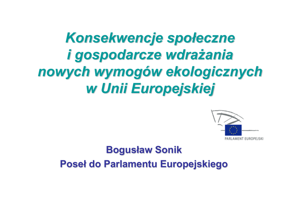 Konsekwencje społeczne i gospodarcze wdrażania nowych wymogów ekologicznych w Unii Europejskiej Bogusław Sonik Poseł do Parlamentu Europejskiego EKOLOGICZNE WYZWANIA DLA GOSPODARKI Cele cyklu konferencji: • Stworzenie forum dyskusyjnego na temat kosztów ekologicznych działalności gospodarczej oraz skutków wdrażania ekologicznego prawa wspólnotowego dla polskiej gospodarki • Dostarczenie informacji społeczeństwu (za pośrednictwem mediów i organizacji pozarządowych) na temat skutków wprowadzania przez Unię Europejską nowych instrumentów rynkowych w ochronie środowiska • Prezentacja zamierzeń Unii Europejskiej dotyczących wdrażania nowych instrumentów rynkowych w dziedzinie ochrony środowiska EKOLOGICZNE WYZWANIA DLA GOSPODARKI Cykl konferencji: 1. „Ochrona klimatu - hamulec czy bodziec dla gospodarki?” – 4 lipca 2008 2. „Wizja społeczeństwa recyklingu” (gospodarka odpadami) – jesień 2008 3. „Biopaliwa – szansą przyszłości czy pomyłką?” (ograniczenie emisji zanieczyszczeń z transportu samochodowego i stosowanie biopaliw) – wiosna 2009 Nowa legislacja UE • Instrumenty prawne proponowane w ramach pakietu energetyczno – klimatycznego: – – – – Rozszerzenie wspólnotowego systemu handlu uprawnieniami do emisji gazów cieplarnianych (propozycja zmiany Dyrektywy) Starania zmierzające do ograniczenia emisji gazów cieplarnianych (propozycja Decyzji Parlamentu i Rady) Geologiczne składowanie dwutlenku węgla (propozycja Dyrektywy) Promocja stosowania energii ze źródeł odnawialnych (propozycja Dyrektywy) Rozszerzenie wspólnotowego systemu handlu uprawnieniami do emisji gazów cieplarnianych (1) • System handlu emisjami UE (ETS) - jest to pierwszy międzynarodowy system odnoszący się do emisji CO2 • Obejmuje ponad 10 000 instalacji w sektorach energetyki i przemysłu • Sektory te ponoszą odpowiedzialność za blisko 50 % unijnych emisji CO2 oraz 40% całkowitych emisji gazów cieplarnianych w UE • Kwestia fundamentalna w ramach strategii UE na rzecz zwalczania zmian klimatycznych Rozszerzenie wspólnotowego systemu handlu uprawnieniami do emisji gazów cieplarnianych (2) • Przegląd dyrektywy i konieczność jej zmiany wynika z przyjętego w styczniu b.r. pakietu energetyczno – klimatycznego • 100 % przydziałów na emisję CO2 dla energetyki na aukcji od 2013 roku • Pozostałe sektory gospodarki od 2020 roku • Sprawozdawczyni Avril Doyle napisała w swoim Raporcie: „Rozsądne jest 100% licytowanie dla sektora energetycznego od 2013 r. biorąc pod uwagę wyraźną możliwość, by sektor ten przełożył w razie konieczności wszelkie uzasadnione koszty na konsumenta”. Rozszerzenie wspólnotowego systemu handlu uprawnieniami do emisji gazów cieplarnianych (3) • Energetyka powinna mieć możliwość stopniowego dostosowywania się do nabywania 100 % uprawnień do emisji CO2 na aukcji • Czas potrzebny na modernizację i wdrażania nowoczesnych niskoemisyjnych technologii Skutki: • Wprowadzenie 100 % uprawnień na emisję spowoduje w Polsce gwałtowny wzrost cen energii elektrycznej • Wzrost kosztów wytwarzania spowoduje obniżenie konkurencyjności gospodarek z energetyką opartą na węglu • Problemy społeczne Rozszerzenie wspólnotowego systemu handlu uprawnieniami do emisji gazów cieplarnianych (4) • Problem dotyczy to także sektora ciepłownictwa sieciowego i elektrociepłowni Skutki: • Drastyczny wzrost cen ciepła • Odbiorcy ciepła będą wybierać tańsze indywidualne rozwiązania stosując gorszej jakości paliwo i niskosprawne piece • Efekt – niekontrolowane pogorszenie jakości powietrza Geologiczne składowanie dwutlenku węgla (1) • Dyrektywa wyznacza warunki dotyczące wykorzystania w Europie technologii wychwytywania i składowania dwutlenku węgla (technologii CCS) • Technologia CCS nie jest pozytywnie odbierana przez wszystkich specjalistów w zakresie ochrony środowiska • Zakopywanie CO2 trudno jest nazwać idealnie „zielonym” rozwiązaniem • Założenie - technologia pomostowa • Pomoże naszej cywilizacji przemysłowej zyskać na czasie, aby wypracować rozwiązania alternatywne Geologiczne składowanie dwutlenku węgla (2) • Zobowiązane – do roku 2020 nowe obiekty energetyczne o dużej mocy (pow. 300 MW) muszą zastosować technologię CCS • Polska widzi problem z realizacją tego zobowiązania • Struktura geologiczna Polski nie jest dostatecznie rozpoznana pod względem przydatności do magazynowania CO2 Promocja stosowania energii ze źródeł odnawialnych (1) • Przyszłość energetyki - UE znajduje się na rozdrożu • Nie ma idealnego rozwiązania problemów klimatycznych i energetycznych • Należy realizować wielokierunkowe podejście, którego głównymi filarami będą: – – – zwiększona wydajność energetyczna stopniowa rezygnacja z paliw kopalnych zakrojone na dużą skalę inwestycje w badania nad zastosowaniem alternatywnych źródeł energii, a przede wszystkim energii odnawialnej Promocja stosowania energii ze źródeł odnawialnych (2) Cele nowej Dyrektywy: • 20% udział źródeł energii odnawialnej w zużyciu energii do roku 2020 • 10% udział wykorzystania biopaliw w transporcie do roku 2020 Nowa dyrektywa w sprawie odpadów (1) • • Parlament Europejski przyjął 17 czerwca 2008 r. nową dyrektywę w sprawie odpadów Nowa dyrektywa - ma dać podstawy do stworzenia w Europie „społeczeństwa powszechnie stosującego recykling” • Przed państwami członkowskimi postawione zostały bardzo ambitne cele • Do roku 2020 odzysk z odpadów z gospodarstw domowych - 50 % (papier, metal, plastik, szkło) Nowa dyrektywa w sprawie odpadów (2) • Absolutna rewolucja w zarządzaniu odpadami w wielu krajach (m.in. w Polsce) • Polska już w tej chwili ma problemy ze spełnieniem wspólnotowych standardów w zakresie gospodarki odpadami komunalnymi • Czy poradzimy sobie z wypełnieniem nowych rygorys