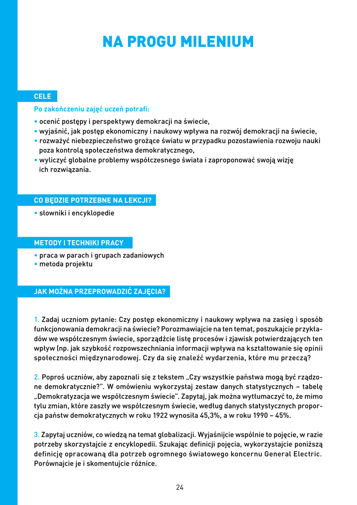 NA PROGU MILENIUM CELE Po zakończeniu zajęć uczeń potrafi: • ocenić postępy i perspektywy demokracji na świecie, • wyjaśnić, jak postęp ekonomiczny i naukowy wpływa na rozwój demokracji na świecie, • rozważyć niebezpieczeństwo grożące światu w przypadku pozostawienia rozwoju nauki poza kontrolą społeczeństwa demokratycznego, • wyliczyć globalne problemy współczesnego świata i zaproponować swoją wizję ich rozwiązania. CO BĘDZIE POTRZEBNE NA LEKCJI? • słowniki i encyklopedie METODY I TECHNIKI PRACY • praca w parach i grupach zadaniowych • metoda projektu JAK MOŻNA PRZEPROWADZIĆ ZAJĘCIA? 1. Zadaj uczniom pytanie: Czy postęp ekonomiczny i naukowy wpływa na zasięg i sposób funkcjonowania demokracji na świecie? Porozmawiajcie na ten temat, poszukajcie przykładów we współczesnym świecie, sporządźcie listę procesów i zjawisk potwierdzających ten wpływ (np. jak szybkość rozpowszechniania informacji wpływa na kształtowanie się opinii społeczności międzynarodowej. Czy da się znaleźć wydarzenia, które mu przeczą? 2. Poproś uczniów, aby zapoznali się z tekstem „Czy wszystkie państwa mogą być rządzone demokratycznie?”. W omówieniu wykorzystaj zestaw danych statystycznych – tabelę „Demokratyzacja we współczesnym świecie”. Zapytaj, jak można wytłumaczyć to, że mimo tylu zmian, które zaszły we współczesnym świecie, według danych statystycznych proporcja państw demokratycznych w roku 1922 wynosiła 45,3%, a w roku 1990 – 45%. 3. Zapytaj uczniów, co wiedzą na temat globalizacji. Wyjaśnijcie wspólnie to pojęcie, w razie potrzeby skorzystajcie z encyklopedii. Szukając definicji pojęcia, wykorzystajcie poniższą definicję opracowaną dla potrzeb ogromnego światowego koncernu General Electric. Porównajcie je i skomentujcie różnice. 24 Wg publikacji General Electric Company globalizacja to dążenie do wzrostu dochodów poprzez zwiększenie wpływów na rynku światowym. Koncern chce to osiągnąć poprzez: - zakup materiałów, komponentów i produktów tam, gdzie najtaniej, aby zachować konku rencyjną pozycję na rynku, - poprzez „łowców głów” chce korzystać z kapitału intelektualnego reprezentowanego przez pracowników na całym świecie. Planuje, że w XXI wieku produkty i usługi GE będą projektowane i dostarczane przez najzdolniejszych ludzi z całego świata i dla całego świata. 4. Wykorzystaj ćwiczenie „Globalizacja i ty” – poleć uczniom, aby pracując w parach, spróbowali znaleźć jak najwięcej przykładów globalizacji w różnych dziedzinach życia: – gospodarce, kulturze, informacji, technologii, a nawet kuchni i modzie. Każdy z nich powinien ustalić, z iloma przejawami globalizacji zetknął się w ciągu ostatniego tygodnia; – ci, którzy wymienią ich najwięcej, zasłużą na miano „megaglobalisty”. Poproś,aby ocenili, które z nich budzą ich pozytywne, a które negatywne emocje. W parach uczniowie powinni ocenić szanse, które stwarza globalizacja, i zagrożenia, które ze sobą niesie. Czy ich zdaniem można jakoś przeciwdziałać zjawiskom negatywnym?Kto i w jaki sposób może je wyeliminować? Czy są na to jakieś przykłady? W podsumowaniu wykorzy staj informacje z tekstu „Świat jako globalna wioska?” 5. Zaproponuj uczniom poszukanie odpowiedzi na pytanie: Dokąd zmierza świat? Zwróć uwagę, że – czy to się nam podoba, czy nie – żyjemy w globalnej wiosce, w której nasze życie w znacznym stopniu zależy od tego, co dzieje się w innych krajach, a nawet na innych kontynentach. Ich problemy są (lub w każdej chwili mogą się stać)problemami całe go świata, a więc także naszymi. Poleć im, aby się wspólnie zastanowili, jakie największe wyzwania stoją przed współczesnym światem, a następnie poszukali i przedstawili własną wizję ich rozwiązania. Aby to zrobić sprawnie: - podziel uczniów na czteroosobowe grupy, które wypiszą istotne dla współczesnego świata problemy, - następnie połączą je w szersze kategorie, np.: bezpieczeństwo, ekonomia, ekologia, kultura, religia, choroby cywilizacyjne, patologie społeczne, - grupy uzgodnią między sobą, jaką kategorią problemów się zajmą (lub jakim konkretnym zagadnieniem), - sprawozdawcy zdają relację z pracy zespołowej, przedstawiają wybór swojej grupy, uzasadniają go. Dalsza praca będzie polegała na pogłębieniu wybranego zagadnienia poprzez wypracowanie „wytycznych dla świata”. Wybrany problem uczniowie przeanalizują, pracując metodą projektu. 25 MATERIAŁY DLA UCZNIÓW Czy wszystkie państwa mogą być rządzone demokratycznie? Władzę we współczesnych państwach sprawują albo politycy (w demokracji), albo wojskowi (w ustrojach autorytarnych), albo odwołujący się do różnych ideologii autokraci (w państwach komunistycznych lub teokratycznych). Formalnie ponad 40% państw na świecie spełnia podstawowe kryteria demokracji, spośród ponad 190 państw należących do ONZ stabilnych państw demokratycznych jest jednak nie więcej niż 30-40. Nie jest to liczba wysoka, są to jednak państwa bogate, najbardziej rozwinięte gospodarczo, dysponujące też największym potencjałem militarnym. Liczba państw demokratycznych się zmienia w niektórych krajach armia lub partia, która siłą przejęła władzę, zarządza po pewnym czasie wolne wybory, w innych – zwykle wskutek ostrych konfliktów wewnętrznych lub wręcz wojny domowej – kres ustrojowi demokratycznemu kładzie zamach stanu. Przy wszystkich zaletach demokracji nie zawsze potrafi ona bowiem stworzyć i utrzymać ład państwowy. Dlatego też – co może zrazu wydać się dziwne – wiele wojskowych zamachów stanu cieszy się poparciem rodzimej ludności i rządów innych państw demokratycznych. Problem polega jednak na tym, że ci, którzy we własnym przekonaniu ratują ojczyznę, zazwyczaj nie chcą oddać władzy reprezentantom społeczeństw