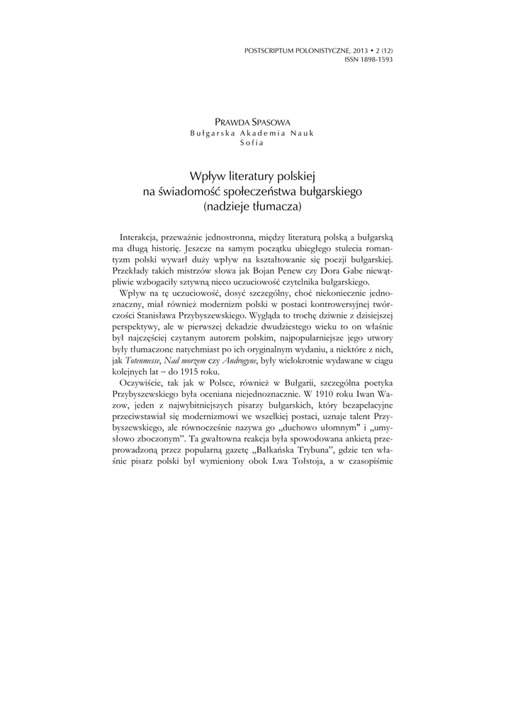 POSTSCRIPTUM POLONISTYCZNE, 2013 • 2 (12) ISSN 1898-1593 PRAWDA SPASOWA Bułgarska Akademia Nauk Sofia Wpływ literatury polskiej na świadomość społeczeństwa bułgarskiego (nadzieje tłumacza) Interakcja, przeważnie jednostronna, między literaturą polską a bułgarską ma długą historię. Jeszcze na samym początku ubiegłego stulecia romantyzm polski wywarł duży wpływ na kształtowanie się poezji bułgarskiej. Przekłady takich mistrzów słowa jak Bojan Penew czy Dora Gabe niewątpliwie wzbogaciły sztywną nieco uczuciowość czytelnika bułgarskiego. Wpływ na tę uczuciowość, dosyć szczególny, choć niekoniecznie jednoznaczny, miał również modernizm polski w postaci kontrowersyjnej twórczości Stanisława Przybyszewskiego. Wygląda to trochę dziwnie z dzisiejszej perspektywy, ale w pierwszej dekadzie dwudziestego wieku to on właśnie był najczęściej czytanym autorem polskim, najpopularniejsze jego utwory były tłumaczone natychmiast po ich oryginalnym wydaniu, a niektóre z nich, jak Totenmesse, Nad morzem czy Androgyne, były wielokrotnie wydawane w ciągu kolejnych lat do 1915 roku. Oczywiście, tak jak w Polsce, również w Bułgarii, szczególna poetyka Przybyszewskiego była oceniana niejednoznacznie. W 1910 roku Iwan Wazow, jeden z najwybitniejszych pisarzy bułgarskich, który bezapelacyjne przeciwstawiał się modernizmowi we wszelkiej postaci, uznaje talent Przybyszewskiego, ale równocześnie nazywa go „duchowo ułomnym" i „umysłowo zboczonym”. Ta gwałtowna reakcja była spowodowana ankietą przeprowadzoną przez popularną gazetę „Bałkańska Trybuna”, gdzie ten właśnie pisarz polski był wymieniony obok Lwa Tołstoja, a w czasopiśmie 252 POSTSCRIPTUM POLONISTYCZNE, 2013 • 2 (12) „Recz” Norweżki argumentuje, że prezentacja skomplikowanego świata wewnętrznego „jednego z wielu” ludzi jest zasadniczą treścią opowieści Homo sapiens, a Przybyszewski robi to tak intensywnie, że słusznie niektórzy krytycy porównują go z Dostojewskim. W tym samym roku gazeta nauczycieli bułgarskich „Uczitelski westnik” radzi swoim czytelnikom, by polecali uczniom… no, nie aż nietzscheańską Homo sapiens, ale za to Dzieci szatana Przybyszewskiego. Trudno mi sobie wyobrazić, jak hasła o nagiej duszy i chuci, co miała „być na początku”, przemawiały do poczciwych nauczycielek bułgarskich. Natomiast idee polskiej dekadencji zostały przekształcone w prozie Georgia Rajczewa. Prawdopodobnie „genialny Polak” wywarł też wpływ na zamieszczone przez Brasznarowa w książce Dekadentyzm Przybyszewskiego ostrzeżenie, ażeby „rodzice chronili swoje córki i synów przed wpływem lubieżnych płomieni, jeśli nie chcą mieć erotycznych historyjek i skandali, zbeszczeszczonych i zhańbionych córek, które w końcu uciekają z domu, lub topią się” (Брашнаров 1924). Wspominam tę wczesną recepcję literatury polskiej na przykładzie tak kontrowersyjnego autora, żeby wskazać na różnorakość ocen krytyki, na możliwość swobodnego wyrażania krańcowo różnych opinii, na spory między odrębnymi kręgami środowiska inteligencji bułgarskiej w okresie od początku zeszłego stulecia do drugiej wojny światowej. Bowiem w następnych dekadach reżimu komunistycznego ta dialogiczność zniknęła, została zaniechana na rzecz ideologicznie zabarwionych postulatów, którymi na ogół operuje totalitarna krytyka. Uważam, że warto powtarzać i przypominać te smutne osobliwości komunistycznej przeszłości, ponieważ one ciągle kształtują mentalność społeczną, a to już odnosi się bezpośrednio do rozważań nad współczesną recepcją literatury polskiej w Bułgarii. Wracając do naszego przykładu – za czasów realnego socjalizmu nie ma miejsca na różne opinie – oto kategoryczne skwitowanie wszelkich sporów o Przybyszewskim w akademickim wydaniu, z 1950 roku, jednego z głównych podręczników dla studentów polonistyki: „Dzisiaj jego twórczość tylko wskazuje, do jakiej skrajności dochodzi burżuazyjna literatura i kultura w swoim upadku” (Георгиев 1950). Na tym zakończyło się zainteresowanie krytyków bułgarskich twórczością tego i innych autorów modernizmu. Wyrok został wydany, etykietka „burżuazyjności” – przyklejona. Oprócz wymogu ideologicznego, krytyka literacka w tym okresie była w dużej mierze uzależniona od oficjalnej recepcji danego autora czy utworu w Rosji Sowieckiej (dotyczyło to najbardziej literatur „braterskich z ukło- PRAWDA SPASOWA: Wpływ literatury polskiej na świadomość… 253 nem rewizjonistycznym”, a więc literatury węgierskiej, serbskiej czy polskiej. Ta ostatnia, mimo istnienia instytucji cenzury, była o niebo swobodniejsza niż literatura bułgarska – cenzura w Polsce „przepuszczała” o wiele więcej niż autocenzurowanie się odpowiednich redaktorów w Bułgarii, gdzie oficjalnie nie było takiego urzędu). Stosowanie tego kryterium było powszechne – dotyczyło właściwie każdego tlumaczonego autora, nawet takich arcydzieł literatury pięknej jak proza Gabriela Garcii Márqueza. Pisze o tym w artykule Recepcja „Stu lat samotności” Márqueza na sposób bułgarski wybitny esteta i filozof prof. Iwan Sławow. Ta sytuacja powinowactwa i braku różnorodności dopuszczalnych interpretacji w krytyce literackiej trwała w Bułgarii przez dwa pokolenia i doprowadziła do szczególnej pasywności w odbiorze jakiejkolwiek literatury i nie tylko literatury. Masowy czytelnik bułgarski jakby dalej czeka na „słuszną” wskazówkę z góry i obawia się wyrażać własne kategoryczne sądy. Ważne jest przezwyciężenie tej skazy, cechującej tzw. homo sovieticus. Nawet jeżeli jest to proces niezmiernie powolny i żmudny, należałoby działać w tym kierunku, ponieważ od tego zależy europejska przyszłość Bułgarii, gdzie ciągle – jak w aforyzmie Leca o spadaniu na samo dno, żeby usłysze