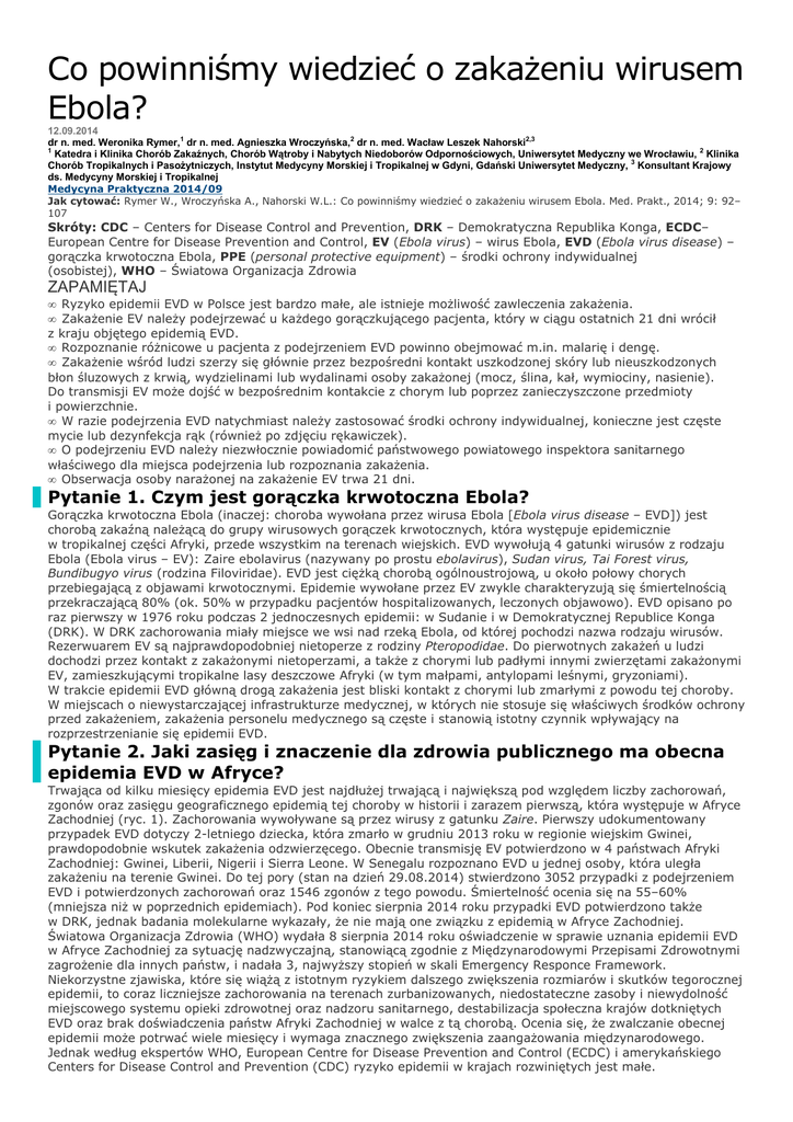 Co powinniśmy wiedzieć o zakażeniu wirusem Ebola? 12.09.2014 dr n. med. Weronika Rymer,1 dr n. med. Agnieszka Wroczyńska,2 dr n. med. Wacław Leszek Nahorski2,3 1 Katedra i Klinika Chorób Zakaźnych, Chorób Wątroby i Nabytych Niedoborów Odpornościowych, Uniwersytet Medyczny we Wrocławiu, 2 Klinika Chorób Tropikalnych i Pasożytniczych, Instytut Medycyny Morskiej i Tropikalnej w Gdyni, Gdański Uniwersytet Medyczny, 3 Konsultant Krajowy ds. Medycyny Morskiej i Tropikalnej Medycyna Praktyczna 2014/09 Jak cytować: Rymer W., Wroczyńska A., Nahorski W.L.: Co powinniśmy wiedzieć o zakażeniu wirusem Ebola. Med. Prakt., 2014; 9: 92– 107 Skróty: CDC – Centers for Disease Control and Prevention, DRK – Demokratyczna Republika Konga, ECDC– European Centre for Disease Prevention and Control, EV (Ebola virus) – wirus Ebola, EVD (Ebola virus disease) – gorączka krwotoczna Ebola, PPE (personal protective equipment) – środki ochrony indywidualnej (osobistej), WHO – Światowa Organizacja Zdrowia ZAPAMIĘTAJ • Ryzyko epidemii EVD w Polsce jest bardzo małe, ale istnieje możliwość zawleczenia zakażenia. • Zakażenie EV należy podejrzewać u każdego gorączkującego pacjenta, który w ciągu ostatnich 21 dni wrócił z kraju objętego epidemią EVD. • Rozpoznanie różnicowe u pacjenta z podejrzeniem EVD powinno obejmować m.in. malarię i dengę. • Zakażenie wśród ludzi szerzy się głównie przez bezpośredni kontakt uszkodzonej skóry lub nieuszkodzonych błon śluzowych z krwią, wydzielinami lub wydalinami osoby zakażonej (mocz, ślina, kał, wymiociny, nasienie). Do transmisji EV może dojść w bezpośrednim kontakcie z chorym lub poprzez zanieczyszczone przedmioty i powierzchnie. • W razie podejrzenia EVD natychmiast należy zastosować środki ochrony indywidualnej, konieczne jest częste mycie lub dezynfekcja rąk (również po zdjęciu rękawiczek). • O podejrzeniu EVD należy niezwłocznie powiadomić państwowego powiatowego inspektora sanitarnego właściwego dla miejsca podejrzenia lub rozpoznania zakażenia. • Obserwacja osoby narażonej na zakażenie EV trwa 21 dni. Pytanie 1. Czym jest gorączka krwotoczna Ebola? Gorączka krwotoczna Ebola (inaczej: choroba wywołana przez wirusa Ebola [Ebola virus disease – EVD]) jest chorobą zakaźną należącą do grupy wirusowych gorączek krwotocznych, która występuje epidemicznie w tropikalnej części Afryki, przede wszystkim na terenach wiejskich. EVD wywołują 4 gatunki wirusów z rodzaju Ebola (Ebola virus – EV): Zaire ebolavirus (nazywany po prostu ebolavirus), Sudan virus, Tai Forest virus, Bundibugyo virus (rodzina Filoviridae). EVD jest ciężką chorobą ogólnoustrojową, u około połowy chorych przebiegającą z objawami krwotocznymi. Epidemie wywołane przez EV zwykle charakteryzują się śmiertelnością przekraczającą 80% (ok. 50% w przypadku pacjentów hospitalizowanych, leczonych objawowo). EVD opisano po raz pierwszy w 1976 roku podczas 2 jednoczesnych epidemii: w Sudanie i w Demokratycznej Republice Konga (DRK). W DRK zachorowania miały miejsce we wsi nad rzeką Ebola, od której pochodzi nazwa rodzaju wirusów. Rezerwuarem EV są najprawdopodobniej nietoperze z rodziny Pteropodidae. Do pierwotnych zakażeń u ludzi dochodzi przez kontakt z zakażonymi nietoperzami, a także z chorymi lub padłymi innymi zwierzętami zakażonymi EV, zamieszkującymi tropikalne lasy deszczowe Afryki (w tym małpami, antylopami leśnymi, gryzoniami). W trakcie epidemii EVD główną drogą zakażenia jest bliski kontakt z chorymi lub zmarłymi z powodu tej choroby. W miejscach o niewystarczającej infrastrukturze medycznej, w których nie stosuje się właściwych środków ochrony przed zakażeniem, zakażenia personelu medycznego są częste i stanowią istotny czynnik wpływający na rozprzestrzenianie się epidemii EVD. Pytanie 2. Jaki zasięg i znaczenie dla zdrowia publicznego ma obecna epidemia EVD w Afryce? Trwająca od kilku miesięcy epidemia EVD jest najdłużej trwającą i największą pod względem liczby zachorowań, zgonów oraz zasięgu geograficznego epidemią tej choroby w historii i zarazem pierwszą, która występuje w Afryce Zachodniej (ryc. 1). Zachorowania wywoływane są przez wirusy z gatunku Zaire. Pierwszy udokumentowany przypadek EVD dotyczy 2-letniego dziecka, która zmarło w grudniu 2013 roku w regionie wiejskim Gwinei, prawdopodobnie wskutek zakażenia odzwierzęcego. Obecnie transmisję EV potwierdzono w 4 państwach Afryki Zachodniej: Gwinei, Liberii, Nigerii i Sierra Leone. W Senegalu rozpoznano EVD u jednej osoby, która uległa zakażeniu na terenie Gwinei. Do tej pory (stan na dzień 29.08.2014) stwierdzono 3052 przypadki z podejrzeniem EVD i potwierdzonych zachorowań oraz 1546 zgonów z tego powodu. Śmiertelność ocenia się na 55–60% (mniejsza niż w poprzednich epidemiach). Pod koniec sierpnia 2014 roku przypadki EVD potwierdzono także w DRK, jednak badania molekularne wykazały, że nie mają one związku z epidemią w Afryce Zachodniej. Światowa Organizacja Zdrowia (WHO) wydała 8 sierpnia 2014 roku oświadczenie w sprawie uznania epidemii EVD w Afryce Zachodniej za sytuację nadzwyczajną, stanowiącą zgodnie z Międzynarodowymi Przepisami Zdrowotnymi zagrożenie dla innych państw, i nadała 3, najwyższy stopień w skali Emergency Responce Framework. Niekorzystne zjawiska, które się wiążą z istotnym ryzykiem dalszego zwiększenia rozmiarów i skutków tegorocznej epidemii, to coraz liczniejsze zachorowania na terenach zurbanizowanych, niedostateczne zasoby i niewydolność miejscowego systemu opieki zdrowotnej oraz nadzoru sanitarnego, destabilizacja społeczna krajów dotkniętych EVD oraz brak doświadczenia państw Afryki Zachodniej w walce z tą chorobą. Ocenia się, że zwalczanie obecnej epidemii może potrwać wiele miesięcy i wymaga znacznego zwiększenia zaangażowania międzynarodowego. Jednak według ekspert