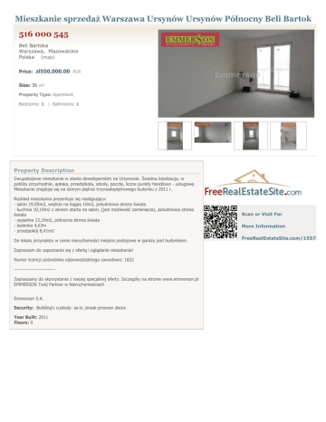 Mieszkanie sprzedaż Warszawa Ursynów Ursynów Północny Beli Bartok 516 000 545 Beli Bartoka Warszawa, Mazowieckie Polska (map) Price: zł550,000.00 PLN Size: 56 m² Property Type: Apartment Bedrooms: 1 | Bathrooms: 1 Property Description Dwupokojowe mieszkanie w stanie deweloperskim na Ursynowie. Świetna lokalizacja, w pobliżu przychodnie, apteka, przedszkola, szkoły, poczta, liczne punkty handlowo - usługowe. Mieszkanie znajduje się na ósmym piętrze trzynastopiętrowego budynku z 2011 r. Rozkład mieszkania prezentuje się następująco: - salon 19,95m2, wejście na loggię 10m2, południowa strona świata - kuchnia 10,19m2 z oknem otarta na salon, (jest możliwość zamknięcia), południowa strona świata - sypialnia 13,10m2, północna strona świata - łazienka 4,63m - przedpokój 8,41m2 Scan or Visit For Do lokalu przynależy w cenie nieruchomości miejsce postojowe w garażu pod budynkiem. FreeRealEstateSite.com/155739 Zapraszam do zapoznania się z ofertą i oglądania mieszkania! Numer licencji pośrednika odpowiedzialnego zawodowo: 1822 -------------------------Zapraszamy do skorzystania z naszej specjalnej oferty. Szczegóły na stronie www.emmerson.pl EMMERSON Twój Partner w Nieruchomościach Emmerson S.A. Security: Building's custody: as-is ,break-prooven doors Year Built: 2011 Floors: 9 More Information