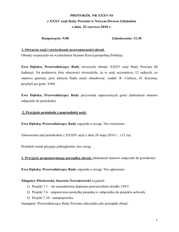 PROTOKÓŁ NR XXXV/10 z XXXV sesji Rady Powiatu w Nowym Dworze Gdańskim z dnia 22 czerwca 2010 r. Rozpoczęcie: 9.00 Zakończenie: 11.30 1. Otwarcie sesji i stwierdzenie prawomocności obrad. Obrady rozpoczęto od wysłuchania Hymnu Rzeczypospolitej Polskiej. Ewa Dąbska, Przewodniczący Rady otworzyła obrady XXXV sesji Rady Powiatu III kadencji. Na podstawie listy obecności stwierdziła, że w sesji uczestniczy 12 radnych, co stanowi quorum, przy którym Rada może obradować. (radni: R. Cichosz, H. Kuczma, przybyli po godz. 9.00) Ewa Dąbska, Przewodniczący Rady przywitała zaproszonych gości (dokument stanowi załącznik do protokołu). 2. Przyjęcie protokołu z poprzedniej sesji. Ewa Dąbska, Przewodniczący Rady zapytała o uwagi. Nie wniesiono. Głosowanie nad protokołem z XXXIV sesji z dnia 28 maja 2010 r.: (13 za). Protokół został przyjęty jednogłośnie, bez uwag. 3. Przyjęcie proponowanego porządku obrad. (dokument stanowi załącznik do protokołu) Ewa Dąbska, Przewodniczący Rady zapytała o uwagi. Nie zgłoszono. Zbigniew Piórkowski, Starosta Nowodworski wyjaśnił: 1) Projekt 7.1 – do uzasadnienia dopisano powierzchnie działki 130/3 2) Projekt 7.6 – poprawiono pomyłkę pisarską w załączniku do projektu uchwały. 3) Projekt 7.10 - autopoprawka Następnie Przewodniczący Rady Powiatu odczytała cały porządek obrad. 1 Proponowany porządek obrad XXXV sesji w dniu 22 czerwca 2010 roku 1. Otwarcie sesji i stwierdzenie prawomocności obrad. 2. Przyjęcie protokołu z poprzedniej sesji. 3. Przyjęcie proponowanego porządku obrad. 4. Interpelacje i zapytania radnych. 5. Zabezpieczenie przeciwpowodziowe regionu – plany inwestycyjne i zagrożenia – referat Pan Andrzej Ryński 6. Informacja dotycząca funkcjonowania Lokalnej Grupy Działania Żuławy i Mierzeja – referat Pan Grzegorz Gola. 7. Rozpatrzenie projektów uchwał oraz podjęcie uchwał w sprawach: 7.1 Wyrażenia zgody na zbycie nieruchomości oznaczonej jako działka 130/3 położonej w Nowym Dworze Gdańskim, stanowiącej własność Powiatu Nowodworskiego. 7.2 Wyrażenia zgody na dokonanie darowizny nieruchomości oznaczonej jako działka nr 169/1 o pow. 0,2203 ha położonej w obrębie ewidencjonowanym Łaszka w gminie Sztutowo. 7.3 Wyrażenia zgody na wydzierżawienie części działki 100/19 położonej w Stegnie, gmina Stegna stanowiącej własność Powiatu Nowodworskiego. (RUCH S.A.) 7.4 Wyrażenia zgody na wydzierżawienie części działki 100/19 położonej w Stegnie, gmina Stegna stanowiącej własność Powiatu Nowodworskiego. (p. Wiesław Bucki). 7.5 Wyrażenia zgody na wydzierżawienie części działki 100/19 położonej w Stegnie, gmina Stegna stanowiącej własność Powiatu Nowodworskiego. (p. Grzegorz Nowak) 7.6 Ustalenia wysokości opłat za usuwanie i parkowanie pojazdu 7.7 Zmiany uchwały Nr XXXI/276/2010 Rady Powiatu w Nowym Dworze Gdańskim z dnia 5 lutego 2010 r. w sprawie trybu udzielania i rozliczania dotacji z budżetu Powiatu Nowodworskiego dla niepublicznych szkół i placówek oraz trybu i zakresu kontroli prawidłowości ich wykorzystania. 7.8 Rozpoznania skargi na działalność Starosty Nowodworskiego. 7.9 Rozpoznania skargi na bezczynność Starosty Nowodworskiego. 7.10 Zmiany uchwały budżetowej na 2010 r. 8. Informacja Starosty o działalności Zarządu Powiatu między sesjami. 9. Wnioski i oświadczenia radnych. 10. Sprawy różne. 11. Zakończenie obrad XXXV sesji Rady Powiatu w Nowym Dworze Gdańskim III kadencji. Głosowanie nad całym porządkiem: 13 za. Porządek został przyjęty jednogłośnie. 2 4. Interpelacje i zapytania radnych. Stanisław Rączka, radny – 14 czerwca br. miała odbyć się kolejna rozprawa sądowa w sprawie Starostwo i firma Serwin. Czy się odbyła, jeżeli tak to z jakim skutkiem? Pan Rączka wnosi o odpowiedź pisemną. - do radnego zwrócił się mieszkaniec dawnego PGR Nowotna (Pan Malecki), iż na teren PGR przyjeżdżają samochody tiry, zrzucające jakiś ładunek na teren PGR. Czy można sprawdzić co to jest? Mieszkańcy skarżą się na odór. Andrzej Sobociński, radny – w trakcie budowy skrzyżowania w m. Lubieszewo został przeoczony jeden kawałek chodnika (jadąc w kierunku Ostaszewa, za sklepem) należałoby zabezpieczyć środki, aby wybudować chodnik, chociaż do sklepu. Kończy się on w pewnym momencie, nie dobiega do sklepu. Wniosek o jego dokończenie. Eugeniusz Jaremba, radny – popiera wniosek Pana Sobocińskiego. Odcinek chodnika jest bardzo potrzebny. Poprawi bezpieczeństwo pieszych. Barbara Piechnik, radna – czy poczyniono jakieś działania informacyjne, iż nasze plaże są czyste? Przerwa 5 minut. 5. Zabezpieczenie przeciwpowodziowe regionu – plany inwestycyjne i zagrożenia – referat Pan Andrzej Ryński (dokument stanowi załącznik do protokołu) Referat wygłosił Pan Andrzej Ryński kierownik Biura Koordynacji Ochrony Przeciwpowodziowej Regionu Wodnego Dolnej Wisły (BKOP) oraz Jednostki Zarządzającej Programem Żuławskim. Informacje ogólne dotyczące programy „Program Żuławski - 2030. Program został zatwierdzony przez Ministra Środowiska. - procedura oddziaływania na środowisko, - dłuższa perspektywa finansowania do 2030 r., - sektorowy dokument programowy - udział w Dyrektywie Powodziowej dla Żuław. Trwają prace legislacyjne. 1) wstępna ocena ryzyka 3 2) mapy zagrożeń, mapy ryzyka powodziowego. 3) plan zarządzania ryzykiem powodziowym. Zagrożenia dla Żuław: Wody: -sztormowe - opadowe - roztopowe - wewnątrzpolderowe Cel programu: - ogólny - zwiększenie ochrony Żuław - szczegółowy – rozpoznanie zagrożeń poprzez metody naturalne, struktura organizacyjna i zarządzanie ryzykiem, poprawa rozpoznania zabezpieczenia powodziowego, przebudowa, odbudowa urządzeń melioracyjnych technicznych. Horyzont czasowy: - I etap do 2015 – określone są zadania inwestycyjne. - II i III etap – do 2030 r. – działania. Na terenie Powiatu Nowodworskiego - k