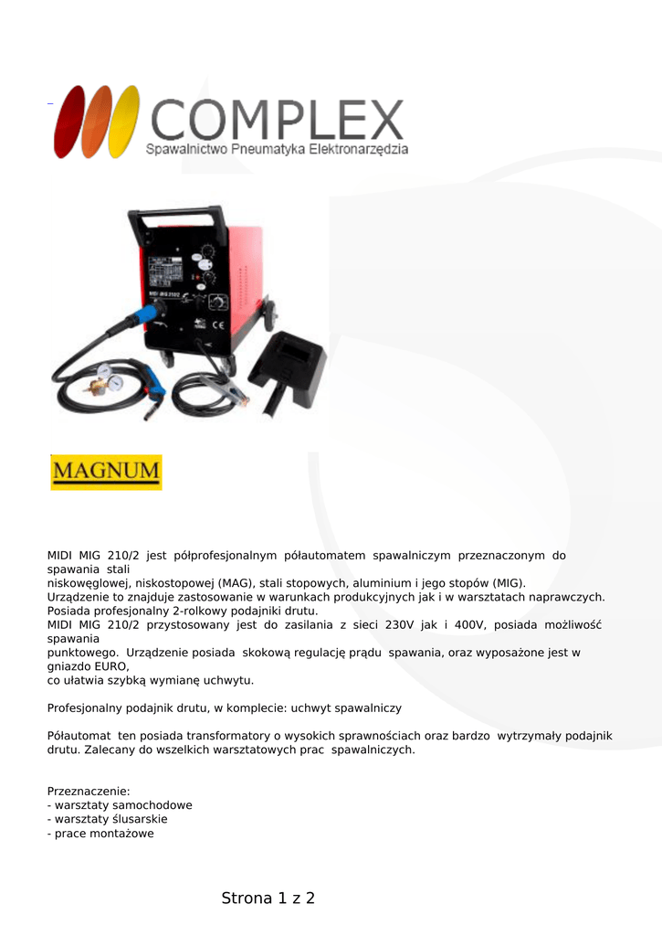 MIDI MIG 210/2 jest półprofesjonalnym półautomatem spawalniczym przeznaczonym do spawania stali niskowęglowej, niskostopowej (MAG), stali stopowych, aluminium i jego stopów (MIG). Urządzenie to znajduje zastosowanie w warunkach produkcyjnych jak i w warsztatach naprawczych. Posiada profesjonalny 2-rolkowy podajniki drutu. MIDI MIG 210/2 przystosowany jest do zasilania z sieci 230V jak i 400V, posiada możliwość spawania punktowego. Urządzenie posiada skokową regulację prądu spawania, oraz wyposażone jest w gniazdo EURO, co ułatwia szybką wymianę uchwytu. Profesjonalny podajnik drutu, w komplecie: uchwyt spawalniczy Półautomat ten posiada transformatory o wysokich sprawnościach oraz bardzo wytrzymały podajnik drutu. Zalecany do wszelkich warsztatowych prac spawalniczych. Przeznaczenie: - warsztaty samochodowe - warsztaty ślusarskie - prace montażowe Strona 1 z 2 Zalety: - spawanie drutami litymi (?0,6 ? 0,8mm) - niewielkie gabaryty - komplet zawiera: profesjonalny uchwyt spawalniczy MB15/3m z eurozłączem, reduktor, tarcza spawalnicza, młotek wraz ze szczotką, - instrukcja w języku polskim Dane techniczne spawarki Napięcie zasilania 230V/400V Prąd spawania 210A Regulacja 6-stopniowa Pobór mocy 5,5kVa Masa 49 Zabezpieczenie zasilania 25A Chłodzenie wentylator Średnica drutu 0,6-0,8mm Max wielkość szpuli 15kg Cykl pracy PJ 35%/210A Strona 2 z 2