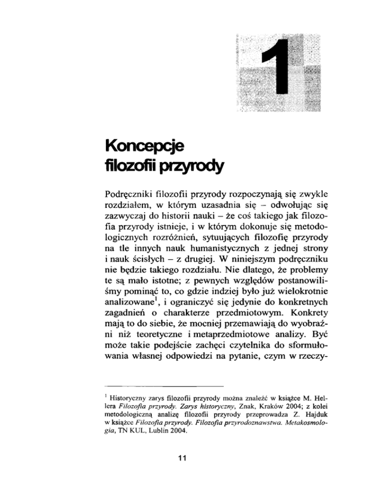 K oncepcje filo zo fii przyrody Podręczniki filozofii przyrody rozpoczynają się zwykle rozdziałem, w którym uzasadnia się - odwołując się zazwyczaj do historii nauki - że coś takiego jak filozo fia przyrody istnieje, i w którym dokonuje się metodo logicznych rozróżnień, sytuujących filozofię przyrody na tle innych nauk humanistycznych z jednej strony i nauk ścisłych - z drugiej. W niniejszym podręczniku nie będzie takiego rozdziału. Nie dlatego, że problemy te są mało istotne; z pewnych względów postanowili śmy pominąć to, co gdzie indziej było już wielokrotnie analizowane1, i ograniczyć się jedynie do konkretnych zagadnień o charakterze przedmiotowym. Konkrety mają to do siebie, że mocniej przemawiają do wyobraź ni niż teoretyczne i metaprzedmiotowe analizy. Być może takie podejście zachęci czytelnika do sformuło wania własnej odpowiedzi na pytanie, czym w rzeczy 1 Historyczny zarys filozofii przyrody można znaleźć w książce M. Hel lera Filozofia przyrody. Zarys historyczny, Znak, Kraków 2004; z kolei metodologiczną analizę filozofii przyrody przeprowadza Z. Hajduk w książce Filozofia przyrody. Filozofia przyrodoznawstwa. Metakosmologia, TN KUL, Lublin 2004. 11 wistości jest filozofia przyrody i jakie jest jej miejsce na tle innych nauk. Filozofia przyrody Istnieje wiele różnych, mniej lub bardziej trafnych, określeń filozofii przyrody. Jedno z takich określeń gło si, że jest to dyscyplina należąca do nauk humanistycz nych, w ramach której prowadzi się filozoficzną reflek sję nad wynikami badań nauk empirycznych, takich jak fizyka, chemia, kosmologia itp. Nawet jeśli ograniczyć się do tego typu „definicji” i pominąć wszystkie inne określenia tej dziedziny, to okazuje się, że tak pojmo waną filozofię przyrody można uprawiać - o czym przekonują liczne przykłady z historii nauki - na wiele różnych sposobów. ... jako studium wstępne Najpierw, filozofię przyrody można ograniczyć do roli asystenta, zajmującego się jedynie „wstępną obróbką” różnego rodzaju problemów i zagadnień, które dopiero po pewnym czasie stają się punktem wyjścia dla poważ nych, naukowych analiz. Z chwilą gdy dane zagadnienie zostaje „przejęte” przez naukę, filozofia przyrody traci swoje kompetencje do wypowiadania się na jego temat i powraca do wyszukiwania i wstępnego opracowywania kolejnych, przednaukowych kwestii. Tak pojmowana filozofia przyrody nie ma wielkich ambicji: zadowala się rolą niewykwalifikowanego pomocnika, który naukom przyrodniczym przygotowuje „materiał”, ale nie jest przez nie traktowany zbyt poważnie. ... jako refleksja na marginesie Inna, choć zbliżona do poprzedniej, koncepcja upra wiania filozofii przyrody to prowadzenie różnego ro dzaju rozważań i spekulacji o wydźwięku filozoficz nym na marginesie nauk przyrodniczych. Tego typu spekulacjami zajmują się najczęściej tak zwani filozo fujący przyrodnicy, którzy w uprawianych przez siebie naukach ścisłych dostrzegają wątki i problemy o cha rakterze filozoficznym i którzy na swój własny sposób 12 próbują te problemy analizować. Do tej kategorii należy zaliczyć znaczną część autorów książek popularnonau kowych, w których konkretne zagadnienia z poszcze gólnych nauk szczegółowych stają się okazją do filozo ficznych i metaprzedmiotowych analiz. ... jako filozofia nauki Filozofię przyrody sprowadza się niekiedy do filozofii nauki. W tym ujęciu podstawowym zadaniem filozofii przyrody staje się logiczna analiza języka nauki lub w innym ujęciu - logiczna analiza samej nauki oraz me tod stosowanych w nauce (filozofia przyrody jako meto dologia nauk). ... jako analiza założeń Kolejnym zadaniem, jakie stawia się przed filozofią przyrody, jest analizowanie założeń, na których opierają się nauki przyrodnicze. Klasycznym przykładem przyj mowanego milcząco założenia, które nie jest udowad niane przez żadną z nauk empirycznych, jest założenie o realnym istnieniu fizycznego świata. Filozofia przyrody miałaby - według tej koncepcji - wyławiać i poddawać krytycznej analizie tego typu założenia, przez co nauki ścisłe zyskiwałyby swego rodzaju filozoficzne uzasad nienie. Zgodnie z tym ujęciem, rola filozofii przyrody nie musiałby ograniczać się jedynie do analizy założeń teorii naukowych: jej zadaniem byłoby również nadawanie fi lozoficznej interpretacji teoriom naukowym, ich twier dzeniom i dokonywanym przez nie odkryciom. ... jako syntetyczna wizja świata Według innych koncepcji, filozofia przyrody miałaby zajmować się budowaniem spójnej i zrozumiałej dla współczesnego człowieka wizji świata, opartej na syn tezie nauk przyrodniczych. Dokonywanie takiej syntezy mogłoby się odbywać na poziomie wyników różnych nauk szczegółowych; mogłoby również dotyczyć sto sowanych w ramach tych nauk metod badawczych, przyjmowanych założeń itp. 13 ... jako metafizyka przyrody Najbardziej ambitnym ujęciem filozofii przyrody jest koncepcja, zgodnie z którą filozofia przyrody pojmowa na jest jako metafizyka przyrody, czyli dyscyplina filozo ficzna, udzielająca odpowiedzi na najważniejsze pytania, dotyczące ogólnych własności tego, co istnieje. Pojmo wana w ten sposób filozofia przyrody pojawia się najczę ściej w ramach konkretnych systemów metafizycznych, takich jak metafizyka arystotelesowsko-tomistyczna lub metafizyka procesu Whiteheada. ... jako filozofia w nauce Filozofia przyrody może być wreszcie rozumiana jako „filozofia w nauce”. Jeśli oceniać wymienione koncepcje filozofii przyrody pod względem zakresu stawianych przed tą dziedziną zadań i obejmowanych przez nią za gadnień, to „filozofia w nauce” powinna znaleźć się (ja ko ujęcie mniej maksymalistyczne) przed metafizyką przyrody. Wymieniamy tę koncepcję jako ostatnią, po nieważ niniejszy podręcznik reprezentuje właśnie takie ujęcie filozofii 