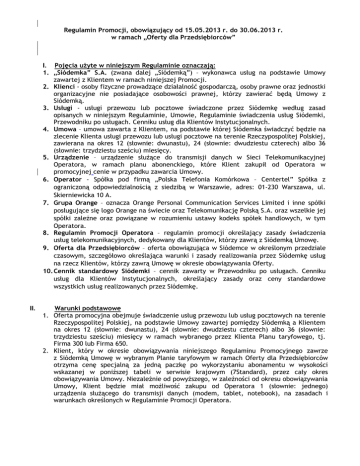 Regulamin Promocji, obowiązujący od 15.05.2013 r. do 30.06.2013 r. w ramach „Oferty dla Przedsiębiorców” I. Pojęcia użyte w niniejszym Regulaminie oznaczają: 1. „Siódemka” S.A. (zwana dalej „Siódemką”) – wykonawca usług na podstawie Umowy zawartej z Klientem w ramach niniejszej Promocji. 2. Klienci - osoby fizyczne prowadzące działalność gospodarczą, osoby prawne oraz jednostki organizacyjne nie posiadające osobowości prawnej, którzy zawierać będą Umowy z Siódemką. 3. Usługi - usługi przewozu lub pocztowe świadczone przez Siódemkę według zasad opisanych w niniejszym Regulaminie, Umowie, Regulaminie świadczenia usług Siódemki, Przewodniku po usługach. Cenniku usług dla Klientów Instytucjonalnych. 4. Umowa – umowa zawarta z Klientem, na podstawie której Siódemka świadczyć będzie na zlecenie Klienta usługi przewozu lub usługi pocztowe na terenie Rzeczypospolitej Polskiej, zawierana na okres 12 (słownie: dwunastu), 24 (słownie: dwudziestu czterech) albo 36 (słownie: trzydziestu sześciu) miesięcy. 5. Urządzenie – urządzenie służące do transmisji danych w Sieci Telekomunikacyjnej Operatora, w ramach planu abonenckiego, które Klient zakupił od Operatora w promocyjnej cenie w przypadku zawarcia Umowy. 6. Operator - Spółka pod firmą „Polska Telefonia Komórkowa – Centertel” Spółka z ograniczoną odpowiedzialnością z siedzibą w Warszawie, adres: 01-230 Warszawa, ul. Skierniewicka 10 A. 7. Grupa Orange – oznacza Orange Personal Communication Services Limited i inne spółki posługujące się logo Orange na świecie oraz Telekomunikację Polską S.A. oraz wszelkie jej spółki zależne oraz powiązane w rozumieniu ustawy kodeks spółek handlowych, w tym Operatora. 8. Regulamin Promocji Operatora – regulamin promocji określający zasady świadczenia usług telekomunikacyjnych, dedykowany dla Klientów, którzy zawrą z Siódemką Umowę. 9. Oferta dla Przedsiębiorców – oferta obowiązująca w Siódemce w określonym przedziale czasowym, szczegółowo określająca warunki i zasady realizowania przez Siódemkę usług na rzecz Klientów, którzy zawrą Umowę w okresie obowiązywania Oferty. 10. Cennik standardowy Siódemki – cennik zawarty w Przewodniku po usługach. Cenniku usług dla Klientów Instytucjonalnych, określający zasady oraz ceny standardowe wszystkich usług realizowanych przez Siódemkę. II. Warunki podstawowe 1. Oferta promocyjna obejmuje świadczenie usług przewozu lub usług pocztowych na terenie Rzeczypospolitej Polskiej, na podstawie Umowy zawartej pomiędzy Siódemką a Klientem na okres 12 (słownie: dwunastu), 24 (słownie: dwudziestu czterech) albo 36 (słownie: trzydziestu sześciu) miesięcy w ramach wybranego przez Klienta Planu taryfowego, tj. Firma 300 lub Firma 650. 2. Klient, który w okresie obowiązywania niniejszego Regulaminu Promocyjnego zawrze z Siódemką Umowę w wybranym Planie taryfowym w ramach Oferty dla Przedsiębiorców otrzyma cenę specjalną za jedną paczkę po wykorzystaniu abonamentu w wysokości wskazanej w poniższej tabeli w serwisie krajowym (7Standard), przez cały okres obowiązywania Umowy. Niezależnie od powyższego, w zależności od okresu obowiązywania Umowy, Klient będzie miał możliwość zakupu od Operatora 1 (słownie: jednego) urządzenia służącego do transmisji danych (modem, tablet, notebook), na zasadach i warunkach określonych w Regulaminie Promocji Operatora. 1. Plan taryfowy Firma 300 2. Wysokość abonamentu w PLN netto 300,00 zł 3. 4. Ilość paczek w Cena specjalna jednej paczki w usłudze 7 abonamencie Standard po wykorzystaniu abonamentu w PLN netto 16 szt. 14,00 zł Firma 650 650,00 zł 42 szt. 12,50 zł 3. Kwota abonamentu określona w Umowie obejmuje właściwą dla danego Planu Taryfowego ilość bezpłatnych paczek, określoną w Ofercie dla Przedsiębiorców, z doręczeniem w usłudze 7 Standard. Pozostałe usługi podstawowe oraz usługi dodatkowe nie są wliczone do kwoty abonamentu i podlegają odrębnej opłacie. 4. Oferta dla Przedsiębiorców dotyczy wszystkich nadanych przesyłek w tym paczek i palet. Dla każdej paczki lub palety obliczana jest waga gabarytowa (długość x szerokość x wysokość [cm] / 6000). Kategoria wagowa ustalana jest według wyższej wagi rzeczywistej lub gabarytowej. W przypadku, gdy waga gabarytowa liczona ze wzoru nie przekracza wagi rzeczywistej 31,5 kg, do listu przewozowego wpisywana jest rzeczywista waga paczki lub palety. Waga gabarytowa obliczana jest zgodnie z aktualnym cennikiem Siódemki. Maksymalna dopuszczalna długość jednego boku dla paczki standardowej nie może przekroczyć 120 cm, a suma wymiarów wszystkich boków nie może przekroczyć (wysokość, długość, szerokość) 220 cm. Paczką niestandardową są również: elementy o kształcie okrągłym, cylindrycznym lub owalnym; o nieregularnych kształtach lub/oraz z wystającymi elementami; zawierające luźne, ciężkie elementy lub takie, których rozkład ciężaru jest nierównomierny, umieszczone w luźnym opakowaniu. 5. W przypadku wypowiedzenia Umowy przed upływem okresu na jaki została zawarta lub niedotrzymania przez Klienta któregokolwiek z zobowiązań określonych w ust. 3 powyżej, tj. braku lub nieterminowych płatności wynikających z Umowy, co będzie traktowane jako wypowiedzenie Umowy przez Klienta z przyczyn leżących po jego stronie lub w razie rozwiązania Umowy przez Siódemkę z przyczyn leżących po stronie Klienta, określonych w niniejszym Regulaminie, Umowie lub Regulaminie świadczenia usług, Siódemka jest uprawniona do obciążenia Klienta karą umowną w wysokości iloczynu wartości abonamentu oraz ilości miesięcy pozostałych do zakończenia obowiązywania umowy, zgodnie z okresem na jaki została zawarta. 6. Integralna częścią Oferty dla Przedsiębiorców jest korzystanie przez Klienta z platformy on-line pod nazwą 7 Internet Shipping. III. Zasady świa