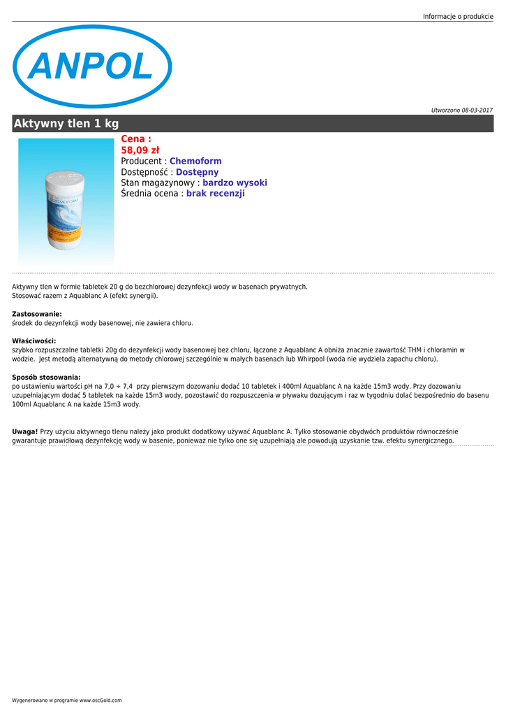 Informacje o produkcie Utworzono 08-03-2017 Aktywny tlen 1 kg Cena : 58,09 zł Producent : Chemoform Dostępność : Dostępny Stan magazynowy : bardzo wysoki Średnia ocena : brak recenzji Aktywny tlen w formie tabletek 20 g do bezchlorowej dezynfekcji wody w basenach prywatnych. Stosować razem z Aquablanc A (efekt synergii). Zastosowanie: środek do dezynfekcji wody basenowej, nie zawiera chloru. Właściwości: szybko rozpuszczalne tabletki 20g do dezynfekcji wody basenowej bez chloru, łączone z Aquablanc A obniża znacznie zawartość THM i chloramin w wodzie. Jest metodą alternatywną do metody chlorowej szczególnie w małych basenach lub Whirpool (woda nie wydziela zapachu chloru). Sposób stosowania: po ustawieniu wartości pH na 7,0 ÷ 7,4 przy pierwszym dozowaniu dodać 10 tabletek i 400ml Aquablanc A na każde 15m3 wody. Przy dozowaniu uzupełniającym dodać 5 tabletek na każde 15m3 wody, pozostawić do rozpuszczenia w pływaku dozującym i raz w tygodniu dolać bezpośrednio do basenu 100ml Aquablanc A na każde 15m3 wody. Uwaga! Przy użyciu aktywnego tlenu należy jako produkt dodatkowy używać Aquablanc A. Tylko stosowanie obydwóch produktów równocześnie gwarantuje prawidłową dezynfekcję wody w basenie, ponieważ nie tylko one się uzupełniają ale powodują uzyskanie tzw. efektu synergicznego. Wygenerowano w programie www.oscGold.com
