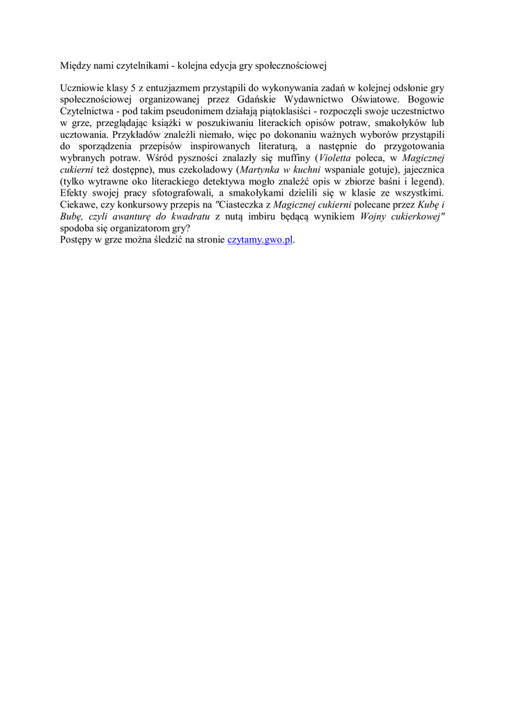 Między nami czytelnikami - kolejna edycja gry społecznościowej Uczniowie klasy 5 z entuzjazmem przystąpili do wykonywania zadań w kolejnej odsłonie gry społecznościowej organizowanej przez Gdańskie Wydawnictwo Oświatowe. Bogowie Czytelnictwa - pod takim pseudonimem działają piątoklasiści - rozpoczęli swoje uczestnictwo w grze, przeglądając książki w poszukiwaniu literackich opisów potraw, smakołyków lub ucztowania. Przykładów znaleźli niemało, więc po dokonaniu ważnych wyborów przystąpili do sporządzenia przepisów inspirowanych literaturą, a następnie do przygotowania wybranych potraw. Wśród pyszności znalazły się muffiny (Violetta poleca, w Magicznej cukierni też dostępne), mus czekoladowy (Martynka w kuchni wspaniale gotuje), jajecznica (tylko wytrawne oko literackiego detektywa mogło znaleźć opis w zbiorze baśni i legend). Efekty swojej pracy sfotografowali, a smakołykami dzielili się w klasie ze wszystkimi. Ciekawe, czy konkursowy przepis na "Ciasteczka z Magicznej cukierni polecane przez Kubę i Bubę, czyli awanturę do kwadratu z nutą imbiru będącą wynikiem Wojny cukierkowej" spodoba się organizatorom gry? Postępy w grze można śledzić na stronie czytamy.gwo.pl.