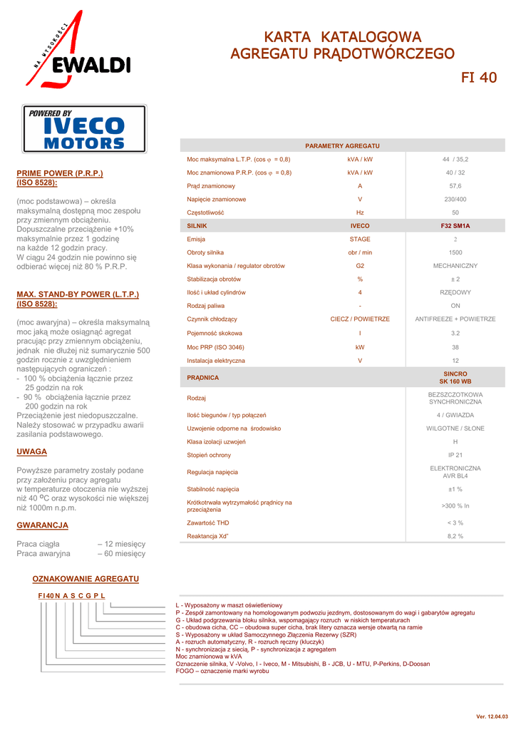 KARTA KATALOGOWA AGREGATU PRĄ PRĄDOTWÓ DOTWÓRCZEGO FI 40 PARAMETRY AGREGATU Moc maksymalna L.T.P. (cos ϕ = 0,8) kVA / kW 44 / 35,2 PRIME POWER (P.R.P.) (ISO 8528): Moc znamionowa P.R.P. (cos ϕ = 0,8) kVA / kW 40 / 32 A 57,6 (moc podstawowa) – określa maksymalną dostępną moc zespołu przy zmiennym obciążeniu. Dopuszczalne przeciążenie +10% maksymalnie przez 1 godzinę na każde 12 godzin pracy. W ciągu 24 godzin nie powinno się odbierać więcej niż 80 % P.R.P. Napięcie znamionowe V 230/400 Częstotliwość Hz 50 SILNIK IVECO F32 SM1A Emisja STAGE 2 Obroty silnika obr / min 1500 Klasa wykonania / regulator obrotów G2 MECHANICZNY Stabilizacja obrotów % ±2 MAX. STAND-BY POWER (L.T.P.) (ISO 8528): Ilość i układ cylindrów 4 RZĘDOWY Rodzaj paliwa - ON (moc awaryjna) – określa maksymalną moc jaką może osiągnąć agregat pracując przy zmiennym obciążeniu, jednak nie dłużej niż sumarycznie 500 godzin rocznie z uwzględnieniem następujących ograniczeń : - 100 % obciążenia łącznie przez 25 godzin na rok - 90 % obciążenia łącznie przez 200 godzin na rok Przeciążenie jest niedopuszczalne. Należy stosować w przypadku awarii zasilania podstawowego. Czynnik chłodzący CIECZ / POWIETRZE ANTIFREEZE + POWIETRZE Pojemność skokowa l 3.2 Moc PRP (ISO 3046) kW 38 Instalacja elektryczna V 12 Prąd znamionowy PRĄDNICA Rodzaj Ilość biegunów / typ połączeń Uzwojenie odporne na środowisko Klasa izolacji uzwojeń UWAGA Stopień ochrony SINCRO SK 160 WB BEZSZCZOTKOWA SYNCHRONICZNA 4 / GWIAZDA WILGOTNE / SŁONE H IP 21 Powyższe parametry zostały podane przy założeniu pracy agregatu w temperaturze otoczenia nie wyższej niż 40 OC oraz wysokości nie większej niż 1000m n.p.m. Regulacja napięcia ELEKTRONICZNA AVR BL4 Stabilność napięcia ±1 % GWARANCJA Zawartość THD <3% Reaktancja Xd” 8,2 % Praca ciągła Praca awaryjna Krótkotrwała wytrzymałość prądnicy na przeciążenia >300 % In – 12 miesięcy – 60 miesięcy OZNAKOWANIE AGREGATU F I 40 N A S C G P L F L - Wyposażony w maszt oświetleniowy P - Zespół zamontowany na homologowanym podwoziu jezdnym, dostosowanym do wagi i gabarytów agregatu G - Układ podgrzewania bloku silnika, wspomagający rozruch w niskich temperaturach C - obudowa cicha, CC – obudowa super cicha, brak litery oznacza wersje otwartą na ramie S - Wyposażony w układ Samoczynnego Złączenia Rezerwy (SZR) A - rozruch automatyczny, R - rozruch ręczny (kluczyk) N - synchronizacja z siecią, P - synchronizacja z agregatem Moc znamionowa w kVA Oznaczenie silnika, V -Volvo, I - Iveco, M - Mitsubishi, B - JCB, U - MTU, P-Perkins, D-Doosan FOGO – oznaczenie marki wyrobu www.fogo.com.pl Ver. 12.04.03 FM 40 WYTYCZNE INSTALACYJNE Sposób odbioru mocy gniazdo 3-faz A 63 Przewody odbioru mocy giętka linka mm2 5x16(≤30mb) Przewody automatyki SZR giętka linka mm2 7x1,5 (≤30mb) Przewody potrzeb własnych (grzałka, ładowarka) giętka linka mm2 3x2,5 (≤30mb) Przewody powyżej 30 mb – do uzgodnienia z działem technicznym. *** UWAGA: Za właściwy dobór przekrojów przewodów odpowiada projektant *** mm 700/500/250 (wisząca) Średnica kolektora wydechu silnika mm 48,3 Średnica wydechu (max. 7mb, 4 kolana 90st.) mm 60,3 Średnica wydechu (max. 15mb, 4 kolana 90st.) mm 76,1 Rozmiar szafy SZR (dolne podejście kablowe) wys./szer./gł. DO ZABUDOWY Wymiary dł./szer./wys. 2200x1000x1320 kg 810 Pojemność zbiornika paliwa l 195 Czas pracy przy 100% obciążenia h 18,4 Wysokość chłodnicy mm 630 Szerokość chłodnicy Mm 550 Odległość chłodnicy od podłoża Mm 640 Masa agregatu Powierzchnia wyrzutni powietrza M2 Powierzchnia czerpni powietrza M2 ,044 Moc akustyczna LWA dB 113 ** dł./szer./wys. Masa agregatu 0,35 2200x1000x1620 kg -* Pojemność zbiornika paliwa l 195 Czas pracy przy 100% obciążenia h 18,4 Moc akustyczna LWA dB 93 *** Fotografie przykładowe EKSPLOATACJA Rodzaj oleju 15W40 Rimula R3X Ilość oleju w układzie smarowania L 10,5 Zużycie oleju (na 1 kW) % - Okres pomiędzy wymianami oleju Rh 250 / 1 rok -38oC Antifreeze Glycoshell L 19,5 - 500 / 2 rok Rodzaj płynu chłodzącego (glikolowy) Ilość płynu chłodzącego Okres pomiędzy wymianami płynu Pojemność akumulatora rozruchowego Ah 100 - EN 590 Zużycie paliwa100% l/h 10,5 Zużycie paliwa 75% l/h 8,6 Zużycie paliwa 50% l/h 5,6 Wymiana filtrów paliwa Rh 250 Zgodność paliwa z normą Wymiana filtrów oleju Wytyczne płyty fundamentowej (płyta zbrojona) - silnik - prądnica - bateria akumulatorów - instalacja elektryczna - zbiornik paliwa wraz z instalacją - wibroizolatory - kompensator wydechu - tłumik - płyny eksploatacyjne (płyn chłodzący + olej silnikowy, bez paliwa) - szafa potrzeb własnych i odbioru mocy - zabezpieczenie prądnicy (wyłącznik mocy) - mikroprocesorowy układ sterowania - wskaźniki parametrów elektrycznych i mechanicznych - przycisk wyłącznika bezpieczeństwa, WERSJE: ZABUDOWANY Wymiary WYPOSAŻENIE STANDARDOWE: Rh 250 dł./szer. 2400x1200 R - do zabudowy, sterowanie ręczne - wyposażenie standardowe, AG - do zabudowy, start automatyczny - wyposażenie standardowe, + ładowarka, + zdolność przyjęcia sygnału zdalnego startu ASG - do zabudowy, start automatyczny, SZR - wyposażenie standardowe, + ładowarka, + zdolność przyjęcia sygnału zdalnego startu + SZR (oddzielna szafa z własnym sterowaniem), RC - zabudowany, sterowanie ręczne - wyposażenie standardowe, + obudowa atmosferyczna ACG - zabudowany, sterowanie automatyczne - wyposażenie standardowe, + obudowa atmosferyczna, + ładowarka, + zdolność przyjęcia sygnału zdalnego startu, ASCG - zabudowany, start automatyczny, SZR - wyposażenie standardowe, + obudowa atmosferyczna, + ładowarka, + zdolność przyjęcia sygnału zdalnego startu, + SZR (oddzielna szafa z własnym sterowaniem), OPCJE DODATKOWE: - zewnętrzny zbiornik paliwa, - układ wentylacji, - układ odprowadzenia spalin, - zabezpieczenie różnicowo-prądowe, - wykon