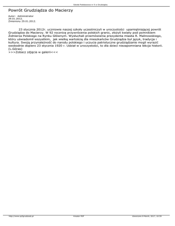 Szkoła Podstawowa nr 5 w Grudziądzu Powrót Grudziądza do Macierzy Autor: Administrator 29.01.2012. Zmieniony 29.01.2012. 23 stycznia 2012r. uczniowie naszej szkoły uczestniczyli w uroczystości upamiętniającej powrót Grudziądza do Macierzy. W 92 rocznicę przywrócenia polskich granic, złożyli kwiaty pod pomnikiem Żołnierza Polskiego na Rynku Głównym. Wysłuchali przemówienia prezydenta miasta R. Malinowskiego, który uświadomił wszystkim, jak wielką wartością dla mieszkańców Grudziądza był język, tradycja i kultura. Swoją przynależność do narodu polskiego i uczucia patriotyczne grudziądzanie mogli wyrazić swobodnie dopiero 23 stycznia 1920 r. Udział w uroczystości, to dla dzieci niezapomniana lekcja historii. (L.Góras) >>>Zobacz zdjęcia w galerii<<< http://www.sp5grudziadz.pl Kreator PDF Utworzono 8 March, 2017, 10:59