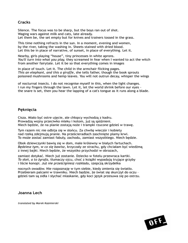 Cracks Silence. The focus was to be sharp, but the boys ran out of shot. Waging wars against milk and cats, late already. Let them be, the set empty but for knives and trainers tossed in the grass. This time nothing refracts in the sun. In a moment, evening and women, by the river, taking the washing in. Sheets stained with dried blood. Let this be in place of narrative, of sunset, in place of everything. Let it. Nearby, girls playing “house”, tiny princesses in white aprons. You'll turn into what you play, they screamed in fear when I wanted to act the witch from another fairytale. Let it be so that everything comes in images in place of touch. Let it. The child in the armchair flicking pages. This an elephant, and this a giraffe, she tells father, though the book sprouts poisoned mushrooms and hemp leaves. You will not outrun decay, whisper the wings of nocturnal insects. I do not recognise myself in this, when the light changes. I run my fingers through the lawn. Let it, let the world shrink before our eyes the snare is set, then you hear the lapping of a cat's tongue as it runs along a blade. Pęknięcia Cisza. Miało być ostre ujęcie, ale chłopcy wychodzą z kadru. Prowadzą wojny przeciwko mleku i kotom, już są spóźnieni. Niech będzie, że na planie zostają noże i trampki rzucone gdzieś w trawę. Tym razem nic nie odbija się w słońcu. Za chwilę wieczór i kobiety nad rzeką zdejmują pranie. Na prześcieradłach zaschnięte plamy krwi. To może zostać zamiast fabuły, zachodu, zamiast wszystkiego. Niech będzie. Obok dziewczynki bawią się w dom, małe królewny w białych fartuchach. Będziesz tym, w co się bawisz, krzyczały ze strachu, gdy chciałam być wiedźmą z innej bajki. Niech będzie, że wszystko przychodzi w obrazach, zamiast dotykać. Niech już zostanie. Dziecko w fotelu przewraca kartki. To słoń, a to żyrafa, tłumaczy ojcu, choć z książki wypadają trujące grzyby i liście konopi. Już nie prześcigniesz rozkładu, szepczą skrzydełka nocnych owadów. Nie rozpoznaję w tym siebie, kiedy zmienia się światło. Przebieram palcami w trawniku. Niech będzie, że świat się skurczył do oczu – gdzieś tam są sidła i słychać mlaskanie, gdy koci język przesuwa się po ostrzu. Joanna Lech translated by Marek Kazmierski