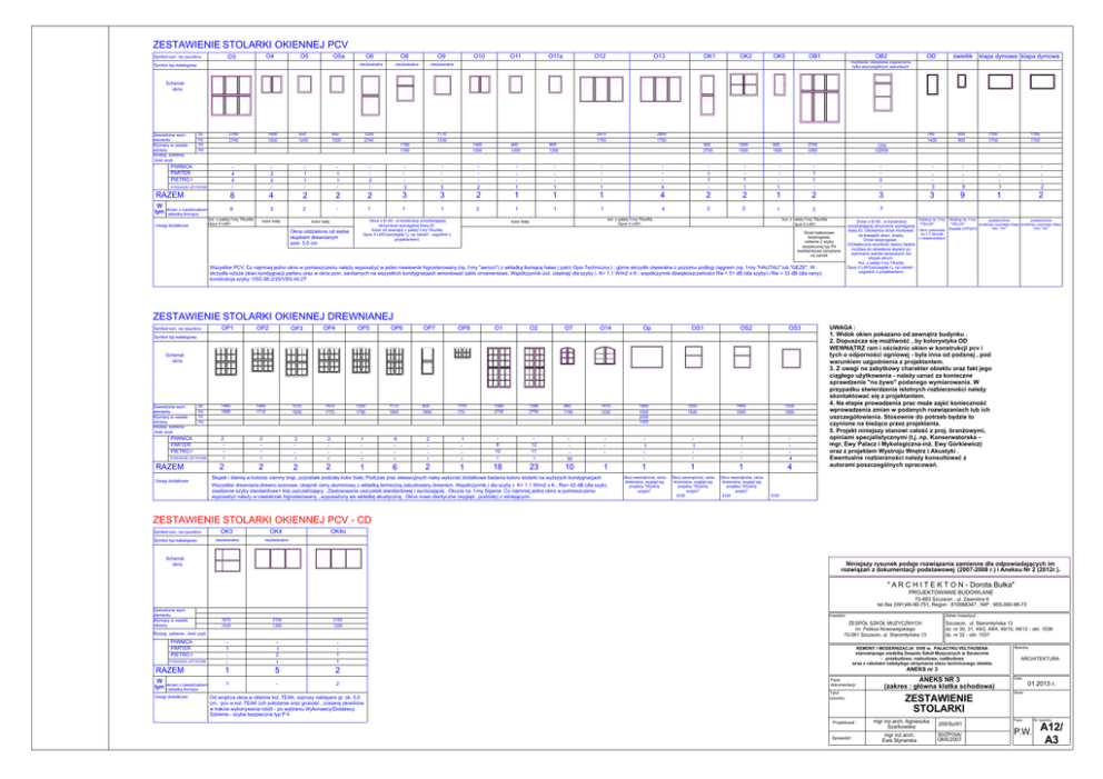 ZESTAWIENIE STOLARKI OKIENNEJ PCV O4 O3 Symbolozn. na rysunknu O5 O5a O6 O8 nieotwieralne Symbol typ katalogowy O9 nieotwieralne O10 O11 O11a O12 OK1 O13 OK2 OK5 OB1 OB2 OD świetlik klapa dymowa klapa dymowa możliwość otwierania zapewniona tylko wszczegółnych warunkach nieotwieralne Schemat okna Zewnetrzne wym. elementu Wymiary w owietle ościeży Rodzaj szklenia ilość szyb Sz Hz So Ho 2760 2740 PIWNICA PARTER PIETRO I 1400 1200 950 1200 950 1200 1250 2740 1170 1330 1190 1780 2970 1750 1400 1200 900 1200 900 1200 2 1 1 1 2800 1750 1 1 1 1 1 3 3 9 1 2 1 2 3 3 9 1 2 2 3 1 1 2 3 3 RAZEM 8 4 2 2 2 3 3 2 1 1 1 4 2 2 W z nawietrzakiem tym oknien i wkładką tłumiąca 8 2 2 1 1 1 2 1 1 1 4 2 2 kol. z palety fmy Tikurilla Opus II L491 kolor biały Uwagi dodatkowe kolor biały Okna oddzielone od siebie słupkiem drewnianym szer. 5,0 cm Okna o EI 60 , w konstrukcji umożliwiającej otrzymanie wymaganej klasy EI. Kolor od zewnątrz z palety fmy Tikurilla Opus II L491(szczegóły t.j. np odcień uzgodnić z projektantem) 1 kol. z palety fmy Tikurilla Opus II L491 kolor biały 1100 1700 1 1 1 1 PODDASZE UŻYTKOWE 1100 1700 4 2 2 2700 3350 600 900 1900 1500 4 4 950 1500 780 1400 950 2750 1250 (!)2050 kol. z palety fmy Tikurilla Opus II L491 Katalog np. fmy Katalog np. fmy powierzchnia powierzchnia Drzwi o EI 60 , w konstrukcji "VELUX" "VELUX" przekroju czynnego klapy przekroju czynnego klapy umożliwiającej otrzymanie wymaganej min. 1m2 min. 1m2 klasy EI. Ościeżnice drzwi montować Okno połaciowe Świetlik CFP0073 K=1,7 W/m2K na krawędzi zewn. ściany. z nawietrznikami Drzwi bezprogowe . (!)Ostateczna wysokość otworu będzie możliwa do określenia dopiero po wykonaniu warstw tarasowych ma stropie atrium. Kol. z palety fmy Tikurilla Opus II L491(szczegóły t.j. np odcień uzgodnić z projektantem) Drzwi balkonowe bezprogowe, szklenie z szyby bezpiecznej typ P4 bezklamkowe zamykane na zamek Wszystkie PCV. Co najmniej jedno okno w pomieszczeniu należy wyposażyć w jeden nawiewnik higrosterowany (np. fmy "aeroco") z wkładką tłumiącą hałas ( patrz Opis Techniczny ) ; górne skrzydło otwieralne z poziomu podłogi cięgnem (np. fmy "HAUTAU" lub "GEZE". W skrzydła niższe okien kondygnacji parteru oraz w okna pom. sanitarnych na wszystkich kondygnacjach wmontować szkło ornamentowe. Współczynnik izol. cieplnej( dla szyby ) K= 1,1 W/m2 x K ; współczynnik dźwiękoszczelności Rw = 51 dB (dla szyby) i Rw = 33 dB (dla ramy); konstrukcja szyby: VSG 66.2/20/VSG 44.2T ZESTAWIENIE STOLARKI OKIENNEJ DREWNIANEJ Symbolozn. na rysunknu OP3 OP4 1480 1710 1510 1930 1470 1770 2 2 2 2 1 2 2 2 2 1 OP1 OP2 1460 1990 OP5 OP6 OP7 OP8 O1 O2 O7 O14 830 1900 1110 770 1580 2750 1390 2750 960 1190 1410 1230 1900 1000 2000 1050 1000 1540 1400 1500 1300 1500 6 2 1 8 10 12 11 10 1 1 1 4 6 2 1 18 23 10 1 4 Op OS1 OS2 OS3 Symbol typ katalogowy Schemat okna Zewnetrzne wym. elementu Wymiary w owietle ościeży Rodzaj szklenia ilość szyb Sz Hz So Ho PIWNICA PARTER PIETRO I PODDASZE UŻYTKOWE RAZEM Uwagi dodatkowe 1200 1790 1170 1900 Słupek i ślemię w kolorze ciemny brąz, pozostałe podziały kolor biały. Podczas prac elewacyjnych naley wykonać dodatkowe badania koloru stolarki na wyższych kondygnacjach Wszystkie drewnianedrewno sosnowe, okapnik ramy aluminiowy z wkładką termiczną zabudowany drewnem. Współczynnik ( dla szyby ) K= 1,1 W/m2 x K ; Rw= 42 dB (dla szyb), osadzenie szyby standardowe+ klej uszczelniający . Zastosowanie uszczelek:standardowej i wyciszającej . Okucia np. fmy Sigenia .Co najmniej jedno okno w pomieszczeniu wyposażyć należy w nawietrzak higrosterowany , wyposażony we wkładkę akustyczną . Okna nowe identyczne (wygląd , podziały) z istniejącymi . 1 1 1 Okno wewnętrzne, rama drewniana, wygląd wg projektu "Wystrój wnętrz" Okno wewnętrzne, rama drewniana, wygląd wg projektu "Wystrój wnętrz" EI30 Okno wewnętrzne, rama drewniana, wygląd wg projektu "Wystrój wnętrz" EI30 UWAGA : 1. Widok okien pokazano od zewnątrz budynku . 2. Dopuszcza się możliwość , by kolorystyka OD WEWNĄTRZ ram i ościeżnic okien w konstrukcji pcv i tych o odporności ogniowej była inna od podanej , pod warunkiem uzgodnienia z projektantem. 3. Z uwagi na zabytkowy charakter obiektu oraz fakt jego ciągłego użytkowania należy uznać za konieczne sprawdzenie "na żywo" podanego wymiarowania. W przypadku stwierdzenia istotnych rozbierzności należy skontaktować się z projektantem. 4. Na etapie prowadzenia prac może zajść konieczność wprowadzenia zmian w podanych rozwiązaniach lub ich uszczegółowienia. Stosownie do potrzeb będzie to czynione na bieżąco przez projektanta. 5. Projekt niniejszy stanowi całość z proj. branżowymi, opiniami specjalistycznymi (t.j. np. Konserwatorska mgr. Ewy Palacz i Mykologicznainż. Ewy Górkiewicz) oraz z projektem Wystroju Wnętrz i Akustyki . Ewentualne rozbierzności należy konsultować z autorami poszczególnych opracowań. EI30 ZESTAWIENIE STOLARKI OKIENNEJ PCV CD Symbolozn. na rysunknu Symbol typ katalogowy OK3 OK4 nieotwieralne nieotwieralne OK4o Schemat okna Niniejszy rysunek podaje rozwiązania zamienne dla odpowiadających im rozwiązań z dokumentacji podstawowej (20072008 r.) i Aneksu Nr 2 (2012r.). " A R C H I T E K T O N Dorota Bułka" PROJEKTOWANIE BUDOWLANE 70883 Szczecin , ul. Zawrotna 6 tel./fax (091)4690751, Regon : 810068347 , NIP : 9550009873 Zewnetrzne wym. elementu Wymiary w owietle ościeży 1670 1530 3150 1350 3150 1350 1 1 2 1 1 1 RAZEM 1 5 2 W z nawietrzakiem tym oknien i wkładką tłumiąca 1 2 Rodzaj szklenia , ilość szyb PIWNICA PARTER PIETRO I PODDASZE UŻYTKOWE Uwagi dodatkowe Od wnętrza okna w okleinie kol. TEAK, szprosy naklejane gr. ok. 5,0 cm, pcv w kol. TEAK (ich położenie oraz grubość , zostaną określone w trakcie wykonywania robót po wybraniu Wykonawcy/Dostawcy. Szklenie szyba bezpieczna typ P 4 Adres inwestycji : Inwestor: ZESPÓŁ SZKÓŁ MUZYCZNYCH im. Feliksa Nowowiejskiego 70