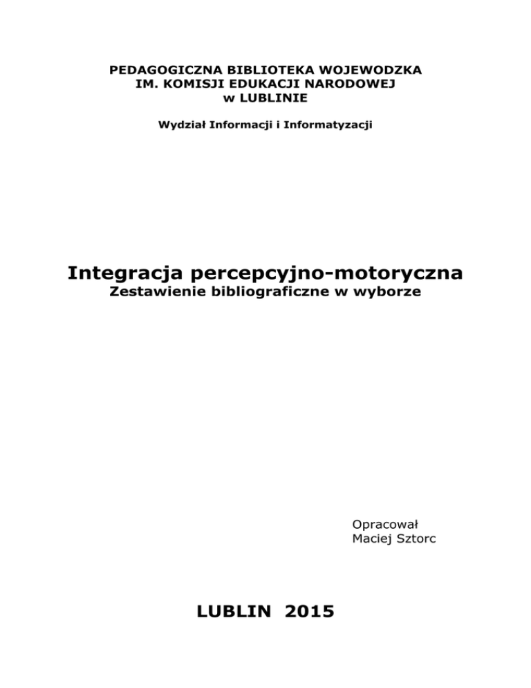PEDAGOGICZNA BIBLIOTEKA WOJEWODZKA IM. KOMISJI EDUKACJI NARODOWEJ w LUBLINIE Wydział Informacji i Informatyzacji Integracja percepcyjno-motoryczna Zestawienie bibliograficzne w wyborze Opracował Maciej Sztorc LUBLIN 2015 Wydawnictwa zwarte 1. Dysfunkcje integracji sensorycznej a sprawność językowa dzieci w młodszym wieku szkolnym / Daria Jodzis. – Gdańsk : "Harmonia Universalis", 2013. – 192 s. 2. Dzieci z zaburzeniami integracji sensorycznej : zaburzenia rozwojowo-sensoryczne oraz edukacyjne występujące w ramach autyzmu, ADHD, trudności szkolnych oraz zaburzeń dwubiegunowych / Polly Godwin Emmons, Liz McKendry Anderson. – Warszawa : K.E. Liber, 2007. – 202 s. 3. Edukacja przez ruch : kropki, kreski, owale, wiązki / Dorota Dziamska. – Warszawa : Wydawnictwa Szkolne i Pedagogiczne, cop. 2005. – 48 s. 4. Gry i zabawy we wczesnej interwencji : ćwiczenia dla dzieci z zaburzeniami ze spektrum autyzmu i przetwarzania sensorycznego / Barbara Sher. – Gdańsk : "Harmonia Universalis", 2013. – 208 s. 5. Integracja percepcyjno-motoryczna : teoria - diagnoza - terapia / Marta Bogdanowicz. – Wyd. 3. – Warszawa : Centrum Metodyczne Pomocy Psychologiczno-Pedagogicznej, 2000. – 216 s. 6. Integracja percepcyjno-motoryczna : teoria - diagnoza - terapia / Marta Bogdanowicz. – Warszawa : Centrum Metodyczne Pomocy Psychologiczno-Pedagogicznej, 2000. – S. 49-75: Integracja percepcyjno-motoryczna a czynność czytania i pisania 7. Integracja sensoryczna : odpowiedzi na pytania zadawane przez nauczycieli : formularze, listy kontrolne i praktyczne narzędzia dla nauczycieli i rodziców / Jane Koomar [et al.]. – Gdańsk : "Harmonia Universalis", 2014. – 70 s. 8. Integracja sensoryczna na co dzień / Maria Borkowska, Kinga Wagh. – Wyd. 1 (dodr.). – Warszawa : Wydaw. Lekarskie PZWL, cop. 2011. – 119 s. 9. Kynoterapia w integracji odruchów : metody i techniki neurokinezjologiczne w pracy z deficytami rozwoju psychoruchowego / Hanna Wojciechowska, Swietłana MasgutowaHawryluk ; Międzynarodowy Instytut dr Swietłany Masgutowej. Fundacja Kynoterapeutyczna "Właśnie Tak!". – Warszawa ; Bydgoszcz : Międzynarodowy Instytut dr Swietłany Masgutowej, 2006. – 132 s. 10. Metoda integracji sensorycznej w terapii małych dzieci niepełnosprawnych / Małgorzata Hwang // W:Aktualne problemy edukacji i rehabilitacji osób niepełnosprawnych w biegu życia / pod red. Zofii Palak, Anny Bujnowskiej, Agnieszki Pawlak. – Lublin : Wydaw. Uniwersytetu Marii Curie-Skłodowskiej , 2010. – S. 39-45 11. Metoda integracji sensorycznej we wspomaganiu rozwoju mowy u dzieci z uszkodzeniami ośrodkowego układu nerwowego / Bożenna Odowska-Szlachcic. – Gdańsk : "Harmonia", 2010. – 156 s. 12. Metoda Ruchu Rozwijającego Weroniki Sherborne w pracy z dziećmi z zaburzeniami integracji sensorycznej / Katarzyna Wanat-Żołądek // W: Teoretyczne i praktyczne aspekty terapii pedagogicznej osób z niepełnosprawnością / pod red. Barbary Oszustowicz, Viktora Lechty. – Kraków : Wydaw. Naukowe Uniwersytetu Pedagogicznego, 2009. – S. 113-137 13. Nie-zgrane dziecko : zaburzenia przetwarzania sensorycznego diagnoza i postępowanie / Carol Stock Kranowitz. – Gdańsk : "Harmonia Universalis", 2012. – 272 s. 14. Nie-zgrane dziecko w świecie gier i zabaw : zajęcia dla dzieci z zaburzeniami przetwarzania sensorycznego / Carol Stock Kranowitz. – Gdańsk : "Harmonia Universalis", 2012. – 340 s. 15. Problemy wychowawcze w przedszkolu : dziecko uzdolnione, zaburzenia SI, dziecko niecierpliwe, nadpobudliwość psychoruchowa, zachowania agresywne / [red. Grażyna Szeplewicz]. – Warszawa : Dr Josef Raabe Spółka Wydawnicza, cop. 2012. – 122 s. 16. Razem w szkole : klasa 1-3, edukacja wczesnoszkolna : nauczanie wielozmysłowe : poradnik dla nauczyciela / [aut. Małgorzata Taraszkiewicz, Agnieszka Karpa]. – Warszawa : Wydawnictwa Szkolne i Pedagogiczne, 2010. – 111 s. 17. Rozwijanie funkcji percepcyjno-motorycznych u dzieci sześcioletnich wykazujących fragmentaryczne deficyty rozwojowe / Ewa Zwolińska. – Bydgoszcz : Wyższa Szkoła Pedagogiczna. Wydaw. Uczelniane, 1996. – 116 s. 18. Rozwój mowy dziecka w świetle integracji sensomotorycznej / Swietłana Masgutowa, Anna Regner ; Międzynarodowy Instytut dr Swietłany Masgutowej. – Wrocław : "Continuo" : [Międzynarodowy Instytut Neurokinezjologii Rozwoju Ruchowego i Integracji Odruchów], 2009. – 167 s. 19. Trudności dzieci w domu i szkole : zaburzenia integracji sensorycznej i zachowania / Aneta Jegier // W: Mały uczeń w szkole / pod red. Anety Jegier. – Gdańsk : "Harmonia", 2010. – S. 147-156 20. Trzy sigma : współpraca półkul mózgowych w prostej integracji wzrokowo-ruchowej : badania chronometryczne / Piotr Wolski. – Kraków : Wydaw. Uniwersytetu Jagiellońskiego, cop. 2005. – 211 s. 21. Tworzenie więzi poprzez integrację sensoryczną / Ellen Yack, Paula Aquilla, Shirley Sutton. – Gdańsk : "Harmonia Universalis", 2014. – 179 s. 22. Uczenie się przez zmysły : wprowadzenie do teorii integracji sensorycznej dla rodziców i specjalistów / Violet F. Maas. – Warszawa : Wydawnictwa Szkolne i Pedagogiczne, 1998. – 159 s. 23. Wczesna interwencja terapeutyczna : stymulacja rozwoju dziecka : od noworodka do 6 roku życia / Jagoda Cieszyńska, Marta Korendo. – Kraków : Wydaw. Edukacyjne, 2008. – 326 s. 24. Wczesne wspomaganie rozwoju dzieci z uszkodzonym wzrokiem z dodatkowymi niepełnosprawnościami : poradnik dla nauczycieli / red. Grażyna Walczak. – Warszawa : Ministerstwo Edukacji Narodowej i Sportu, 2005. – 134 s. 25. Wpływ metody integracji sensoryczno-motorycznej na usprawnianie dziecka z mózgowym porażeniem dziecięcym / Teresa Gierok // W: Zmaganie się z niepełnosprawnością - kolejne wyznaczniki / pod red. Jerzego Rottermunda. – Kraków : "Impuls", 2009. – S. 141-148 26. Wskazówki metodyczne do pracy korekcyjno-wychowawczej z dziećmi wykazującymi zaburzenia percepcyj