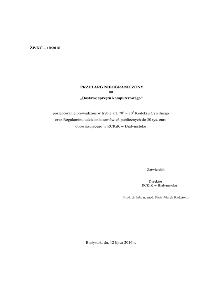 ZP/KC – 10/2016 PRZETARG NIEOGRANICZONY na „Dostawę sprzętu komputerowego” postępowanie prowadzone w trybie art. 701 – 705 Kodeksu Cywilnego oraz Regulaminu udzielania zamówień publicznych do 30 tys. euro obowiązującego w RCKiK w Białymstoku Zatwierdził: Dyrektor RCKiK w Białymstoku Prof. dr hab. n. med. Piotr Marek Radziwon Białystok, dn. 12 lipca 2016 r. Znak postępowania: ZP/KC – 10/2016 I. NAZWA I ADRES ZAMAWIAJĄCEGO Regionalne Centrum Krwiodawstwa i Krwiolecznictwa w Białymstoku, ul. M. Skłodowskiej – Curie 23, 15-950 Białystok, tel. 85 74 47 002, fax 85 74 47 133, www.rckik.bialystok.pl e-mail: [email protected] godziny urzędowania: od 730 do 1500 od poniedziałku do piątku. II. TRYB UDZIELENIA ZAMÓWIENIA Postępowanie o udzielenie zamówienia prowadzone jest w trybie przetargu nieograniczonego o wartości szacunkowej poniżej 30 000 euro na podstawie art. 4 ust. 8 ustawy z dnia 29 stycznia 2004 r. Prawo zamówień publicznych (Dz. U. z 2015 r., poz. 2164 j. t.) oraz Regulaminu udzielania zamówień publicznych do 30 000 euro obowiązującego w RCKiK w Białymstoku. Podstawę prawną opracowania Warunków przetargowych stanowią art. 701 – 705 ustawy z dnia 23 kwietnia 1964 r. Kodeks cywilny (Dz. U. z 2016 r., poz. 380 j. t.). III. OPIS CZĘŚCI ZAMÓWIENIA Zamawiający nie dopuszcza możliwości składania ofert częściowych. IV. OPIS PRZEDMIOTU ZAMÓWIENIA 1. Przedmiotem zamówienia jest dostawa sprzętu komputerowego, tj.: 1.1 jednostka systemowa – 21 szt. 1.2 monitor typ I – 2 szt. 1.3 monitor typ II – 21 szt. 1.4 UPS – 18 szt. 1.5 czytnik kodów kreskowych – 2 szt. 2. Uczestnik przetargu w ramach oferty zobowiązuje się: 2.1 zaoferować przedmiot zamówienia zgodny z opisem przedmiotu zamówienia, fabrycznie nowy (oferowane urządzenia winne być wyprodukowane nie wcześniej niż w 2015 r.), w najnowszej (najwyższej) dostępnej aktualnej wersji, kompletny i przygotowany do eksploatacji, 2.2 zaoferować przedmiot zamówienia posiadający deklarację zgodności CE (urządzenia oznaczone znakiem CE), zapewniający bezpieczną i higieniczną pracę zgodnie z obowiązującymi na terenie RP normami i przepisami, 2.3 uwzględnić akcesoria niezbędne do instalacji, podłączenia, uruchomienia, prawidłowego funkcjonowania w optymalnych warunkach i sprawdzenia zaproponowanego przedmiotu zamówienia we wszystkich miejscach jego użytkowania, 2.4 dostarczyć, wnieść, zainstalować, skonfigurować, uruchomić oraz przetestować przedmiot zamówienia we wskazanych przez Zamawiającego lokalizacjach, 2.5 przeprowadzić szkolenie stanowiskowe pracowników wskazanych przez Zamawiającego, 2.6 udzielić pełnej gwarancji na cały przedmiot zamówienia przez okres min. 24 miesięcy licząc od daty podpisania bezusterkowego Protokołu odbioru, instalacji, wdrożenia i przeszkolenia, 2.7 zapewnić dostęp do pomocy technicznej, umożliwiający zgłaszanie wad lub usterek 24 godz./dobę telefonicznie lub przez Internet. 3. Szczegółowy opis przedmiotu zamówienia określony został w Opisie przedmiotu zamówienia, stanowiącym Załącznik nr 1 do Warunków przetargowych. 4. Nazwa i kod określony według Wspólnego Słownika Zamówień (CPV) dla niniejszego przedmiotu zamówienia: 30213300-8 – komputer biurkowy, 30216130-6 – czytniki kodów kreskowych, 30231300-0 – monitory ekranowe, 48620000-0 – systemy operacyjne, 2 Znak postępowania: ZP/KC – 10/2016 48000000-8 – pakiety oprogramowania i systemy operacyjne, 30237280-5 – akcesoria zasilające, 50312000-5 – usługi w zakresie napraw i konserwacji sprzętu komputerowego. 5. Ilekroć w treści Opisu przedmiotu zamówienia, stanowiącego Załącznik nr 1 do Warunków przetargowych, użyte są znaki towarowe, patenty lub pochodzenie a także normy, Zamawiający dopuszcza rozwiązania równoważne. Przez produkt równoważny dla wyspecyfikowanego przedmiotu zamówienia w zakresie proponowanych urządzeń rozumie się taki, który w sposób poprawny współpracuje z dedykowanymi programami (aplikacjami) Zamawiającego, a jego zastosowanie nie wymaga żadnych nakładów związanych z dostosowaniem programów (aplikacji) Zamawiającego lub produktu równoważnego i posiada parametry nie gorsze niż określone w Opisie przedmiotu zamówienia. Uczestnik przetargu, który powołuje się na rozwiązania równoważne opisywanym przez Zamawiającego, zobowiązany jest wykazać, że oferowana przez niego dostawa spełnia wymagania określone przez Zamawiającego w Opisie przedmiotu zamówienia, stanowiącym Załącznik nr 1 do Warunków przetargowych. 6. Zamawiający nie dopuszcza możliwości powierzenia przez Uczestnika przetargu części lub całości zamówienia podwykonawcy. Uwaga: Podmiot świadczący usługi serwisowe wchodzące w skład udzielonej gwarancji na przedmiot zamówienia nie jest podwykonawcą w rozumieniu zapisów niniejszych Warunków przetargowych. V. TERMIN I SPOSÓB REALIZACJI ZAMÓWIENIA 1. Dostawa sprzętu wraz z instalacją, konfiguracją, uruchomieniem, przetestowaniem oraz przeszkoleniem pracowników Zamawiającego nastąpi w terminie 21 dni od daty zawarcia umowy. 2. Miejscem realizacji zamówienia jest: 1) RCKiK w Białymstoku, ul. M. Skłodowskiej-Curie 23, 15-950 Białystok, 2) RCKiK Terenowy Oddział w Hajnówce, ul. Doc. Adama Dowgirda 9, 17-200 Hajnówka. VI. OPIS WARUNKÓW UDZIAŁU W POSTĘPOWANIU O udzielenie zamówienia mogą ubiegać się Uczestnicy przetargu, którzy: 1) posiadają uprawnienia do wykonywania określonej działalności lub czynności, jeżeli przepisy prawa nakładają obowiązek ich posiadania, 2) posiadają niezbędną wiedzę i doświadczenie oraz dysponują potencjałem technicznym i osobami zdolnymi do wykonania zamówienia, 3) znajdują się w sytuacji ekonomicznej i finansowej zapewniającej wykonanie zamówienia. VII. INFORMACJA O OŚWIADCZENIACH I DOKUMENTACH Na ofertę składają się następujące dokumenty i załączniki: 1. For