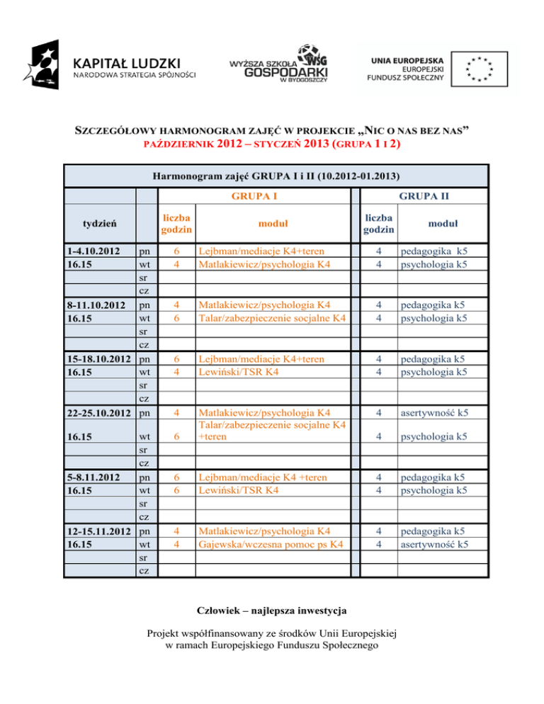 SZCZEGÓŁOWY HARMONOGRAM ZAJĘĆ W PROJEKCIE „NIC O NAS BEZ NAS” PAŹDZIERNIK 2012 – STYCZEŃ 2013 (GRUPA 1 I 2) Harmonogram zajęć GRUPA I i II (10.2012-01.2013) GRUPA I liczba godzin tydzień moduł GRUPA II liczba godzin moduł pn wt sr cz 8-11.10.2012 pn wt 16.15 sr cz 15-18.10.2012 pn wt 16.15 sr cz 22-25.10.2012 pn 6 4 Lejbman/mediacje K4+teren Matlakiewicz/psychologia K4 4 4 pedagogika k5 psychologia k5 4 6 Matlakiewicz/psychologia K4 Talar/zabezpieczenie socjalne K4 4 4 pedagogika k5 psychologia k5 6 4 Lejbman/mediacje K4+teren Lewiński/TSR K4 4 4 pedagogika k5 psychologia k5 4 4 asertywność k5 wt sr cz pn 5-8.11.2012 wt 16.15 sr cz 12-15.11.2012 pn wt 16.15 sr cz 6 Matlakiewicz/psychologia K4 Talar/zabezpieczenie socjalne K4 +teren 4 psychologia k5 6 6 Lejbman/mediacje K4 +teren Lewiński/TSR K4 4 4 pedagogika k5 psychologia k5 4 4 Matlakiewicz/psychologia K4 Gajewska/wczesna pomoc ps K4 4 4 pedagogika k5 asertywność k5 1-4.10.2012 16.15 16.15 Człowiek – najlepsza inwestycja Projekt współfinansowany ze środków Unii Europejskiej w ramach Europejskiego Funduszu Społecznego 19-22.11.2012 pn wt 16.15 sr cz 6 6 Lejbman/mediacje K4+teren Lewiński/TSR K4 4 4 pedagogika k5 psychologia k5 26-29.11.2012 pn wt 16.15 sr cz pn 3-6.12.2012 wt 16.15 sr cz 10-13.12.2012 pn wt 16.15 sr cz 7-10.01.2013 pn wt 16.15 sr cz 14-17.01.2013 pn wt 16.15 sr cz 21-24.01.2013 pn wt 16.15 sr cz 6 4 Talar/zabezpieczenie socjalne K4+teren Gajewska/wczesna pomoc ps K4 4 4 pedagogika k5 psychologia k5 4 6 Matlakiewicz/pedagogika K4 Lewiński/TSR K4 4 4 pedagogika k5 psychologia k5 4 4 Matlakiewicz/pedagogika K4 Gajewska/wczesna pomoc psK4 4 6 Matlakiewicz/pedagogika K4 Lewiński/TSR K4 4 4 Matlakiewicz/pedagogika K4 Gajewska/wczesna pomoc ps K4 6 4 Talar/zabezpieczenie socjalne K4 Gajewska/wczesna pomoc ps K4 razem 128 72 Człowiek – najlepsza inwestycja Projekt współfinansowany ze środków Unii Europejskiej w ramach Europejskiego Funduszu Społecznego