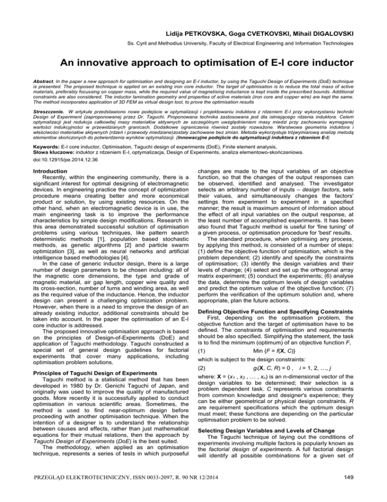 Abstract. In the paper a new approach for optimisation and designing an E-I inductor, by using the Taguchi Design of Experiments (DoE) technique