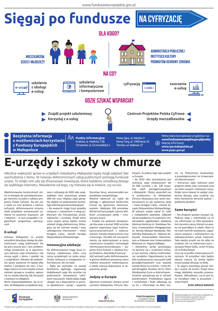 www.funduszeeuropejskie.gov.pl Sięgaj po fundusze na cyfryzację Dla kogo? administracji publicznej instytucji kultury podmiotów ochrony zdrowia Mieszkańców, dzieci i Młodzieży NA CO? szkolenia informatyczne i komputerowe szkolenia z obsługi e-usług cyfryzację tworzenie e-usług Gdzie szukać wsparcia? Znajdź projekt szkoleniowy Korzystaj z e-usług Bezpłatna informacja o możliwościach korzystania z Funduszy Europejskich w Małopolsce Punkty informacyjne: Kraków, ul. Wielicka 72B Chrzanów, ul. Grunwaldzka 5 Centrum Projektów Polska Cyfrowa Urzędy marszałkowskie Nowy Sącz, ul. Wazów 3 Nowy Targ, al. 1000-lecia 35 Tarnów, ul. Wałowa 37 Pełne dane kontaktowe znajdziesz na: www.funduszeeuropejskie.gov.pl/punkty Więcej informacji: www.rpo.malopolska.pl www.popc.gov.pl E-urzędy i szkoły w chmurze Wkrótce większość spraw w urzędach mieszkańcy Małopolski będą mogli załatwić bez wychodzenia z domu. W rozwoju elektronicznych usług publicznych pomogą fundusze unijne. To dzięki nim uda się sfinansować inwestycje, które każdemu umożliwią dostęp do szybkiego internetu. Niezależnie od tego, czy mieszka się w mieście, czy na wsi. Wyeliminowanie terytorialnych różnic w dostępie do szerokopasmowego internetu to jedno z założeń programu Polska Cyfrowa. Na ten cel, a także na inne działania z zakresu cyfryzacji, dofinansowanie otrzyma wiele projektów realizowanych zarówno na poziomie krajowym, jak i lokalnym – w tym przypadku z regionalnych programów operacyjnych. E-usługi Cyfrowa Małopolska to przede wszystkim łatwiejszy dostęp do elektronicznych usług publicznych. Do tej pory jeszcze jest z tym problem. Usługi świadczone są w ograniczonym zakresie, więc mieszkańcy i tak muszą wyjść z domu i spotkać się z urzędnikiem. Wkrótce do załatwienia spraw wystarczy im laptop albo telefon z dostępem do sieci. Z każdego miejsca na ziemi będzie można załatwić sprawę w urzędzie, zapisać się na wizytę lekarską lub korzystać z edukacji na odległość. Brzmi nieprawdopodobnie, ale to realne. W Małopolsce na działania zwią- zane z cyfryzacją do 2020 roku województwo chce przeznaczyć prawie 200 mln euro. Większa część pieniędzy pójdzie na wykorzystanie technologii informacyjno-komunikacyjnych. – Na wsparcie mogą liczyć projekty związane z rozwijaniem e-usług publicznych dla mieszkańców, przedsiębiorców i turystów. Dzięki temu coraz więcej spraw będzie można załatwić drogą elektroniczną. Wzbogacą się też cyfrowe zasoby i bazy udostępniane internautom – mówi Grzegorz Lipiec, członek Zarządu Województwa Małopolskiego. Innowacyjna edukacja Na dofinansowanie mogą liczyć instytucje szkoleniowe, które uczą rzeczy przydatnych na rynku pracy. Chodzi zwłaszcza o umiejętności informatyczne, ale nie tylko. – Będą też pieniądze na rozwój kształcenia ogólnego, organizację dodatkowych zajęć dla uczniów czy podniesienie kompetencji cyfrowych nauczycieli. Szkoły będą mogły ubiegać się o doposażenie w pomoce dydaktyczne i sprzęt – wyjaśnia Stanisław Sorys, wicemarszałek województwa małopolskiego. Właśnie zakończył się nabór do jednego z ogłoszonych konkursów. Cieszył się ogromnym zainteresowaniem. Wpłynęło 169 wniosków. Wśród nich jest projekt z gminy Wolbrom „Innowacyjna szkoła – innowacyjna praca”. – Projekt ma podnieść kompetencje kluczowe u ponad 1000 uczniów poprzez organizację zajęć matematyczno-przyrodniczych z wykorzystaniem metody eksperymentu oraz e-learningu. Ponadto 64 nauczycieli nauczy się wykorzystywać w pracy nowoczesne narzędzia i technologie informacyjno-komunikacyjne – wyjaśnia Anna Kulawik z Lokalnej Grupy Działania „Nad Białą Przemszą”. Jeśli wniosek zyska dofinansowanie, w gminie Wolbrom powstaną cztery mobilne pracownie matematyczne, a szkoły zostaną doposażone w nowoczesny sprzęt. Jedyny w Europie Ogromne możliwości otwiera przed uczniami Małopolska Chmura Edu- kacyjna. To jedyny tego typu projekt w Europie. – Do 2022 roku przewidziana jest realizacja zajęć edukacyjnych dla 24 000 uczniów z ok. 130 zespołów szkół ponadgimnazjalnych z Małopolski. Pilotaż utwierdził nas w przekonaniu, że Małopolska Chmura Edukacyjna jest warta kontynuowania na jak najszerszą skalę – mówi Grzegorz Lipiec, członek Zarządu Województwa Małopolskiego. W pilotażu wzięło udział 21 szkół z małopolskich powiatów. Odbywał się we współpracy z 6 uczelniami: Uniwersytetem Jagiellońskim, Akademią Górniczo-Hutniczą im. Stanisława Staszica, Uniwersytetem Pedagogicznym im. Komisji Edukacji Narodowej, Politechniką Krakowską im. Tadeusza Kościuszki, Uniwersytetem Ekonomicznym w Krakowie oraz Uniwersytetem Rolniczym im. Hugona Kołłątaja. – Dostaliśmy sprzęt pozwalający na łączenie się z uczelniami online, w tym kamerę, tablicę multimedialną i projektor. Organizowane są też koła naukowe przez nauczycieli szkół ponadgimnazjalnych oraz wyjazdy weekendowe na uczelnie – mówi Paweł Mrzygłód, dyrektor LO im. Marii Skłodowskiej-Curie w Andrychowie. Uczelnie specjalizują się w różnych przedmiotach. Przykładowo zajęcia z matematyki i fizyki odbywają się na UJ, z informatyki na AGH, che- mii na Politechnice Krakowskiej, a przedsiębiorczości na Uniwersytecie Ekonomicznym. – Scenariusz zajęć wykracza poza program szkoły, więc uczniowie uczą się wielu nowych i ciekawych rzeczy. Dzięki temu łatwiej im podjąć ostateczną decyzję, jaką uczelnię, czy który konkretnie kierunek wybrać – podkreśla dyrektor. Same korzyści – Ten program powala rozwijać się. Podczas zajęć z matematyki na UJ czy informatyki na AGH dowiedziałem się wielu rzeczy, których na pewno nie poznałbym w szkole. Mam tu na myśli techniki kodowania, zagadnienia związane z szyfrowaniem czy zabezpieczeniami przed hakerami. Taka wiedza przyda się nie tylko na studiach, ale i w cod