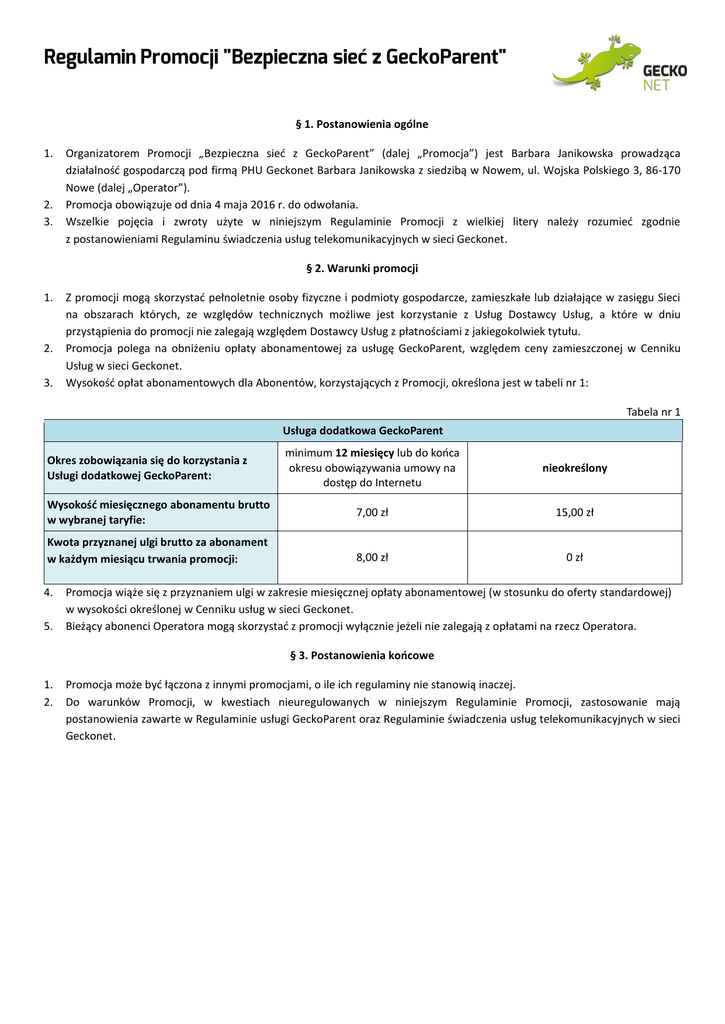 § 1. Postanowienia ogólne 1. 2. 3. Organizatorem Promocji „Bezpieczna sieć z GeckoParent” (dalej „Promocja”) jest Barbara Janikowska prowadząca działalność gospodarczą pod firmą PHU Geckonet Barbara Janikowska z siedzibą w Nowem, ul. Wojska Polskiego 3, 86-170 Nowe (dalej „Operator”). Promocja obowiązuje od dnia 4 maja 2016 r. do odwołania. Wszelkie pojęcia i zwroty użyte w niniejszym Regulaminie Promocji z wielkiej litery należy rozumieć zgodnie z postanowieniami Regulaminu świadczenia usług telekomunikacyjnych w sieci Geckonet. § 2. Warunki promocji 1. 2. 3. Z promocji mogą skorzystać pełnoletnie osoby fizyczne i podmioty gospodarcze, zamieszkałe lub działające w zasięgu Sieci na obszarach których, ze względów technicznych możliwe jest korzystanie z Usług Dostawcy Usług, a które w dniu przystąpienia do promocji nie zalegają względem Dostawcy Usług z płatnościami z jakiegokolwiek tytułu. Promocja polega na obniżeniu opłaty abonamentowej za usługę GeckoParent, względem ceny zamieszczonej w Cenniku Usług w sieci Geckonet. Wysokość opłat abonamentowych dla Abonentów, korzystających z Promocji, określona jest w tabeli nr 1: Tabela nr 1 Usługa dodatkowa GeckoParent Okres zobowiązania się do korzystania z Usługi dodatkowej GeckoParent: Wysokość miesięcznego abonamentu brutto w wybranej taryfie: Kwota przyznanej ulgi brutto za abonament w każdym miesiącu trwania promocji: 4. 5. minimum 12 miesięcy lub do końca okresu obowiązywania umowy na dostęp do Internetu nieokreślony 7,00 zł 15,00 zł 8,00 zł 0 zł Promocja wiąże się z przyznaniem ulgi w zakresie miesięcznej opłaty abonamentowej (w stosunku do oferty standardowej) w wysokości określonej w Cenniku usług w sieci Geckonet. Bieżący abonenci Operatora mogą skorzystać z promocji wyłącznie jeżeli nie zalegają z opłatami na rzecz Operatora. § 3. Postanowienia końcowe 1. 2. Promocja może być łączona z innymi promocjami, o ile ich regulaminy nie stanowią inaczej. Do warunków Promocji, w kwestiach nieuregulowanych w niniejszym Regulaminie Promocji, zastosowanie mają postanowienia zawarte w Regulaminie usługi GeckoParent oraz Regulaminie świadczenia usług telekomunikacyjnych w sieci Geckonet.