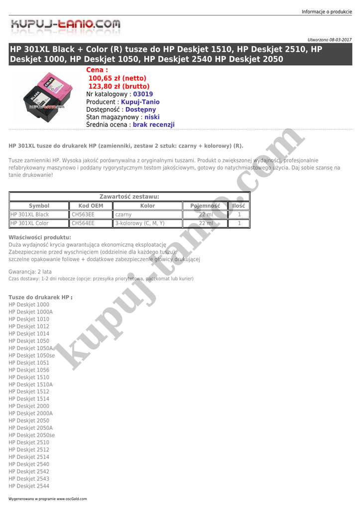 Informacje o produkcie Utworzono 08-03-2017 HP 301XL Black + Color (R) tusze do HP Deskjet 1510, HP Deskjet 2510, HP Deskjet 1000, HP Deskjet 1050, HP Deskjet 2540 HP Deskjet 2050 Cena : 100,65 zł (netto) 123,80 zł (brutto) io .c om Nr katalogowy : 03019 Producent : Kupuj-Tanio Dostępność : Dostępny Stan magazynowy : niski Średnia ocena : brak recenzji HP 301XL tusze do drukarek HP (zamienniki, zestaw 2 sztuk: czarny + kolorowy) (R). Tusze zamienniki HP. Wysoka jakość porównywalna z oryginalnymi tuszami. Produkt o zwiększonej wydajności, profesjonalnie refabrykowany maszynowo i poddany rygorystycznym testom jakościowym, gotowy do natychmiastowego użycia. Daj sobie szansę na tanie drukowanie! Zawartość zestawu: Symbol Kod OEM Kolor CH563EE czarny HP 301XL Color CH564EE 3-kolorowy (C, M, Y) Ilość 22 ml 1 22 ml 1 an HP 301XL Black Pojemność Gwarancja: 2 lata -t Właściwości produktu: Duża wydajność krycia gwarantująca ekonomiczną eksploatację Zabezpieczenie przed wyschnięciem (oddzielnie dla każdego tuszu): szczelne opakowanie foliowe + dodatkowe zabezpieczenie głowicy drukującej ku p Tusze do drukarek HP : HP Deskjet 1000 HP Deskjet 1000A HP Deskjet 1010 HP Deskjet 1012 HP Deskjet 1014 HP Deskjet 1050 HP Deskjet 1050A HP Deskjet 1050se HP Deskjet 1051 HP Deskjet 1056 HP Deskjet 1510 HP Deskjet 1510A HP Deskjet 1512 HP Deskjet 1514 HP Deskjet 2000 HP Deskjet 2000A HP Deskjet 2050 HP Deskjet 2050A HP Deskjet 2050se HP Deskjet 2510 HP Deskjet 2512 HP Deskjet 2514 HP Deskjet 2540 HP Deskjet 2542 HP Deskjet 2543 HP Deskjet 2544 uj Czas dostawy: 1-2 dni robocze (opcje: przesyłka priorytetowa, paczkomat lub kurier) Wygenerowano w programie www.oscGold.com io .c om an ku p uj -t HP Deskjet 2547 HP Deskjet 2548 HP Deskjet 2549 HP Deskjet 3000 HP Deskjet 3000A HP Deskjet 3000 WiFi HP Deskjet 3050 HP Deskjet 3050 WiFi HP Deskjet 3050A HP Deskjet 3050A WiFi HP Deskjet 3050se HP Deskjet 3050ve HP Deskjet 3052A HP Deskjet 3054 HP Deskjet 3054A HP Deskjet 3055A HP Deskjet 3057A HP Deskjet 3059A HP Deskjet 3510 HP Envy 4500 HP Envy 4502 HP Envy 4503 HP Envy 4504 HP Envy 4505 HP Envy 4507 HP Envy 4508 HP Envy 5530 HP Envy 5532 HP Envy 5534 HP Envy 5536 HP Envy 5539 HP Officejet 2620 HP Officejet 2622 HP Officejet 2624 HP Officejet 4630 HP Officejet 4632 HP Officejet 4634 HP Officejet 4636 HP Officejet 4639 oraz innych urządzeń wykorzystujących te tusze Jeśli na liście nie ma Twojego urządzenia lub nie jesteś pewny, jaki tusz będzie odpowiedni do Twojej drukarki, skontaktuj się z nami. Chętnie pomożemy Ci dobrać odpowiedni kartridż. hp301bk, hp301 bk, hp301xl bk, hp301 xl bk, hp 301bk, hp 301 bk, hp 301xl bk, hp 301 xl bk, hp-301bk, hp-301 bk, hp-301xl bk, hp-301 xl bk, hp301c, hp301 c, hp301xl c, hp301 xl c, hp 301c, hp 301 c, hp 301xl c, hp 301 xl c, hp-301c, hp-301 c, hp-301xl c, hp-301 xl c, hp301color, hp301 color, hp301xl color, hp301 xl color, hp 301color, hp 301 color, hp 301xl color, hp 301 xl color, hp-301color, hp-301 color, hp-301xl color, hp-301 xl color, hp301kolorowy, hp301 kolorowy, hp301xl kolorowy, hp301 xl kolorowy, hp 301kolorowy, hp 301 kolorowy, hp 301xl kolorowy, hp 301 xl kolorowy, hp-301kolorowy, hp-301 kolorowy, hp-301xl kolorowy, hp-301 xl kolorowy