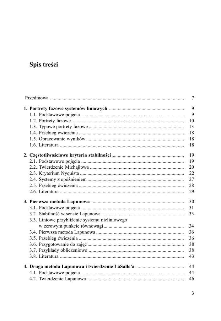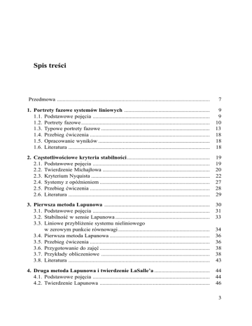 Spis treci Przedmowa ........................................................................................................... 7 1. Portrety fazowe systemów liniowych ............................................................ 9 1.1. Podstawowe pojêcia .................................................................................. 9 1.2. Portrety fazowe .......................................................................................... 10 1.3. Typowe portrety fazowe ............................................................................ 13 1.4. Przebieg æwiczenia .................................................................................... 18 1.5. Opracowanie wyników .............................................................................. 18 1.6. Literatura ................................................................................................... 18 2. Czêstotliwociowe kryteria stabilnoci .......................................................... 2.1. Podstawowe pojêcia .................................................................................. 2.2. Twierdzenie Michaj³owa ........................................................................... 2.3. Kryterium Nyquista ................................................................................... 2.4. Systemy z opónieniem ............................................................................. 2.5. Przebieg æwiczenia .................................................................................... 2.6. Literatura ................................................................................................... 19 19 20 22 27 28 29 3. Pierwsza metoda Lapunowa .......................................................................... 3.1. Podstawowe pojêcia .................................................................................. 3.2. Stabilnoæ w sensie Lapunowa .................................................................. 3.3. Liniowe przybli¿enie systemu nieliniowego w zerowym punkcie równowagi ................................................................ 3.4. Pierwsza metoda Lapunowa ...................................................................... 3.5. Przebieg æwiczenia .................................................................................... 3.6. Przygotowanie do zajêæ ............................................................................. 3.7. Przyk³ady obliczeniowe ............................................................................ 3.8. Literatura ................................................................................................... 30 31 33 34 36 36 38 38 43 4. Druga metoda Lapunowa i twierdzenie LaSallea ....................................... 4.1. Podstawowe pojêcia .................................................................................. 4.2. Twierdzenie Lapunowa ............................................................................. 44 44 46 3 4.3. 4.4. 4.5. 4.6. 4.7. Zasada LaSallea ....................................................................................... 48 Przebieg æwiczenia .................................................................................... 55 Zadania do rozwi¹zania ............................................................................. 56 Przyk³ad obliczeniowy .............................................................................. 57 Literatura ................................................................................................... 62 5. Kryterium ko³a i twierdzenie Popova ........................................................... 63 5.1. Kryterium ko³a ........................................................................................... 63 5.2. Twierdzenie Popova .................................................................................. 69 5.3. Wykorzystanie MATLAB-a ....................................................................... 76 5.4. Przebieg æwiczenia .................................................................................... 77 5.5. Przyk³ad obliczeniowy .............................................................................. 78 5.6. Literatura ................................................................................................... 79 4 6. Optymalizacja parametryczna ...................................................................... 6.1. Podstawowe pojêcia .................................................................................. 6.2. Analityczne rozwi¹zanie zadania optymalizacji parametrycznej ............. 6.3. Numeryczne rozwi¹zanie zadania optymalizacji parametrycznej ............ 6.4. Przebieg æwiczenia .................................................................................... 6.5. Przyk³ady obliczeniowe ............................................................................ 6.6. Literatura ................................................................................................... 80 80 91 96 99 100 107 7. Systemy dyskretne ........................................................................................... 7.1. Sterowanie komputerowe .......................................................................... 7.2. Dobór okresu próbkowania ....................................................................... 7.3. Schematy ró¿nicowe .................................................................................. 7.4. Dodatkowe uwagi na temat dynamiki systemów dyskretnych ................. 7.5. Zadania do rozwi¹zania ............................................................................. 7.6. Literatura ................................................................................................... 108 108 110 112 114 120 121 8. Uk³ady liniowe z regulatorami przekanikowymi ....................................... 8.1. Wstêp ...............................................................
