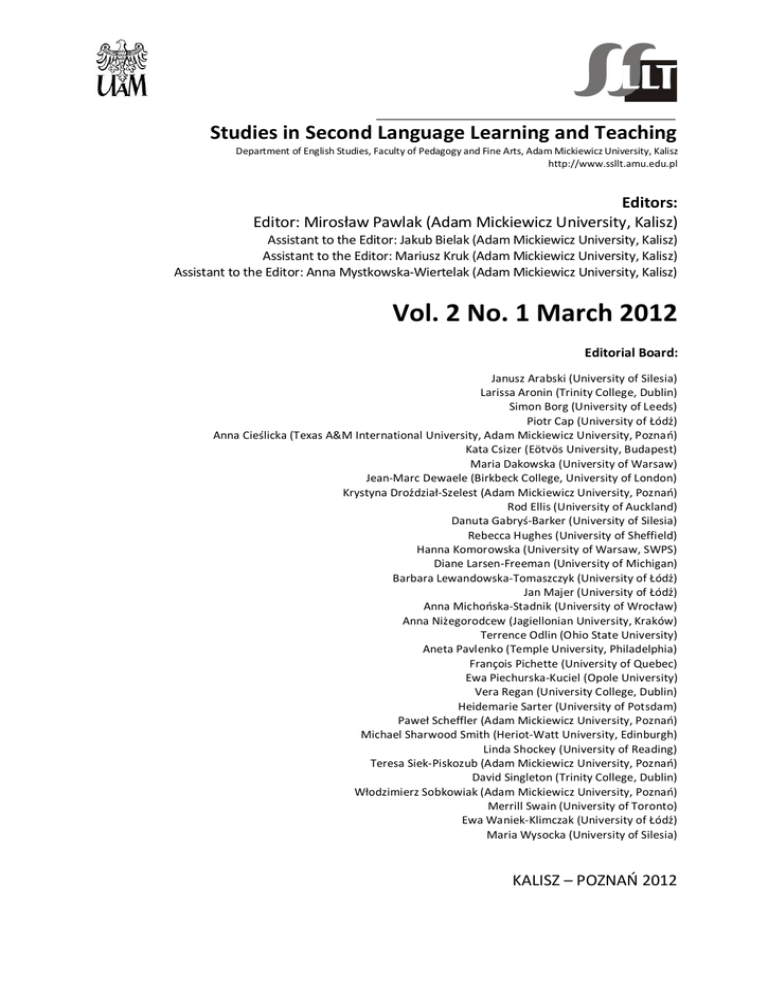 Studies in Second Language Learning and Teaching Department of English Studies, Faculty of Pedagogy and Fine Arts, Adam Mickiewicz University, Kalisz http://www.ssllt.amu.edu.pl Editors: Editor: Miros aw Pawlak (Adam Mickiewicz University, Kalisz) Assistant to the Editor: Jakub Bielak (Adam Mickiewicz University, Kalisz) Assistant to the Editor: Mariusz Kruk (Adam Mickiewicz University, Kalisz) Assistant to the Editor: Anna Mystkowska-Wiertelak (Adam Mickiewicz University, Kalisz) Vol. 2 No. 1 March 2012 Editorial Board: Janusz Arabski (University of Silesia) Larissa Aronin (Trinity College, Dublin) Simon Borg (University of Leeds) Piotr Cap (University of ód ) Anna Cie licka (Texas A&M International University, Adam Mickiewicz University, Pozna ) Kata Csizer (Eötvös University, Budapest) Maria Dakowska (University of Warsaw) Jean-Marc Dewaele (Birkbeck College, University of London) Krystyna Dro dzia -Szelest (Adam Mickiewicz University, Pozna ) Rod Ellis (University of Auckland) Danuta Gabry -Barker (University of Silesia) Rebecca Hughes (University of Sheffield) Hanna Komorowska (University of Warsaw, SWPS) Diane Larsen-Freeman (University of Michigan) Barbara Lewandowska-Tomaszczyk (University of ód ) Jan Majer (University of ód ) Anna Micho ska-Stadnik (University of Wroc aw) Anna Ni egorodcew (Jagiellonian University, Kraków) Terrence Odlin (Ohio State University) Aneta Pavlenko (Temple University, Philadelphia) François Pichette (University of Quebec) Ewa Piechurska-Kuciel (Opole University) Vera Regan (University College, Dublin) Heidemarie Sarter (University of Potsdam) Pawe Scheffler (Adam Mickiewicz University, Pozna ) Michael Sharwood Smith (Heriot-Watt University, Edinburgh) Linda Shockey (University of Reading) Teresa Siek-Piskozub (Adam Mickiewicz University, Pozna ) David Singleton (Trinity College, Dublin) odzimierz Sobkowiak (Adam Mickiewicz University, Pozna ) Merrill Swain (University of Toronto) Ewa Waniek-Klimczak (University of ód ) Maria Wysocka (University of Silesia) KALISZ – POZNA 2012 EDITOR: Miros aw Pawlak ASSISTANTS TO THE EDITOR: Jakub Bielak Mariusz Kruk Anna Mystkowska-Wiertelak © Copyright by Wydzia Pedagogiczno-Artystyczny, UAM Pozna Proofreading: Melanie Ellis Cover design: Joanna Dudek Typesetting: Piotr Bajak ISSN 2083-5205 eISSN 2084-1965 Studies in Second Language Learning and Teaching is published both in print and online, with the print edition being the original version. Published by: Department of English Studies Faculty of Pedagogy and Fine Arts, Kalisz Adam Mickiewicz University, Pozna Contact information: 62-800 Kalisz, ul. Nowy wiat 28-30 tel. +48 62 7670730 fax +48 62 7645721 Printing and binding: Perfekt Gaul i wspólnicy sp. j., ul. wierzawska 1, 60-321 Pozna Studies in Second Language Learning and Teaching Department of English Studies, Faculty of Pedagogy and Fine Arts, Adam Mickiewicz University, Kalisz Volume 2, Number 1, March 2012 http://www.ssllt.amu.edu.pl Contents Notes on Contributors ....................................................................... 5 Editorial ............................................................................................ 7 Articles: Xiaoli Jiang, Andrew D. Cohen – A critical review of research on strategies in learning Chinese as both a second and foreign language..................... 9 Ma gorzata Baran- ucarz – Ego boundaries and attainments in FL pronunciation ..................................................................................... 45 Déogratias Nizonkiza – Quantifying controlled productive knowledge of collocations across proficiency and word frequency levels .......... 67 Hadi Farjami – EFL learners’ metaphors and images about foreign language learning ............................................................................... 93 Darío Luis Banegas – Integrating content and language in English language teaching in secondary education: Models, benefits, and challenges ............................................................................................... 111 Book reviews ................................................................................. 137 Notes to Contributors ..................................................................... 143 Studies in Second Language Learning and Teaching Department of English Studies, Faculty of Pedagogy and Fine Arts, Adam Mickiewicz University, Kalisz http://www.ssllt.amu.edu.pl Notes on Contributors Darío Luis Banegas is a teacher of English, holds an MA in ELT, and is a PhD student at Warwick University. He works as a secondary school teacher, advisor, and curriculum designer at Ministerio de Educación del Chubut, Argentina. He is also involved in teacher education programmes, international projects with the British Council, and research projects. His main interests are materials development, CLIL, and action research for teacher development. Contact details: (e-mail: [email protected]) Ma gorzata Baran- ucarz received her PhD degree in Applied Linguistics in 2004 with a dissertation entitled Field Independence as a Predictor of Success in Foreign Language Pronunciation Acquisition and Learning. She is an assistant professor at the University of Wroc aw and since 1998 has been a teacher at the Teacher Training College in Wroc aw. Her main areas of interest are methodology of FL teaching, SLA (particularly with regard to individual learner differences and FL pronunciation acquisition), psycholinguistics, phonetics and pronunciation pedagogy. Contact details: (e-mail: [email protected]) Andrew D. Cohen, a professor in phased retirement from the Program in Second Language Studies at the University of Minnesota, has researched language learner strategies since the early 1970s. He has published numerous journal articles and book chapters on language learning, language assessment, and research methods. Among his recent books are Language Learner Strategies with Macaro (Oxford, 2007), Teaching a
