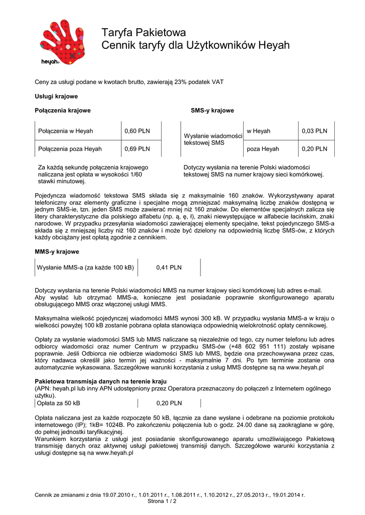 Taryfa Pakietowa Cennik taryfy dla Użytkowników Heyah Ceny za usługi podane w kwotach brutto, zawierają 23% podatek VAT Usługi krajowe Połączenia krajowe SMS-y krajowe Połączenia w Heyah 0,60 PLN Połączenia poza Heyah 0,69 PLN Wysłanie wiadomości tekstowej SMS Za każdą sekundę połączenia krajowego naliczana jest opłata w wysokości 1/60 stawki minutowej. w Heyah 0,03 PLN poza Heyah 0,20 PLN Dotyczy wysłania na terenie Polski wiadomości tekstowej SMS na numer krajowy sieci komórkowej. Pojedyncza wiadomość tekstowa SMS składa się z maksymalnie 160 znaków. Wykorzystywany aparat telefoniczny oraz elementy graficzne i specjalne mogą zmniejszać maksymalną liczbę znaków dostępną w jednym SMS-ie, tzn. jeden SMS może zawierać mniej niż 160 znaków. Do elementów specjalnych zalicza się litery charakterystyczne dla polskiego alfabetu (np. ą, ę, ł), znaki niewystępujące w alfabecie łacińskim, znaki narodowe. W przypadku przesyłania wiadomości zawierającej elementy specjalne, tekst pojedynczego SMS-a składa się z mniejszej liczby niż 160 znaków i może być dzielony na odpowiednią liczbę SMS-ów, z których każdy obciążany jest opłatą zgodnie z cennikiem. MMS-y krajowe Wysłanie MMS-a (za każde 100 kB) 0,41 PLN Dotyczy wysłania na terenie Polski wiadomości MMS na numer krajowy sieci komórkowej lub adres e-mail. Aby wysłać lub otrzymać MMS-a, konieczne jest posiadanie poprawnie skonfigurowanego aparatu obsługującego MMS oraz włączonej usługi MMS. Maksymalna wielkość pojedynczej wiadomości MMS wynosi 300 kB. W przypadku wysłania MMS-a w kraju o wielkości powyżej 100 kB zostanie pobrana opłata stanowiąca odpowiednią wielokrotność opłaty cennikowej. Opłaty za wysłanie wiadomości SMS lub MMS naliczane są niezależnie od tego, czy numer telefonu lub adres odbiorcy wiadomości oraz numer Centrum w przypadku SMS-ów (+48 602 951 111) zostały wpisane poprawnie. Jeśli Odbiorca nie odbierze wiadomości SMS lub MMS, będzie ona przechowywana przez czas, który nadawca określił jako termin jej ważności - maksymalnie 7 dni. Po tym terminie zostanie ona automatycznie wykasowana. Szczegółowe warunki korzystania z usług MMS dostępne są na www.heyah.pl Pakietowa transmisja danych na terenie kraju (APN: heyah.pl lub inny APN udostępniony przez Operatora przeznaczony do połączeń z Internetem ogólnego użytku). Opłata za 50 kB 0,20 PLN Opłata naliczana jest za każde rozpoczęte 50 kB, łącznie za dane wysłane i odebrane na poziomie protokołu internetowego (IP); 1kB= 1024B. Po zakończeniu połączenia lub o godz. 24.00 dane są zaokrąglane w górę, do pełnej jednostki taryfikacyjnej. Warunkiem korzystania z usługi jest posiadanie skonfigurowanego aparatu umożliwiającego Pakietową transmisję danych oraz aktywnej usługi pakietowej transmisji danych. Szczegółowe warunki korzystania z usługi dostępne są na www.heyah.pl Cennik ze zmianami z dnia 19.07.2010 r., 1.01.2011 r., 1.08.2011 r., 1.10.2012 r., 27.05.2013 r., 19.01.2014 r. Strona 1 / 2 Biuro Obsługi Użytkownika *2222 lub 888 00 2222 1,00 PLN za minutę połączenia krajowego Uzupełnienie konta wysłanie Ekspresowego kodu Heyah *109*14-cyfrowy kod uzupełniający# bezpłatne Objaśnienia Do cen netto doliczany jest podatek VAT w wysokości 23%. Stan konta oraz kwota za połączenia, SMS-y i pozostałe usługi są rozliczane według cen netto. Przy informowaniu klienta o stanie konta podawana jest kwota w wartości brutto (z VAT), zaokrąglona do najbliższego grosza. Abonenckie Usługi Specjalne 19 XYZ (5 cyfr) Połączenia do użytkowników krajowych sieci stacjonarnych dotyczą również połączeń z numerami skróconymi Abonenckich Usług Specjalnych 19 XYZ. Na terenie Polski i podczas pobytu za granicą Użytkownik Usługi Heyah może uzupełnić swoje konto korzystając z usługi Ekspresowe kody Heyah. Minimalna wartość doładowania przedłużającego ważność konta określa Cennik doładowań dla Użytkowników Usługi Heyah. Jeśli w dniu uzupełnienia konto jest ważne na połączenia wychodzące, to nowa data jego ważności liczona jest od dnia aktualnej daty ważności konta na połączenia wychodzące. Jeśli w dniu uzupełnienia konto nie jest ważne na połączenia wychodzące, to nowa data jego ważności liczona jest od dnia doładowania. Przedłużenia ważności konta na połączenia wychodzące można dokonać maksymalnie na okres do 12 miesięcy. Jeśli nie podano inaczej, ceny za połączenia dotyczą opłat za minutę połączenia. Minimalna opłata za połączenie płatne bez względu na długość jego trwania wynosi 1 grosz netto. Opłaty z tytułu korzystania z usług mogą być naliczane z opóźnieniem. Połączenia z numerami niewymienionymi w cennikach i materiałach informacyjnych Heyah mogą być zablokowane. Operator – T-Mobile Polska S.A. Pozostałe usługi i warunki świadczenia usług niewymienione w niniejszym cenniku są zgodne z warunkami opisanymi w Cenniku usług dla Użytkowników Heyah. Cennik ważny od 1.03.2010 r. Cennik ze zmianami z dnia 19.07.2010 r., 1.01.2011 r., 1.08.2011 r., 1.10.2012 r., 27.05.2013 r., 19.01.2014 r. Strona 2 / 2