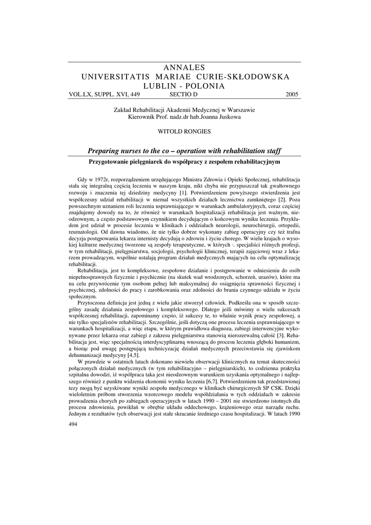 ANNALES UNIVERSITATIS MARIAE CURIE-SKŁODOWSKA LUBLIN - POLONIA VOL.LX, SUPPL. XVI, 449 SECTIO D 2005 Zakład Rehabilitacji Akademii Medycznej w Warszawie Kierownik Prof. nadz.dr hab.Joanna Juskowa WITOLD RONGIES Preparing nurses to the co – operation with rehabilitation staff Przygotowanie pielęgniarek do współpracy z zespołem rehabilitacyjnym Gdy w 1972r, rozporządzeniem urzędującego Ministra Zdrowia i Opieki Społecznej, rehabilitacja stała się integralną częścią leczenia w naszym kraju, nikt chyba nie przypuszczał tak gwałtownego rozwoju i znaczenia tej dziedziny medycyny [1]. Potwierdzeniem powyższego stwierdzenia jest współczesny udział rehabilitacji w niemal wszystkich działach lecznictwa zamkniętego [2]. Poza powszechnym uznaniem roli leczenia usprawniającego w warunkach ambulatoryjnych, coraz częściej znajdujemy dowody na to, że również w warunkach hospitalizacji rehabilitacja jest ważnym, nieodzownym, a często podstawowym czynnikiem decydującym o końcowym wyniku leczenia. Przykładem jest udział w procesie leczenia w klinikach i oddziałach neurologii, neurochirurgii, ortopedii, reumatologii. Od dawna wiadomo, że nie tylko dobrze wykonany zabieg operacyjny czy też trafna decyzja postępowania lekarza internisty decydują o zdrowiu i życiu chorego. W wielu krajach o wysokiej kulturze medycznej tworzone są zespoły terapeutyczne, w których ·. specjaliści różnych profesji, w tym rehabilitacji, pielęgniarstwa, socjologii, psychologii klinicznej, terapii zajęciowej wraz z lekarzem prowadzącym, wspólnie ustalają program działań medycznych mających na celu optymalizację rehabilitacji. Rehabilitacja, jest to kompleksowe, zespołowe działanie i postępowanie w odniesieniu do osób niepełnosprawnych fizycznie i psychicznie (na skutek wad wrodzonych, schorzeń, urazów), które ma na celu przywrócenie tym osobom pełnej lub maksymalnej do osiągnięcia sprawności fizycznej i psychicznej, zdolności do pracy i zarobkowania oraz zdolności do brania czynnego udziału w życiu społecznym. Przytoczona definicja jest jedną z wielu jakie stworzył człowiek. Podkreśla ona w sposób szczególny zasadę działania zespołowego i kompleksowego. Dlatego jeśli mówimy o wielu sukcesach współczesnej rehabilitacji, zapominamy często, iż sukcesy te, to właśnie wynik pracy zespołowej, a nie tylko specjalistów rehabilitacji. Szczególnie, jeśli dotyczą one procesu leczenia usprawniającego w warunkach hospitalizacji, a więc etapu, w którym prawidłowa diagnoza, zabiegi interwencyjne wykonywane przez lekarza oraz zabiegi z zakresu pielęgniarstwa stanowią nierozerwalną całość [3]. Rehabilitacja jest, więc specjalnością interdyscyplinarną wnoszącą do procesu leczenia głęboki humanizm, a biorąc pod uwagę postępującą technicyzację działań medycznych przeciwstawia się zjawiskom dehumanizacji medycyny [4,5]. W prawdzie w ostatnich latach dokonano niewielu obserwacji klinicznych na temat skuteczności połączonych działań medycznych (w tym rehabilitacyjno – pielęgniarskich), to codzienna praktyka szpitalna dowodzi, iż współpraca taka jest nieodzownym warunkiem uzyskania optymalnego i najlepszego również z punktu widzenia ekonomii wyniku leczenia [6,7]. Potwierdzeniem tak przedstawionej tezy mogą być uzyskiwane wyniki zespołu medycznego w klinikach chirurgicznych SP CSK. Dzięki wieloletnim próbom stworzenia wzorcowego modelu współdziałania w tych oddziałach w zakresie prowadzenia chorych po zabiegach operacyjnych w latach 1990 – 2001 nie stwierdzono istotnych dla procesu zdrowienia, powikłań w obrębie układu oddechowego, krążeniowego oraz narządu ruchu. Jednym z rezultatów tych obserwacji jest stałe skracanie średniego czasu hospitalizacji. W latach 1990 494 – 1998 po zabiegach operacyjnych, średni czas pobytu w klinikach chirurgicznych wynosił 18.2 dni. Dla porównania w roku 1999 wyniósł 14.1, w roku 2000 12.8, a w roku 2001 już tylko 10.87 dnia (informacje Działu Analiz Ekonomicznych SP CSK). Analizując powyższe dane, należy sądzić, iż osiągnięty rezultat to wynik między innymi ściślejszej współpracy lekarza prowadzącego z zespołem pielęgniarsko – rehabilitacyjnym. Potwierdzeniem przytoczonego przypuszczenia jest zdecydowanie większa i stale rosnąca liczba skierowań lekarskich z prośbą o włączenie zabiegów rehabilitacyjnych w latach poddanych obserwacji. Dla przykładu w latach 1990 – 1998 u ok. 41% hospitalizowanych w oddziale chirurgicznym wprowadzono tzw. rehabilitację przyłóżkową do procesu leczenia, a w latach 1998 – 2001 aż u ok. 62% operowanych. Ta zmiana poniekąd wymusiła szerszą współpracę zespołu pielęgniarsko – rehabilitacyjnego i dotyczyła takich wspólnych działań jak: a) Prowadzenie ćwiczeń oddechowych b) Stosowania pozycji drenażowych c) Ćwiczeń ze wspomaganym odksztuszaniem d) Szybkiej pionizacji e) Ćwiczeń czynnych kkd w ramach profilaktyki przeciwzakrzepowej f) Aktywizacji pacjenta do czynności samoobsługi g) Działań przeciwodleżynowych h) Działań psychoterapeutycznych, ze szczególnym uwzględnieniem terapii motywacyjnej i) Synchronizacji zabiegów pielęgnacyjnych, opatrunkowych z działalnością rehabilitacyjną j) Przestrzegania zasad profilaktycznych w zakresie stosowania wkłuć dożylnych, k) Przestrzegania zasad pionizacji l) Przestrzegania zasad higieny wewnątrzszpitalnej Częstsze angażowanie zespołu rehabilitacyjnego w oddziałach chirurgicznych, było rezultatem coraz lepszych ocen tego postępowania przez lekarzy – chirurgów. Musiało ono również zaowocować doskonaleniem zasad współpracy zespołu rehabilitacyjno – pielęgniarskiego. Założono, iż osiągnięcie tego celu umożliwi wspólne uczestnictwo pielęgniarek i rehabilitantów w: a) Posiedzeniach chirurgicznych, b) Wykładach prowadzonych przez specjalistów rehabilitacji o tematyce z zakresu działania biologiczn