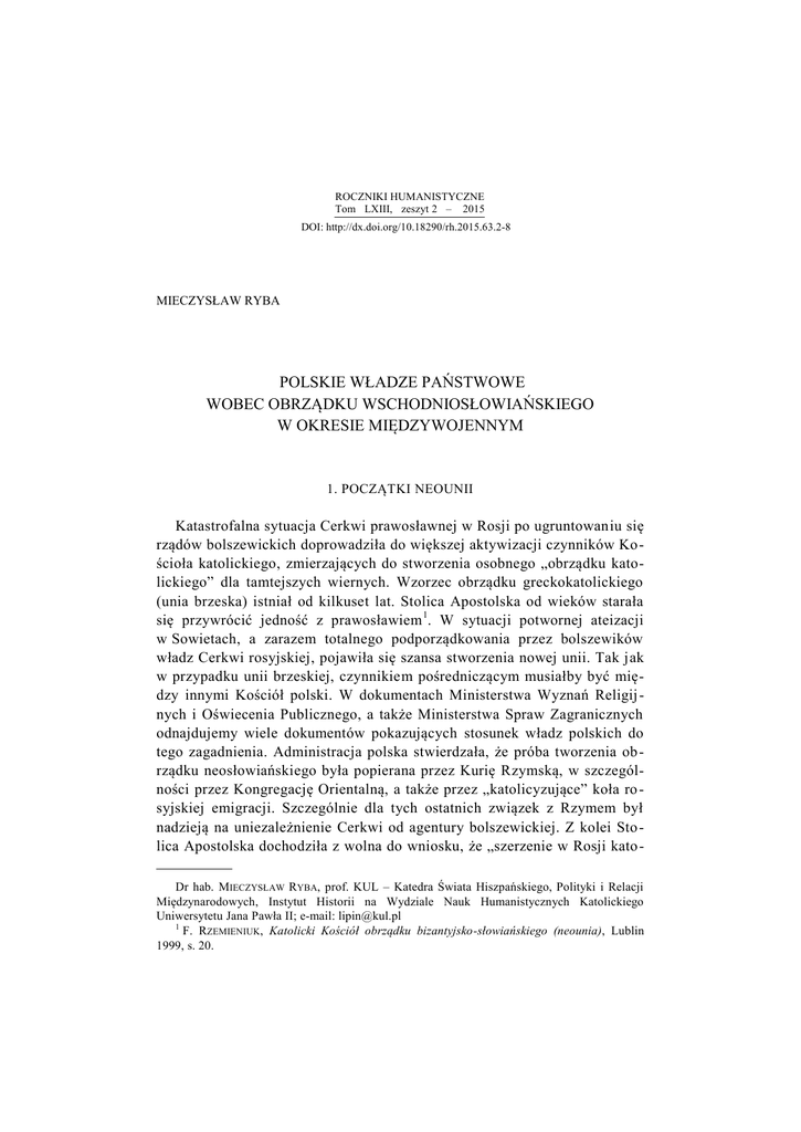 ROCZNIKI HUMANISTYCZNE Tom LXIII, zeszyt 2 – 2015 DOI: http://dx.doi.org/10.18290/rh.2015.63.2-8 MIECZYSŁAW RYBA * POLSKIE WŁADZE PAŃSTWOWE WOBEC OBRZĄDKU WSCHODNIOSŁOWIAŃSKIEGO W OKRESIE MIĘDZYWOJENNYM 1. POCZĄTKI NEOUNII Katastrofalna sytuacja Cerkwi prawosławnej w Rosji po ugruntowaniu się rządów bolszewickich doprowadziła do większej aktywizacji czynników Kościoła katolickiego, zmierzających do stworzenia osobnego „obrządku katolickiego” dla tamtejszych wiernych. Wzorzec obrządku greckokatolickiego (unia brzeska) istniał od kilkuset lat. Stolica Apostolska od wieków starała się przywrócić jedność z prawosławiem 1. W sytuacji potwornej ateizacji w Sowietach, a zarazem totalnego podporządkowania przez bolszewików władz Cerkwi rosyjskiej, pojawiła się szansa stworzenia nowej unii. Tak jak w przypadku unii brzeskiej, czynnikiem pośredniczącym musiałby być między innymi Kościół polski. W dokumentach Ministerstwa Wyznań Religij nych i Oświecenia Publicznego, a także Ministerstwa Spraw Zagranicznych odnajdujemy wiele dokumentów pokazujących stosunek władz polskich do tego zagadnienia. Administracja polska stwierdzała, że próba tworzenia ob rządku neosłowiańskiego była popierana przez Kurię Rzymską, w szczególności przez Kongregację Orientalną, a także przez „katolicyzujące” koła ro syjskiej emigracji. Szczególnie dla tych ostatnich związek z Rzymem był nadzieją na uniezależnienie Cerkwi od agentury bolszewickiej. Z kolei Sto lica Apostolska dochodziła z wolna do wniosku, że „szerzenie w Rosji kato Dr hab. MIECZYSŁAW RYBA, prof. KUL – Katedra Świata Hiszpańskiego, Polityki i Relacji Międzynarodowych, Instytut Historii na Wydziale Nauk Humanistycznych Katolickiego Uniwersytetu Jana Pawła II; e-mail: [email protected] 1 F. RZEMIENIUK, Katolicki Kościół obrządku bizantyjsko-słowiańskiego (neounia), Lublin 1999, s. 20. 178 MIECZYSŁAW RYBA licyzmu w jego łacińskiej formie, nie rokuje […] istotnego powodzenia”. Szczególnie katolicyzujące koła rosyjskie głosiły przekonanie o potrzebie stworzenia obrządku w formie orientalnej, jedynie zrozumiałej dla szerokich mas ludowych i dla orientalnego kleru 2. W tej sytuacji działania Polaków zmierzające do „łacińskiej katolicyzacji” Rosji nie spotykały się z uznaniem w Kurii Rzymskiej, gdyż uznawano te działania za z gruntu nieskuteczne. Polskie poselstwo w Rzymie z niepokojem diagnozowało, że katolicyzujące środowiska rosyjskie starały się z początkiem lat dwudziestych pokazywać potrzebę stworzenia obrządku neosłowiańskiego niejako w opozycji katoli cyzmu polskiego, mającego ściśle łaciński wymiar. „Toteż – pisano – katolicki obrządek wschodni nie będzie czynnikiem zgody między polskim a ro syjskim narodem” 3. Dostrzegano też, że Stolica Apostolska akceptowała w przeszłości różne obrządki wschodnie, godząc się na zachowanie odmien ności etniczno-kulturowych poszczególnych rytów (koptyjski, etiopski, syryjski itp.). Choć w obszernym dokumencie MSZ zauważono, że w Rosji od czasu do czasu pojawiały się niezbyt silne tendencje do zbliżenia z Rzy mem, to „te dążności w stronę Rzymu nigdy nie były skutkiem wpływów polskich” 4. Pewna intensyfikacja działań zmierzająca do złączenia z Rzymem pojawiła się w kręgach rosyjskich po 1905 r., po ukazaniu się manifestu tolerancyjnego. Wśród krewnych ministra Piotra Stołypina (Natalia Uszakow) zgromadziło się w Petersburgu środowisko katolickich konwertytów. W żywym kontakcie z tymi kręgami pozostawał metropolita grekokatolicki Andrzej Szeptycki, który 26 czerwca 1907 r. mianował ks. Aleksandra Zierczaninowa generalnym wikariuszem nowego, wschodniego obrządku. Wszystko to formalnie zaakceptował papież Pius X dnia 1 lutego 1908 r. 5 Jak podawało w swoim tajnym sprawozdaniu MSZ, to właśnie metropolita Szeptycki miał watykańskie, tajne pełnomocnictwo do opieki nad tym nowo 2 Archiwum Akt Nowych [dalej cyt.: AAN], Ministerstwo Wyznań Religijnych i Oświecenia Publicznego, Referat Wyznań Katolickich, Ogólne sprawy wyznania katolickiego, Obrządek wsch. słowiański (bizantyjski): normatywy, ogólne inform., odpisy ważniejszych spraw, 1923 1938, sygn. 416 (mikrof. 9410), k. 9-10; por. E.H. WYCZAWSKI, Neounia, w: Historia Kościoła w Polsce, t. II, cz. 2, Poznań–Warszawa 1979, s. 85. 3 AAN, Ministerstwo Wyznań Religijnych i Oświecenia Publicznego, Referat Wyznań Katolickich, Ogólne sprawy wyznania katolickiego, Obrządek wsch. słowiański (bizantyjski): normatywy, ogólne inform., odpisy ważniejszych spraw, 1923-1938, sygn. 416 (mikrof. 9410), k. 11. Takie stanowisko było deklarowane przez polskie środowiska polityczne niemalże od samego początku nieodległości. Por. Biblioteka Katolickiego Uniwersytetu Lubelskiego, Archi wum Jana Steckiego, sygn. 553, k. 22-23. 4 Tamże, k. 12. 5 Tamże, k. 13. POLSKIE WŁADZE PAŃSTWOWE WOBEC OBRZĄDKU WSCHODNIOSŁOWIAŃSKIEGO 179 powstałym obrządkiem, co miało znaleźć ślad w tajnym archiwum Kongregacji Orientalnej6. Biskup Szeptycki dostał rozległe pełnomocnictwa do zarządzania wszystkimi dawnymi diecezjami unijnymi z czasów I Rzeczpospolitej 7. Ponieważ uprawnienia te zostały utrzymane w mocy również po odrodzeniu Rzeczpospolitej, pojawiał się niepokój władz RP, zważywszy na liczne sporne kwestie między „proukraińskim” metropolitą lwowskim a czynnikami polskimi 8. Obawiano się, że tak jak z biegiem dziejów Kościół polski stracił kontrolę nad grekokatolikami po unii brzeskiej, tak też się stanie w przypadku obrządku neosłowiańskiego. Watykan, zdaniem polskich czynników rządowych, mógł zechcieć porozumiewać się z Rosjanami kosztem interesów polskich. Wybuch pierwszej wojny światowej pogorszył sytuację petersburskich katolickich konwertytów. Zamknięta została wcześniej otwarta przez nich kaplica Świętego Ducha, zm