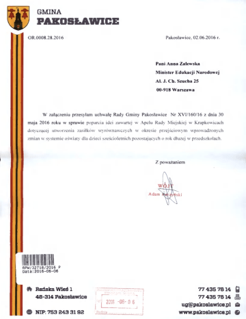 GMINA PAKOSŁAWICE Pakosławice. 02.06.2016 r. OR.0008.28.2016 Pani Anna Zalewska Minister Edukacji Narodowej Al. J . Ch. Szucha 25 00-918 Warszawa W załączeniu przesyłam ucłiwałę Rady Gminy Pakosławice Nr XVI/160/16 z dnia 30 maja 2016 roku w sprawie poparcia idei zawartej w Apelu Rad> Miejskiej w Krapkowicach di>i>c/4cej utworzenia zasiłków v\Arównawcz\cłi w okresie przejściowym wprowadzonych /mian w s\ stemie oświat\ dla dzieci sześcioletnich pozostających o rok dłużej w przedszkolach. Z poważaniem Adam RPW/32718/2016 P Data:2016-06-06 9t Reńska Wieś 1 4B-314 FaJcDsławice O NIP: 753 243 31 92 !.U.';iSTEB5TV.'0 EDUKAGI iiAKODCAl KA?jCELARIAGŁÓV;2iA 2016 -06- O 6 Podpis I 77 435 7B14 77 435 7B14 [email protected] A www.pakoslawice.pl O RADA GMINY PAKOSŁAWICE UCHWAŁA NRXVI/160/16 RADY GMINY PAKOSŁAWICE z dnia 30 maja 2016 r. w sprawie poparcia idei zawartej w Apelu Rady Miejskiej w Krapkowicach dotyczącej utworzenia zasiłków wyrównawczych w okresie przejściowym wprowadzonych zmian w systemie oświaty dla dzieci sześcioletnich pozostających o rok dłużej w przedszkolach Na podstawie art. 18 ust.l ustawy z dnia z dnia 8 marca 1990 r. o samorządzie gminnym (Dz. U. z 2016 r. poz. 446) uchwala się, co następuje: § 1. Popiera się ideę zawartą w Apelu Rady Miejskiej w Krapkowicach dotyczącą utworzenia zasiłków wyrównawczych w okresie przejściowym wprowadzonych zmian w systemie oświaty dla dzieci sześciolemich pozostających o rok dłużej w przedszkolach, określonego uchwałą Nr XIV/186/2016 Rady Miejskiej w Krapkowicach z dnia 25 lutego 2016 roku. §2. Uchwałę przekazuje się: 1) Prezesowi Rady Ministrów; 2) Ministrowi Edukacji Narodowej; 3) Marszałkowi Sejmu RP; 4) Marszałkowi Senatu RP. §3. Wykonanie uchwały powierza się Wójtowi Gminy Pakosławice. §4. Uchwała wchodzi w życie z dniem podjęcia. PRZEWO^^ZĄC¥^ADY UCHWAŁA NR XIV/186/2016 RADY M I E J S K I E J W KRAPKOWICACH z dnia 25 lutego 2016 r. w sprawie: przyjęcia „Apelu Rady Miejskiej w Krapkowicach do Pani Beaty Szydło Prezesa Rady Ministrów oraz Pani Anny Zalewskiej Ministra Edukacji Narodowej w sprawie utworzenia zasiłków ' wyrównawczycłi w okresie przejściowym wprowadzonych zmian w systemie oświaty dla dzieci sześcioletnich pozostających rok dłużej w przedszkolach". Na podstawie art. 18 ust. 1 ustawy z dnia 8 marca 1990 r. o samorządzie gminnym (Dz. U . z 2015 r , poz. 1515) oraz § 25 ust. 2 lit. c) Statutu Gminy Krapkowice z dnia 27 listopada 2002 r. Rada Miejska w Krapkowicach uchwala, co następuje: § 1. Przyjmuje się ,,Apel Rady Miejskiej w Krapkowicach do Pani Beaty Szydło Prezesa Rady Ministrów oraz Pani Anny Zalewskiej Ministra Edukacji Narodowej w sprawie utworzenia zasiłków w y r ó w n a w c ^ c h w okresie przejściowym uprowadzonych zmian w systemie oświaty, dla dzieci sześcioletnich pozostających rok dłużej w przedszkolach", stanowiący załącznik do niniejszej uchwały. § 2. Apel, o którym mowa w § 1, przekazuje się: 1) Prezesowi Rady Ministrów; 2) Ministrowi Edukacji Narodowej; 3) Marszałkowi Sejmu RP; 4) Marszałkowi Senatu RP; 5) Posłom i Senatorom Województwa Opolskiego; 6) Wojewodzie Opolskiemu; 1) Opolskiemu Kuratorowi Oświaty; 8) Samorządom gminnym z obszaru województwa opolskiego. § 3. Wykonanie uchwały powierza się Przewodniczącemu Rady Miejskiej w Krapkowicach. § 4. Uchwała wchodzi w życie z dniem podjęcia i podlega ogłoszeniu w Biuletynie Informacji Publicznej Urzędu Miasta i Gminy w Krapkowicach. na tablicach ogłoszeń oraz Przewodniczący Rady Miejskiej Andrzej Mattciewicz Id: F192DAED-0ABE-4387-B933-753AF65668A9. Podpisany Strona Załącznik do Uchwały Nr XIV/186/2016 Rady Miejskiej w Krapkowicacłi z dnia 25 lutego 2016 r. Apel Rady Miejskiej w Krapkowicach do Pani Beaty Szydło Prezesa Rady Ministrów oraz Pani Anny Zalewskiej Ministra Edukacji Narodowej w sprawie utworzenia zasiłków wyrównawczych w olu'esie przejściowym wprowadzonych zmian w systemie oświaty dla dzieci sześcioletnich pozostających rok dłużej w przedszkolach W związku ze zmianami w ustawy z dnia 29 grudnia 2015 2016, poz. 35), Rada Miejska przejściowym wprowadzonych przedszkolach. systemie oświaty, które weszły w życie na podstawie art. I pkt 4 oraz pkt 5 r. o zmianie ustawy o systemie oświaty oraz niektórych innych ustaw ( Dz.U. w Krapkowicach apeluje o utworzenie zasiłków wyrównawczych w okresie zmian w systemie oświaty, dla dzieci sześciolemich pozostających rok dłużej w Zmiana w systemie oświaty polegająca na podwyższeniu wieku obowiązku szkolnego spowoduje problemy finansowe i organizacyjne w środowisku lokalnym. Rada Miejska w ICrapkowicach uważa, że koszty związane z wprowadzeniem zmian powinny być pokryte wyłącznie z budżetu państwa w formie przejściowego zasiłku wyrównawczego. Scedowanie tych kosztów na samorządy spowoduje pogrążenie się gminnych struktur oświatowych w problemach finansowych, co odbije się koniecznością wstrzymania inwestycji lub pilnych remontów w placówkach oświatowych. Skutki konieczności finansowania przez samorządy wprowadzonych przez rząd zmian dotknęłyby niestety dzieci. Zasiłek wyrównawczy, który jest przedmiotem niniejszego apelu powinien zostać udaelony w wysokości 3992 zł na każde dziecko i być równy różnicy pomiędzy subwencją oświatową dla dzieci szkolnych wynoszącą w 2016 r. 5362 zł a dotacją dla dzieci przedszkolnych, która w 2016 r. wynosi 1370 zł. W 2015 roku stworzyliśmy w gmiriie Krapkowice bardzo dobre warunki opieki przedszkolnej, przyjmując nic tylko 4-, 5- i 6- latlci, ale także 3-latki i 2,5-latki. Zmiany dotyczące 6-latków spowodują zmniejszenie liczby miejsc w przedszkolach dla dzieci najmłodszych. Zmiana systemu ośwjaty, która dała rodiicom sześcioletnich dzieci możliwość pozostawienia ich rok dłużej w przedszkolu, spowodow^a utratę prognozowanej wysokości subwencji oświatow