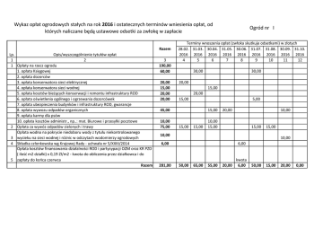 Wykaz opłat ogrodowych stałych na rok 2016 i ostatecznych terminów wniesienia opłat, od których naliczane będą ustawowe odsetki za zwłokę w zapłacie Razem Lp. Opis/wyszczególnienie tytułów opłat 1 2 1 Opłaty na rzecz ogrodu 1. opłata Księgowej 2. opłata dozorców 3. opłata konserwatora sieci elektrycznej 4. opłata konserwatora sieci wodnej 5. opłata kosztów bieżących konserwacji i remontu infrastruktury ROD 6. opłata oświetlenia ogólnego i ogrzewania dozorcówek 7. opłata ubezpieczenia budynków i infrastruktury ROD, gwarancje 8. opłata wywozu odpadów organicznych 9. opłata karmy dla psów 10. opłata kosztów administr., np..: mat. Biurowe i przesyłki pocztowe 2 Opłata za wywóz odpadów zielonych i trawy Opłata wodna na pokrycie niedoboru wody z tytułu niekontrolowanego 3 wycieku na sieci wodnej i różnic w odczytach wodomierzy ogrodowych 4 Składka członkowska wg Krajowej Rady - uchwała nr 5/XXIII/2014 Opłata kosztów finansowania działalności ROD i partycypacji OZM oraz KR PZD ( ilość m2 działki) x 0,19 Zł/m2 - kwota do obliczenia przez działkowca i do 5 zapłaty do końca czerwca Razem 3 190,00 60,00 20,00 15,00 20,00 20,00 Terminy wnoszenia opłat (zwłoka skutkuje odsetkami) w złotych 28.02. 31.03. 30.04. 31.05. 30.06. 31.07. 31.08. 30.09. 31.10. 2016 2016 2016 2016 2016 2016 2016 2016 2016 4 5 6 7 8 9 10 11 12 30,00 30,00 20,00 15,00 20,00 15,00 5,00 15,00 45,00 10,00 75,00 Ogród nr I 15,00 15,00 20,00 10,00 10,00 15,00 15,00 15,00 10,00 10,00 6,00 6,00 281,00 50,00 65,00 55,00 20,00 kwota 6,00 50,00 15,00 20,00 0,00